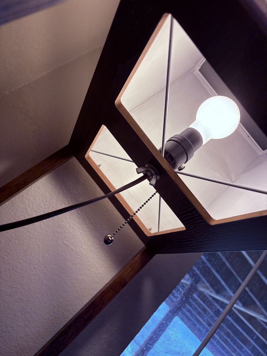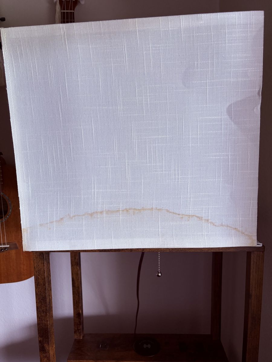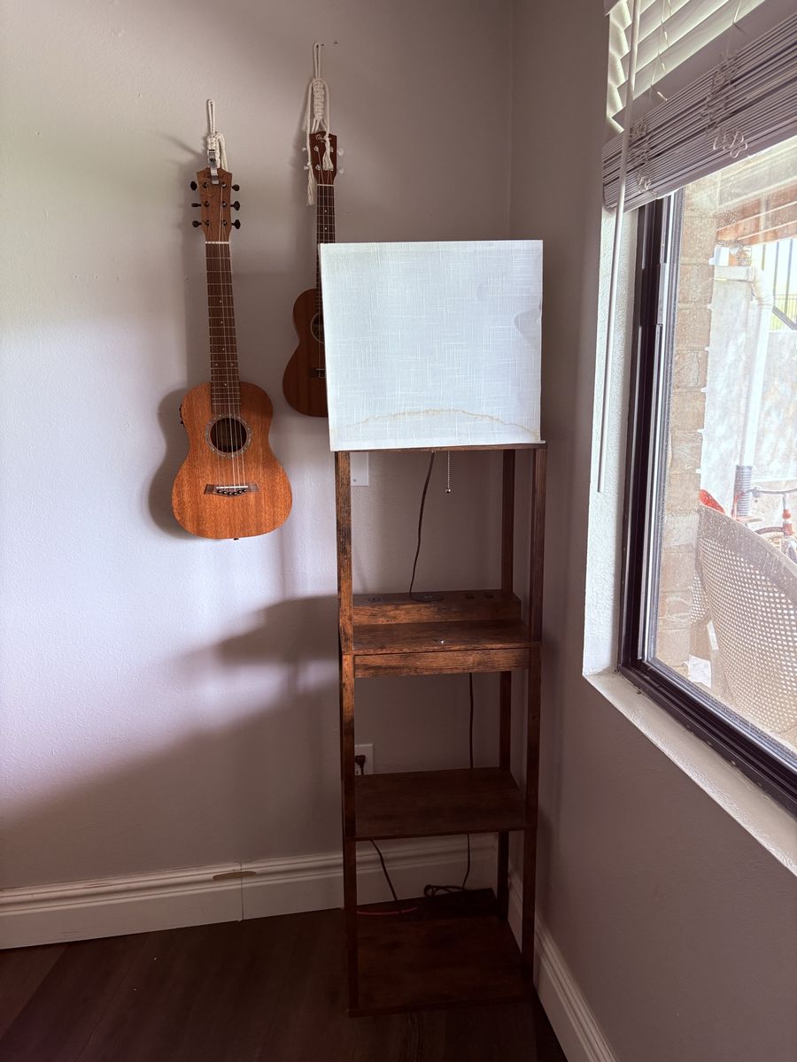 ZelleLamp and shelf with chargers and a small drawer. Some staining on the lamp shade I haven’t tried to get it out. Great condition.