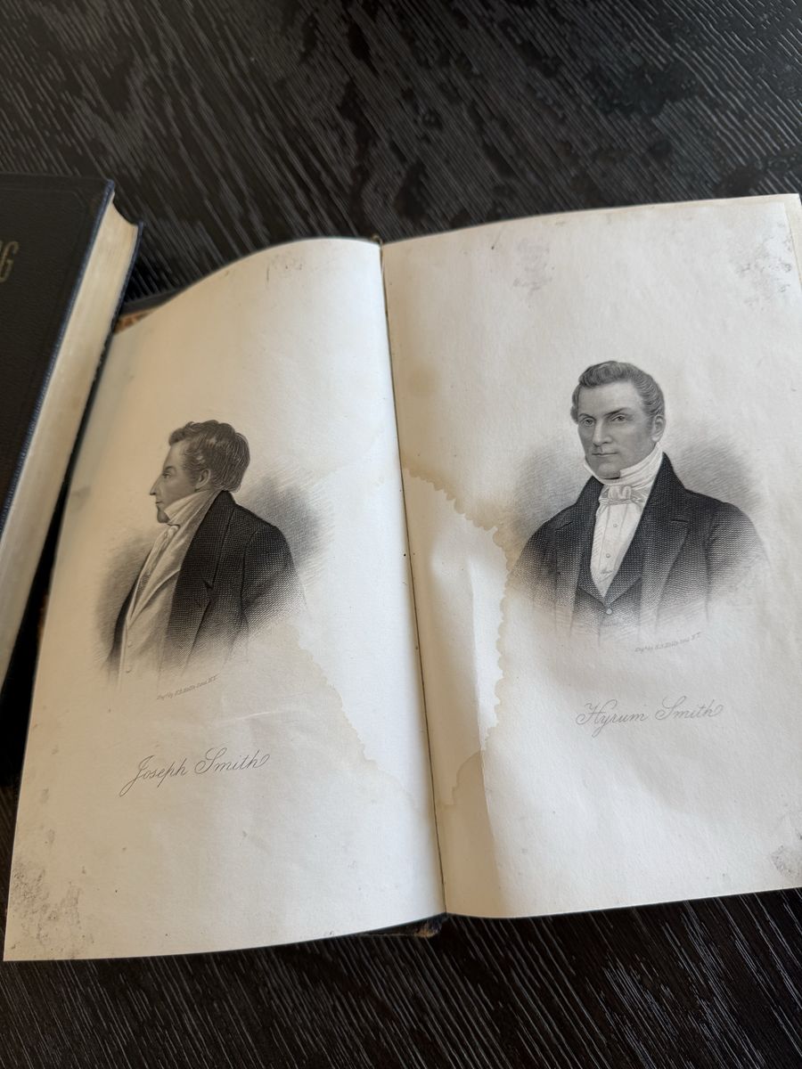 Handsomely bound in period 3/4 leather over pebbled cloth boards, the upper cover elaborately gilt-stamped with decorative title panel, the spine likewise gilt with ornamental devices. The volume retains its engraved portrait plates of Joseph and Hyrum Smith, complete, and is further enhanced by vivid marbled endpapers.