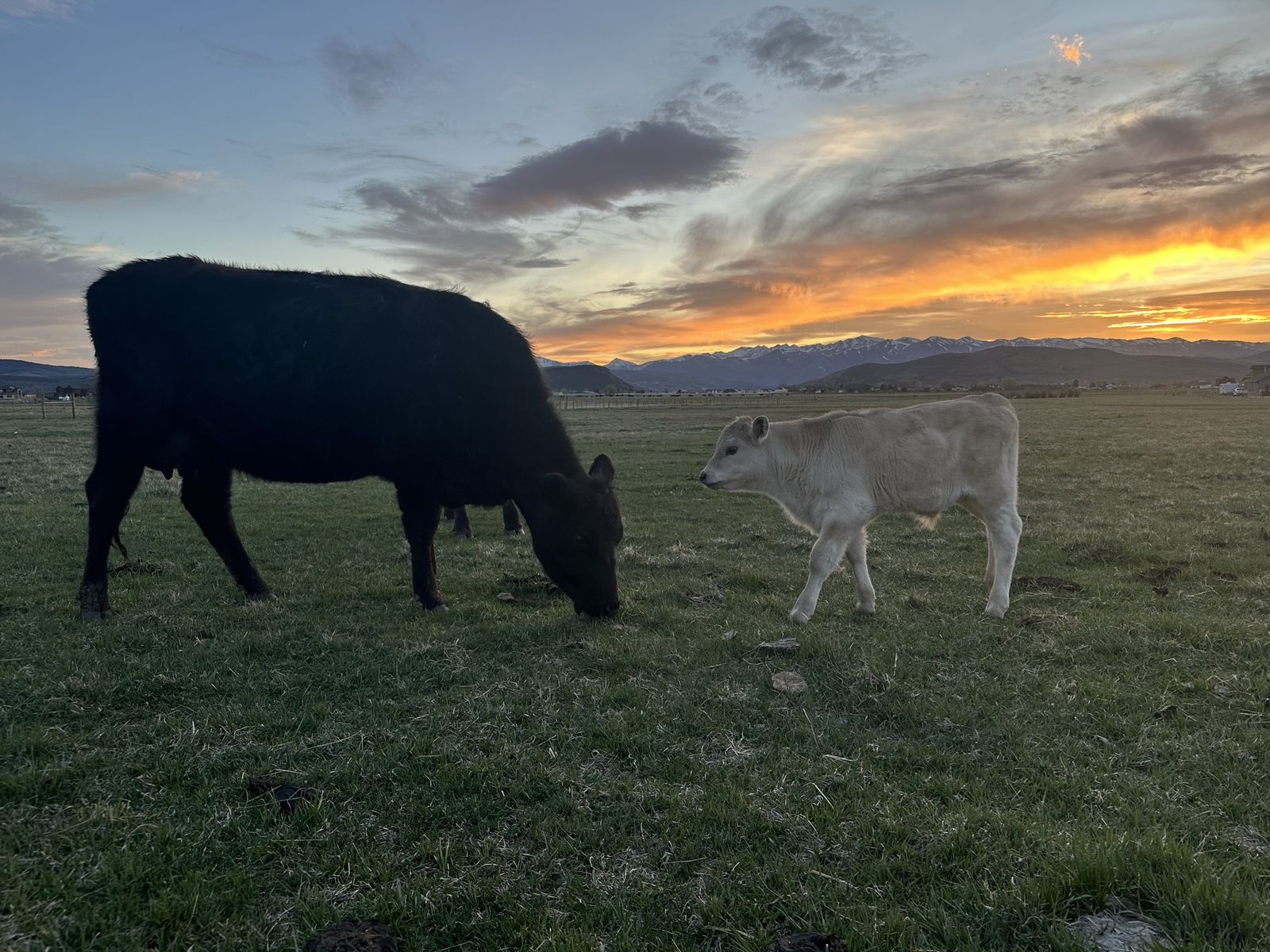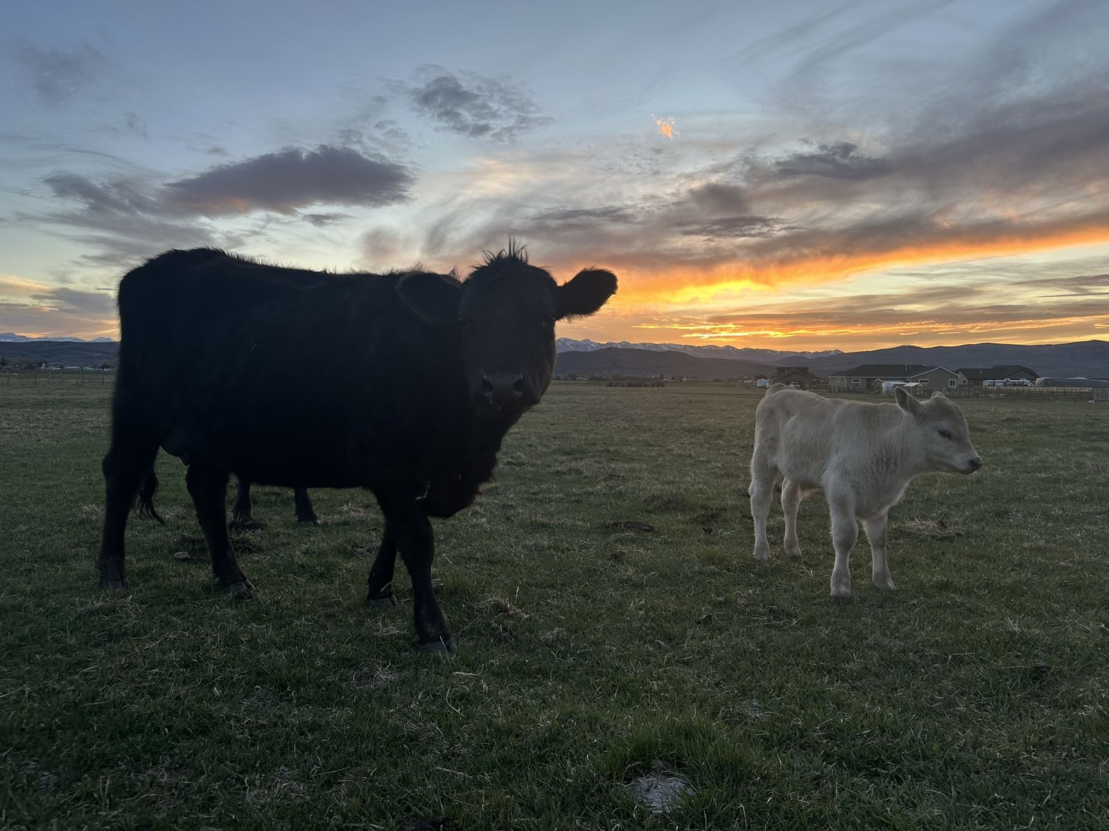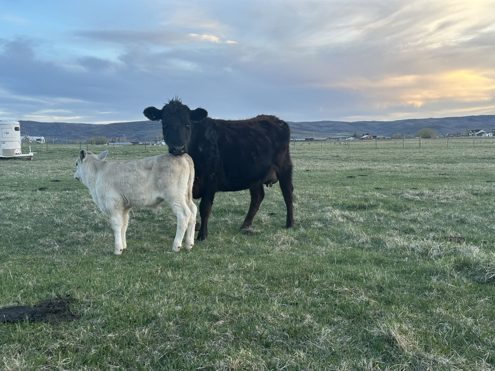 3 year old angus cross cow bred with a charolais bull for a mixed angus/charolais bull calf. Calf born on March 8