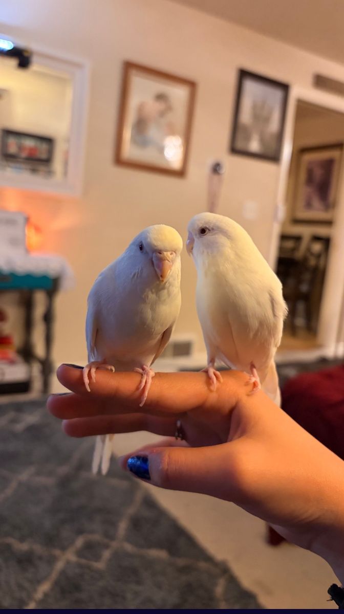 VenmoTwo albino parakeets, male and female, not related, They've been together since we got them in August of 2024. They where hatched in summer of 2024.