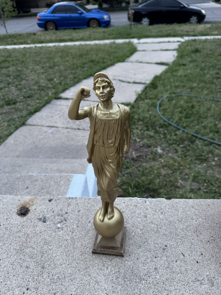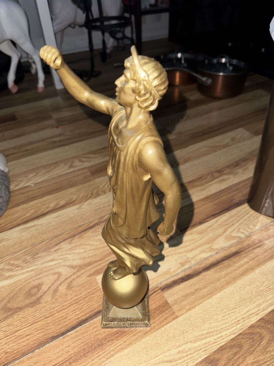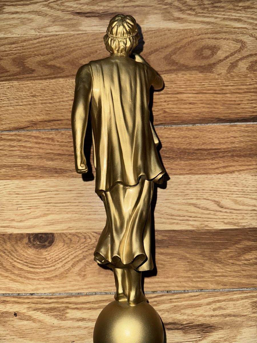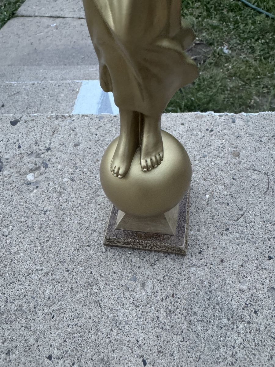 Angel Moroni LDS Temple Golden Statue (Male Mormon Figurine) 15" Tall Angel Moroni of The Church of Jesus Christ of Latter-day Saints, distinguished by its gold-leaf finish and its stance atop a sphere. It serves as a symbolic representation of the Restoration of the Gospel. The original design stands 15 inches in height. It is typically placed atop the tallest spire of the temples. $140 Cash only