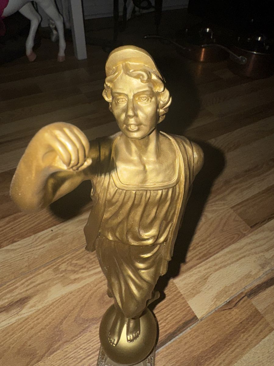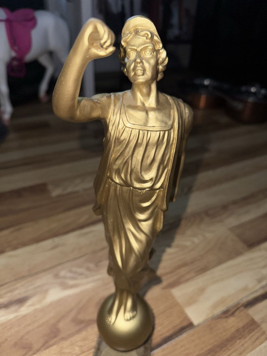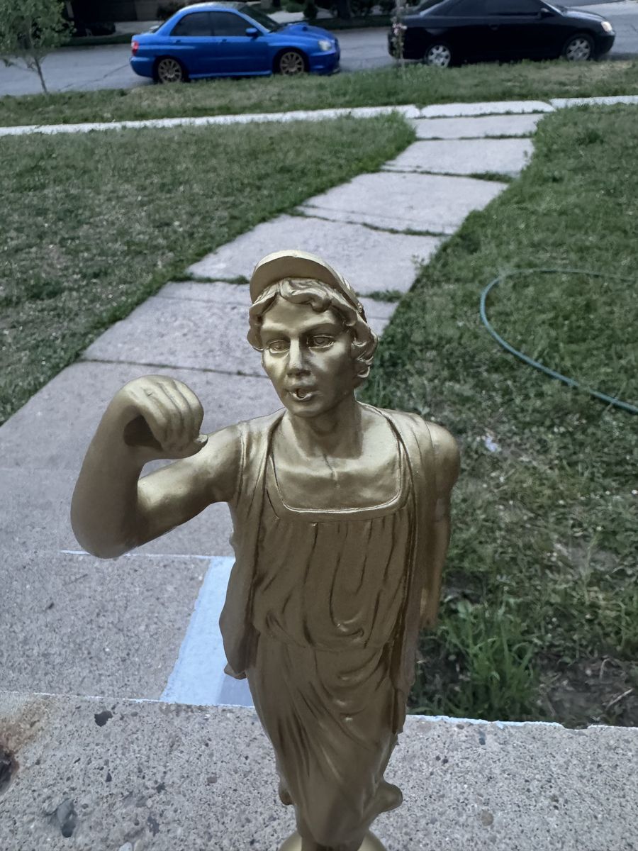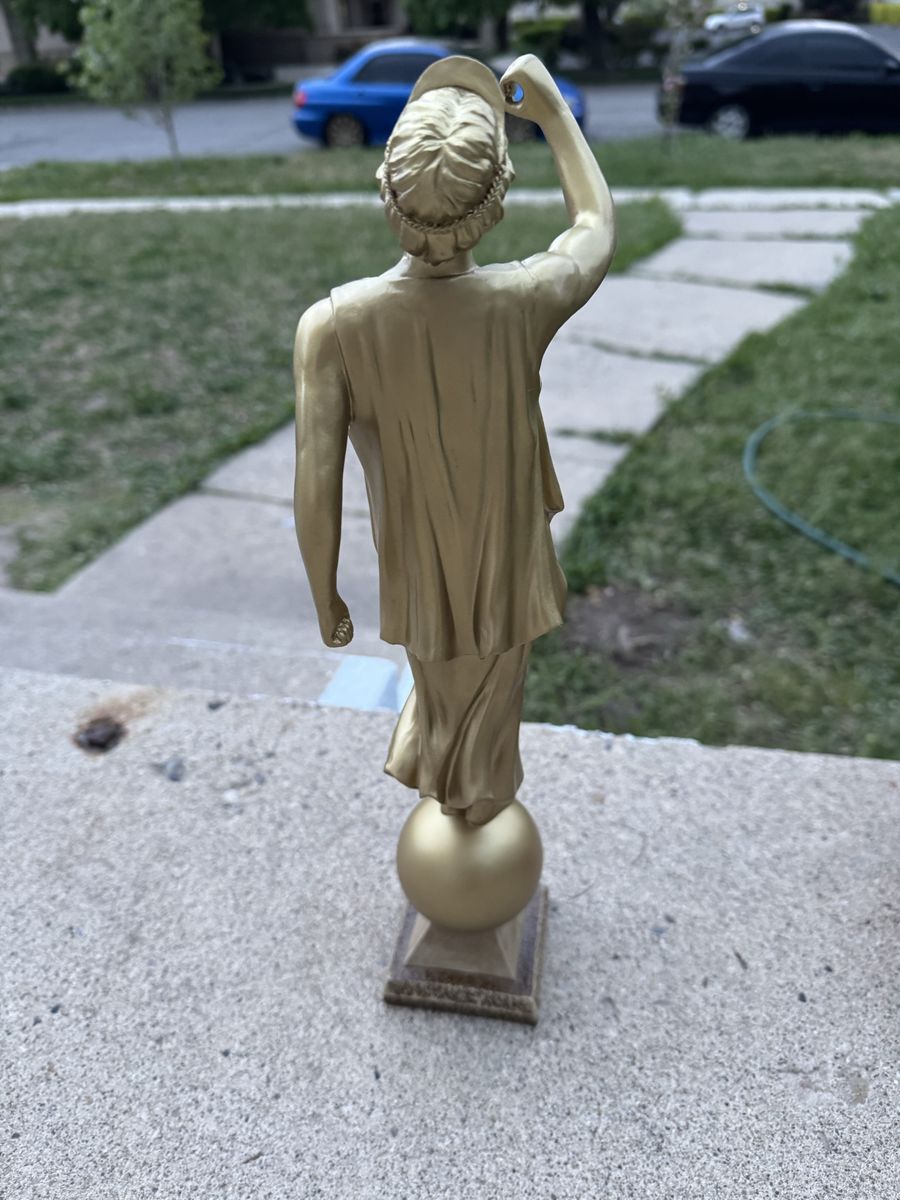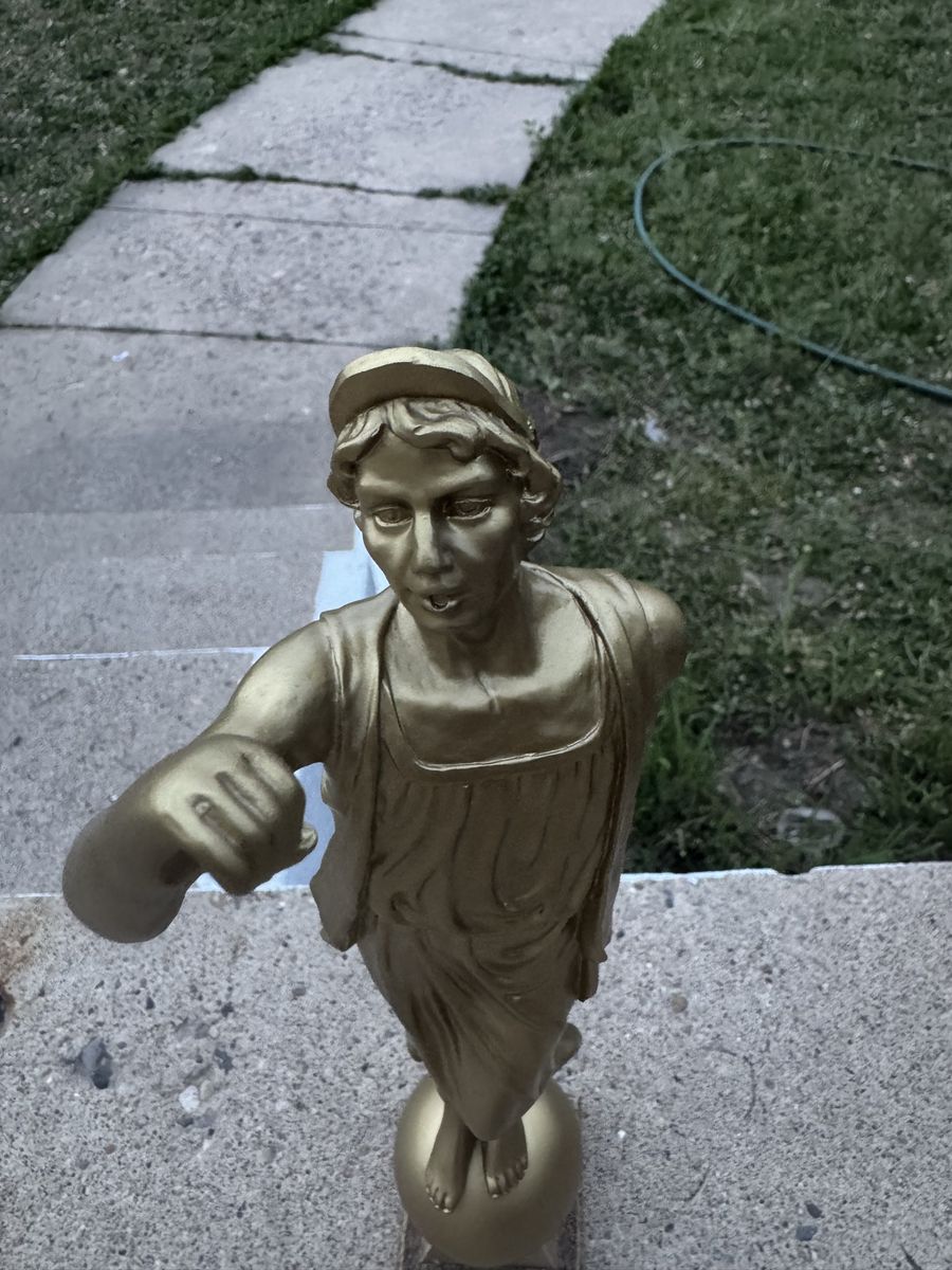 Angel Moroni LDS Temple Golden Statue (Male Mormon Figurine) 15" Tall Angel Moroni of The Church of Jesus Christ of Latter-day Saints, distinguished by its gold-leaf finish and its stance atop a sphere. It serves as a symbolic representation of the Restoration of the Gospel. The original design stands 15 inches in height. It is typically placed atop the tallest spire of the temples. $140 Cash only