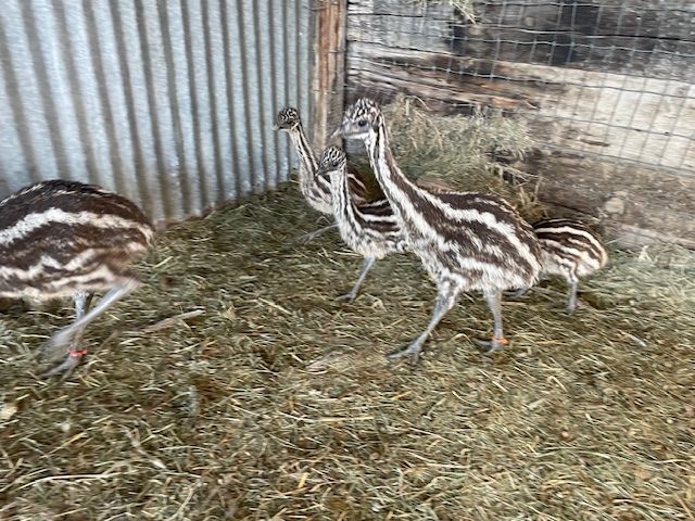 I have standard Emu chicks from two completely unrelated pairs. All my chicks have been naturally hatched by their fathers which is why I don't have chicks sooner in the season. I have found the chicks are healthier with no leg problems when I incubate the natural way, I could get 3 to 4 times as many chicks if I Incubated them myself. But I would rather have less but better chicks. I have been doing it this way for almost 30 years.