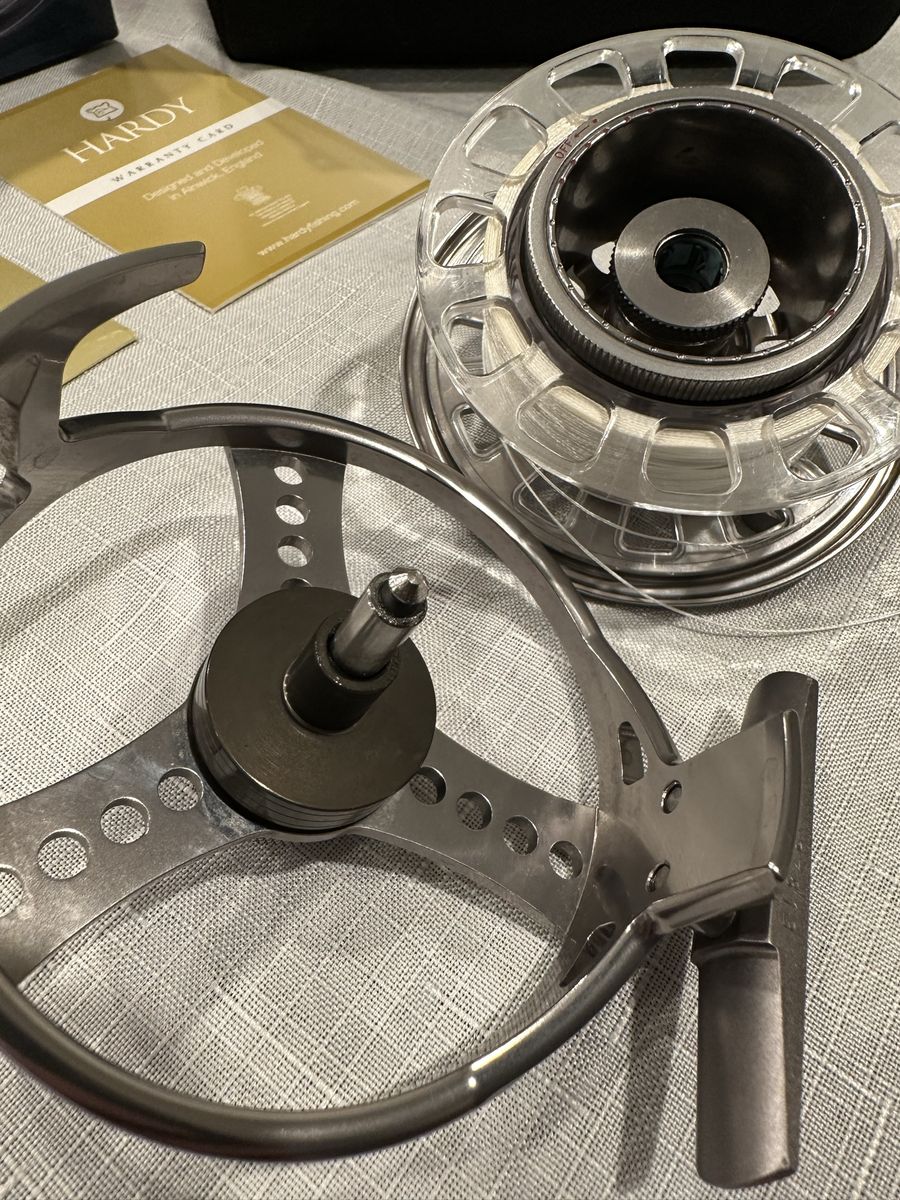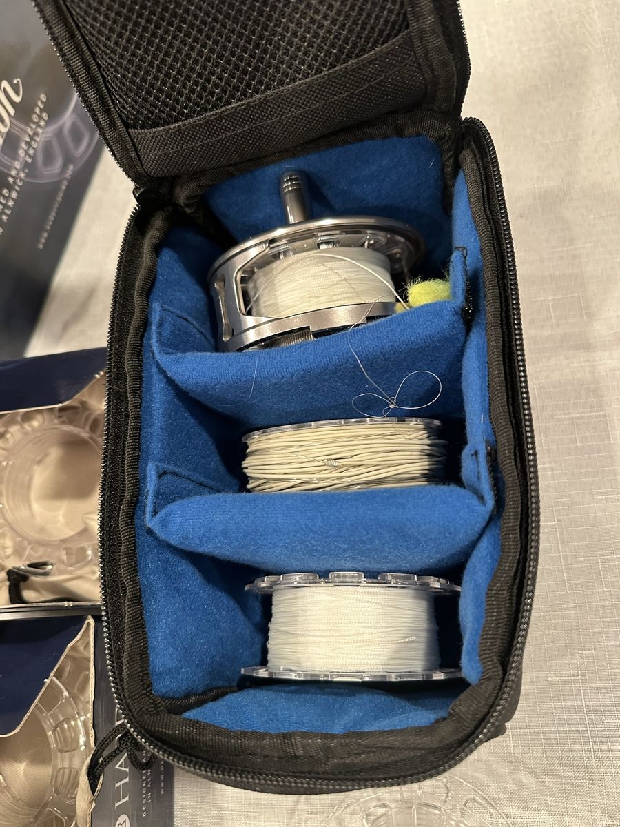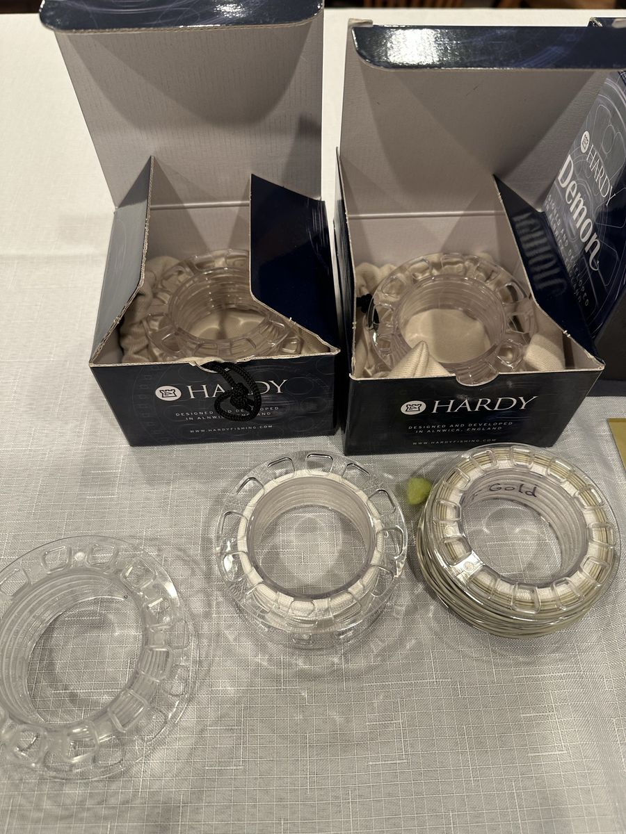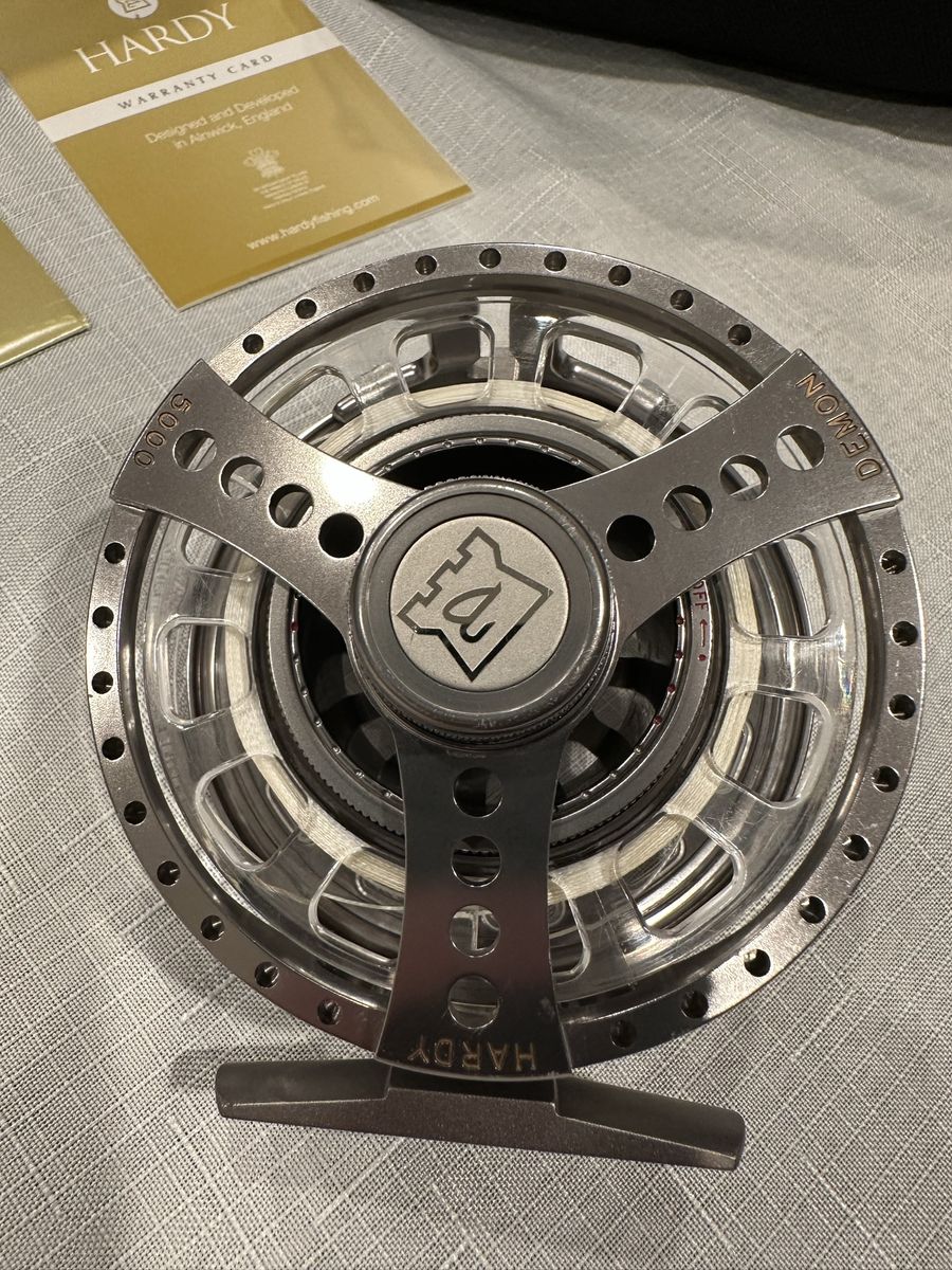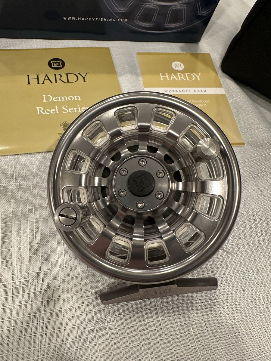 VenmoHardy Demon 5000 Fly Reel With a large arbor and sealed drag with multiple spool cassettes for quick line changes. It comes with 5 cassettes total, 2 of the cassettes are new in the box's. The original case a 6wt Rio Gold line and the original box are included. The reel is in excellent condition.