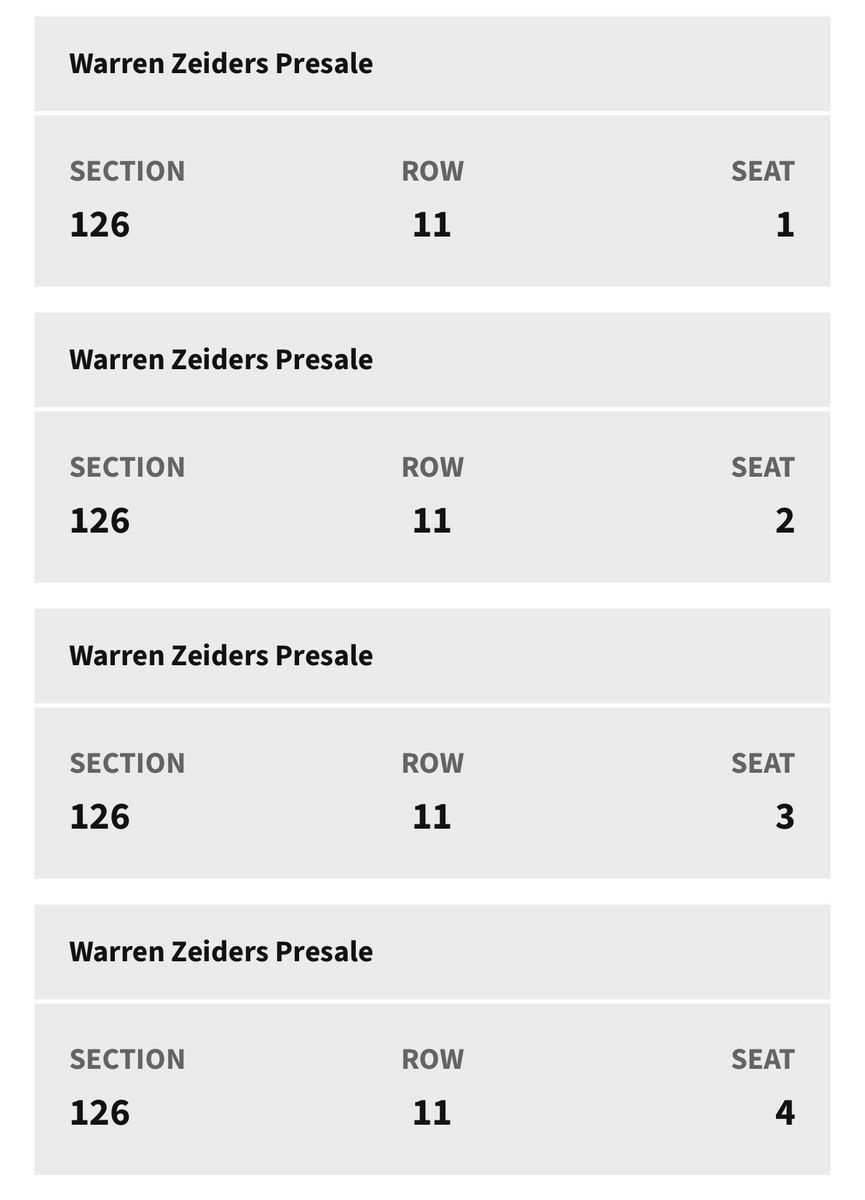 Venmo4 Tickets to Warren Zeiders on 4/15 - Paid $76 each so hoping to just get what we paid for them; OBO. Willing to split in pairs! Will transfer in Ticketmaster.
