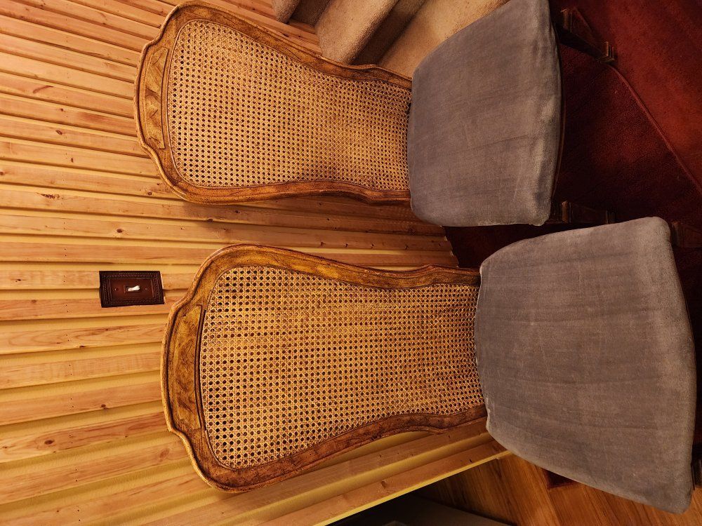 Absolute stunning set of Six vintage cane chairs. Reupholsterd with beautiful gray velvet plush fabric. Five standard chairs and one captains chair.