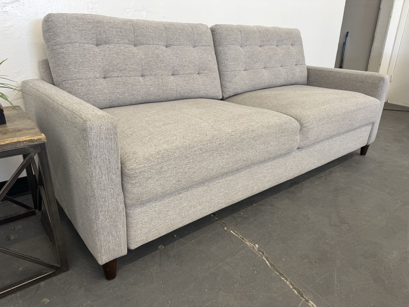 Features: Sofa Extends for a Lounge Option Modern Silhouette with a Mid-Century Feel Tufted Back Cushions Add Style and Comfort Tapered Legs in a Warm Brown Finish Upholstered in a Soft, Neutral 100% Polyester Fabric