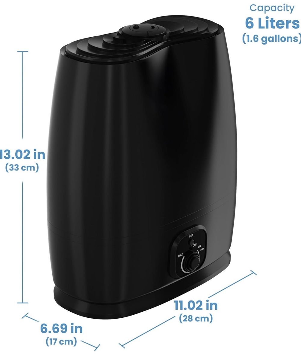 Venmo6L Humidifier. Measurements in photos. Works fine, I just ended up with a few too many for my plants and am paring down. Has some mineral build up from hard water that you can see in the photos.