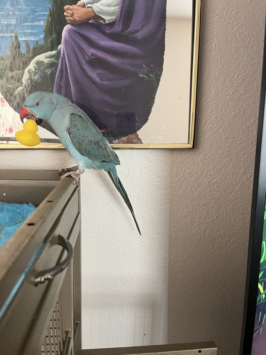 I have these two besties that I have to unfortunately give up, they are nice but obviously need to get to know you first. Blue bird talks a lot and is super protective with the green one. They love being outside their cage and getting into trouble, they also love human food. They will come with their cage and must take them together since they are bonded. Also must have experience with larger birds since they aren’t as easy as they look. SERIOUS BUYERS only. $1000 for everything!!!