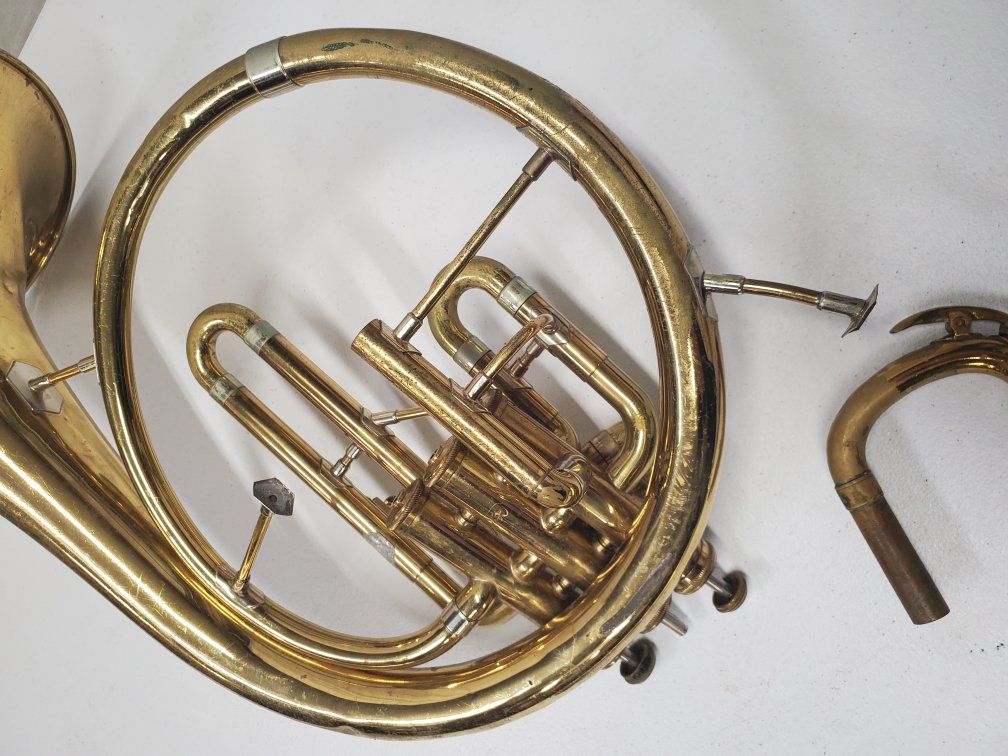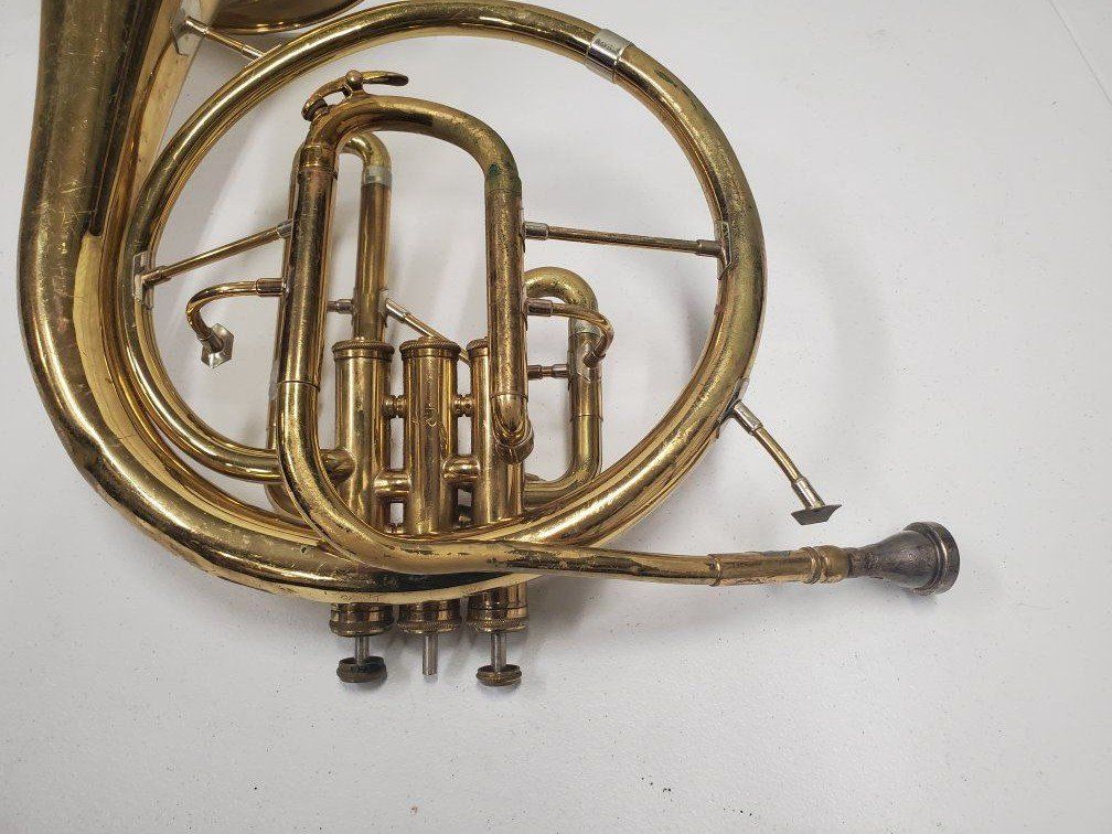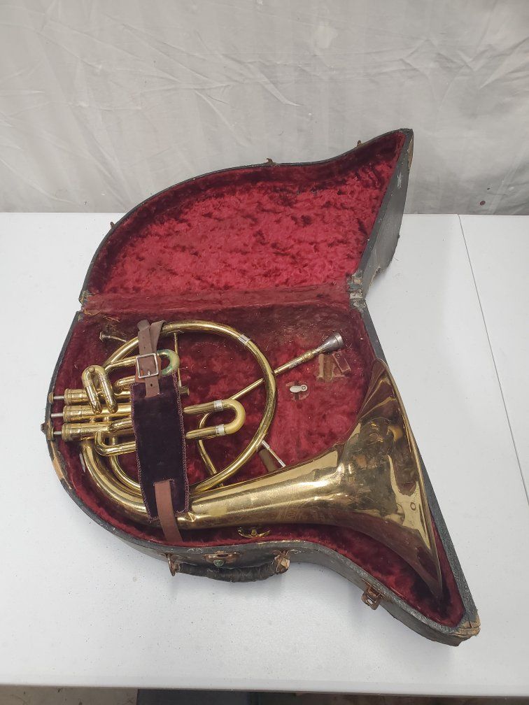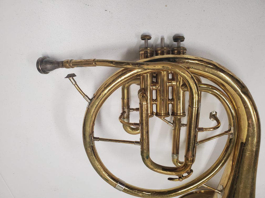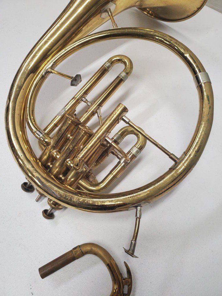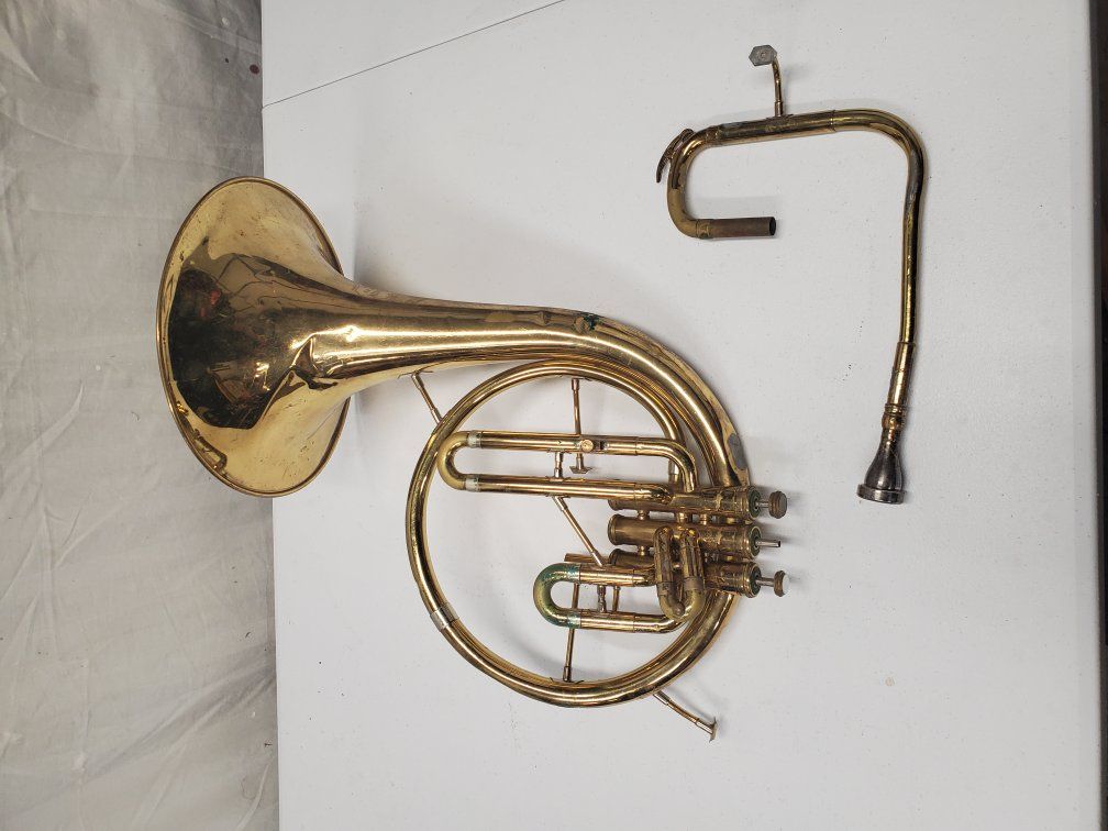 Venmo1954 Olds Ambassador french horn. Has damage, might be repairable, I don't know. My father used it as a decoration.