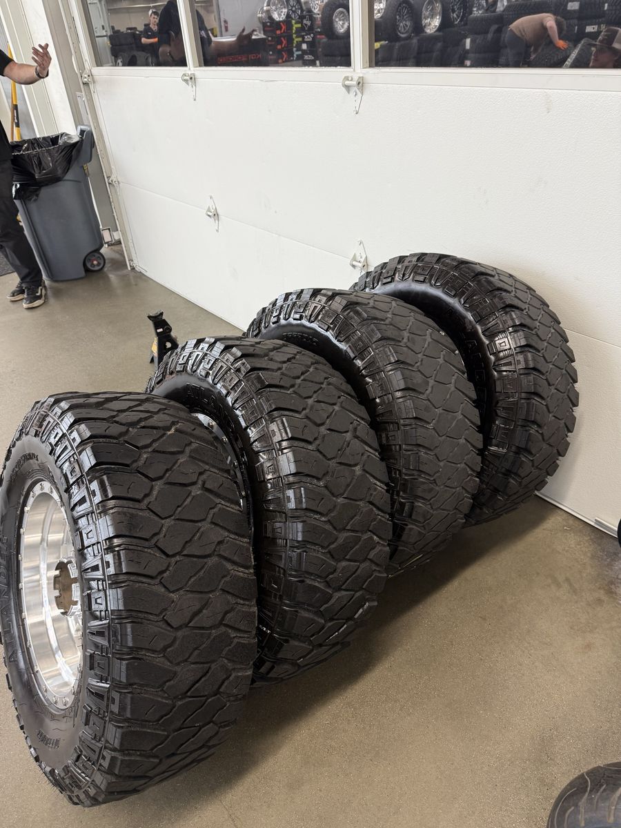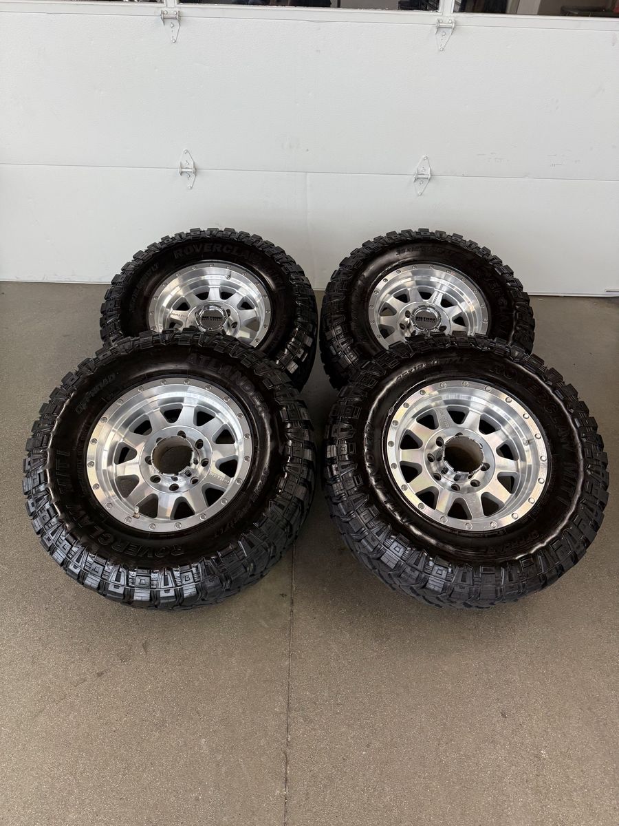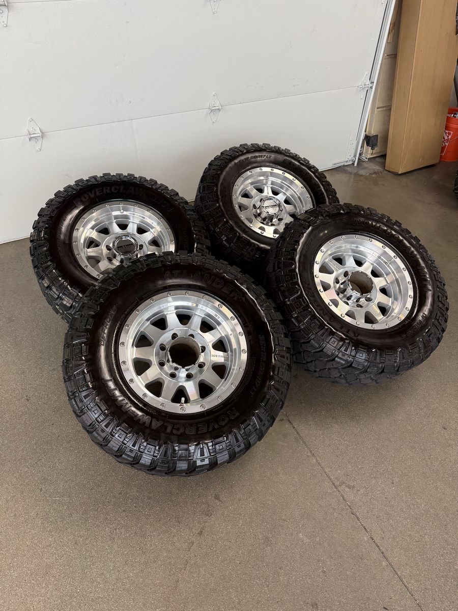 Wheels are 17x10, -12 offset, VERY RARE wheels. You can’t even get these wheels anymore. Great looking set of wheels, no curb rash, dings or major damage on them. Wheels are perfect shape. All of the center caps are also included and in great shape. Tires are 35x12.50r17 roverclaw m/t, load range E, all of the tires are in good shape, 2 have about 70% tread, 2 have less, light cupping, tires are in good shape.