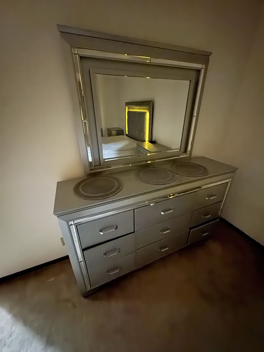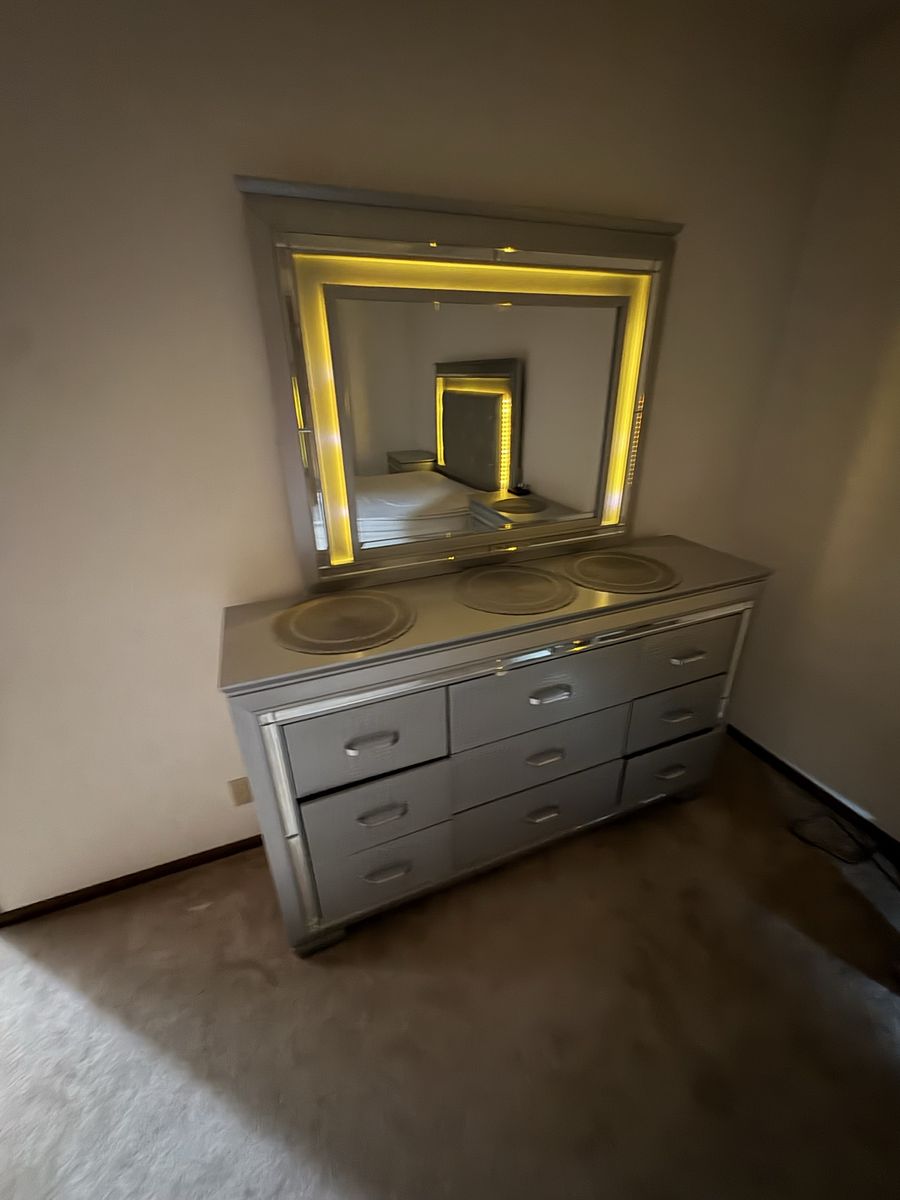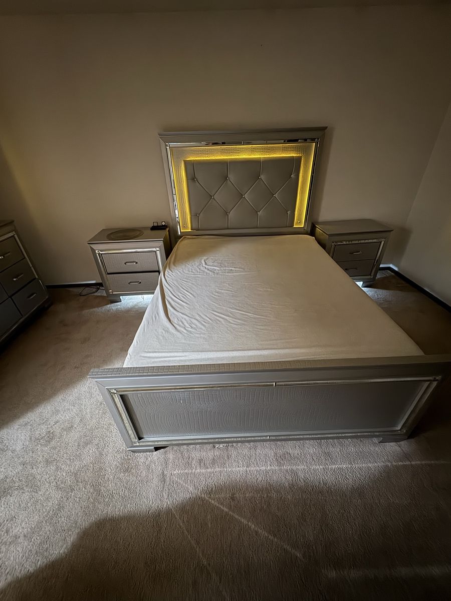Stylish gray bedroom set. Has a cool tufted headboard with built-in LED lights. Comes with the bed frame, two nightstands, and a big dresser with a mirror. All matching with mirrored accents. Great for a modern look. Comes with mattress, bed frame and everything you need for a bed/ complete room. The lights are so nice. Shoot me offers!