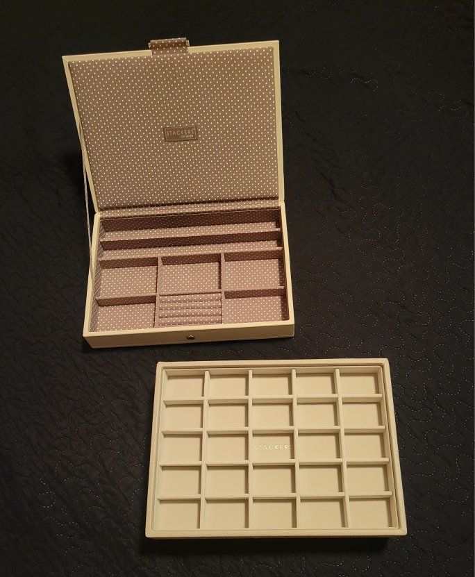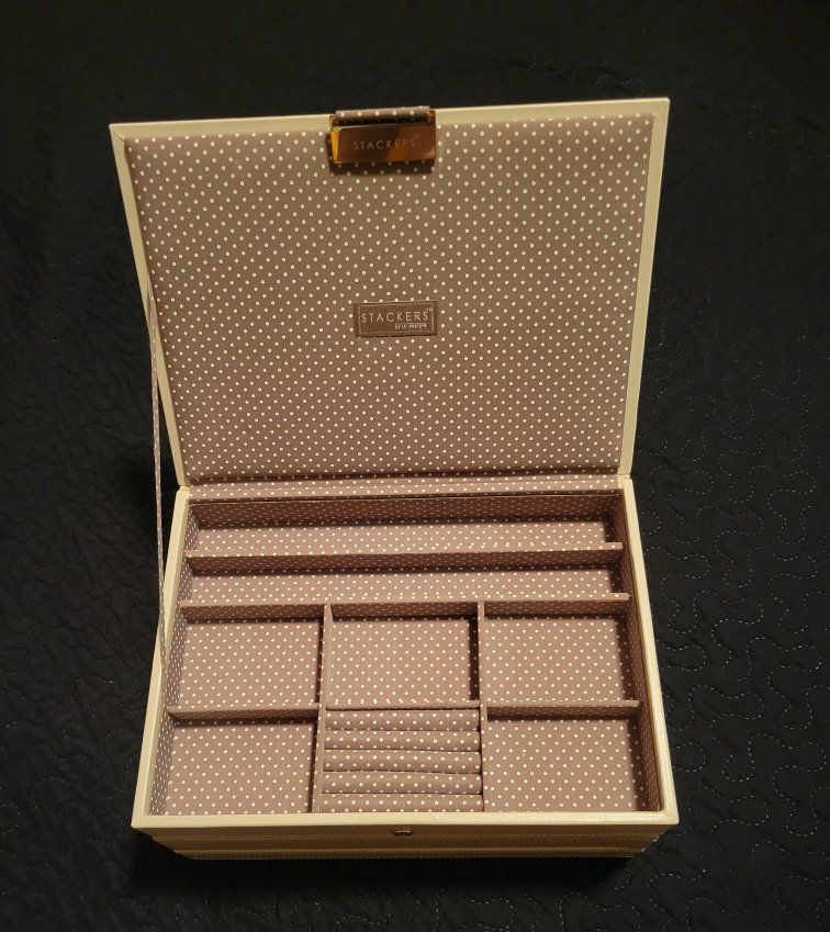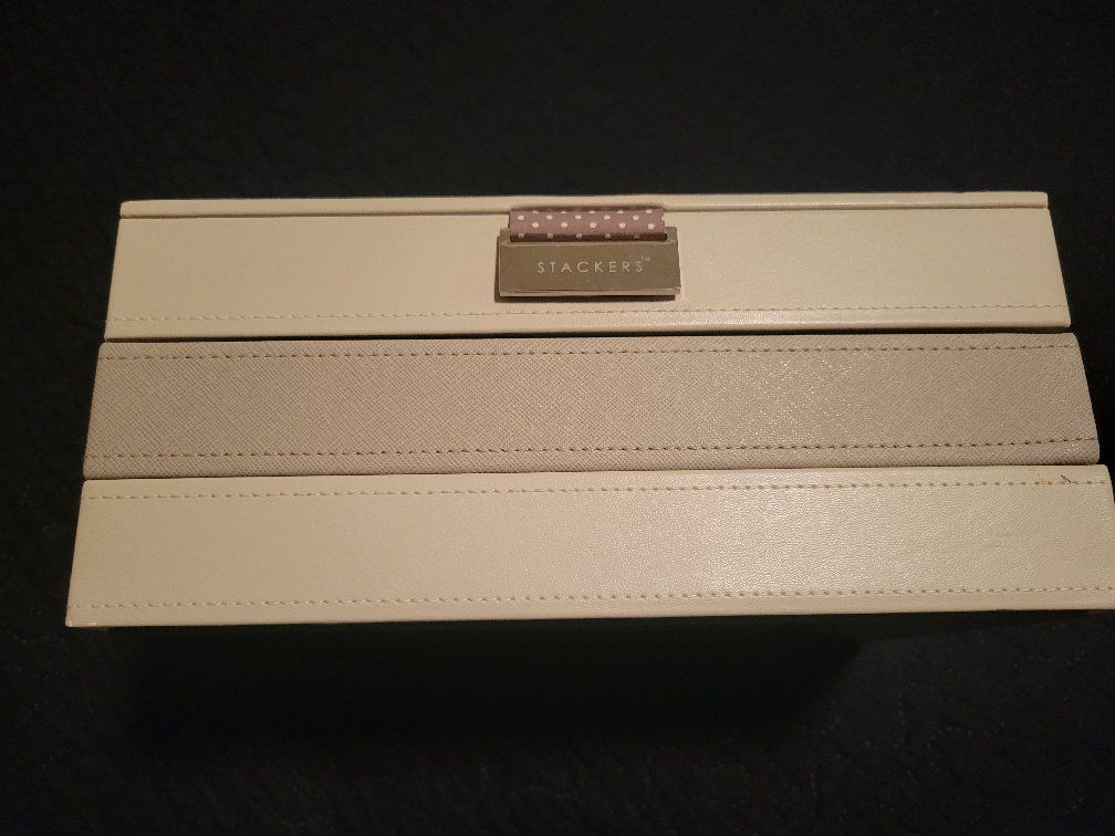 PayPalStackers 3‑Layer Magnetic Jewelry Box — $55 OBO Never been used Beautiful 3‑layer Stackers jewelry organizer in excellent condition. Includes the classic magnetic lid and two additional stackable trays — perfect for rings, earrings, necklaces, and small accessories. Neutral gray color with the signature polka‑dot lining.