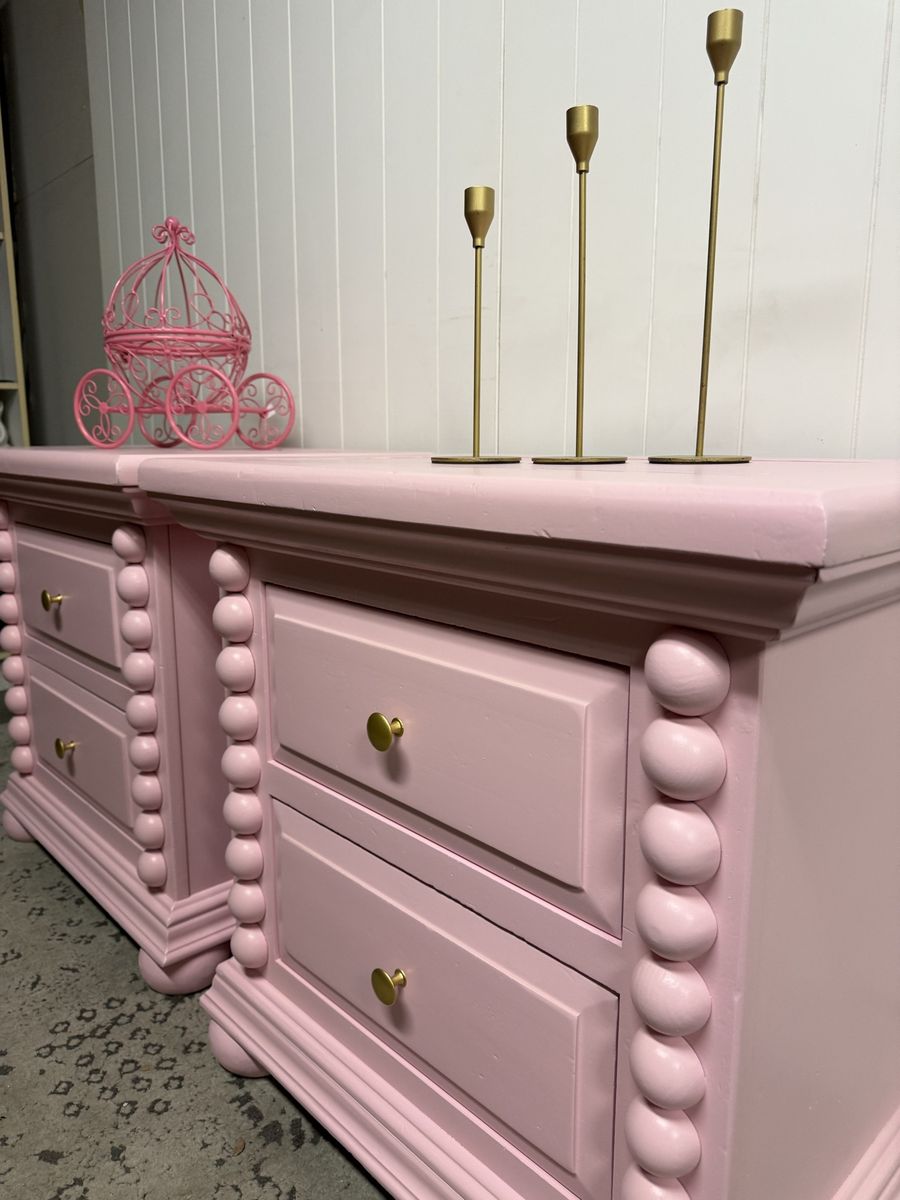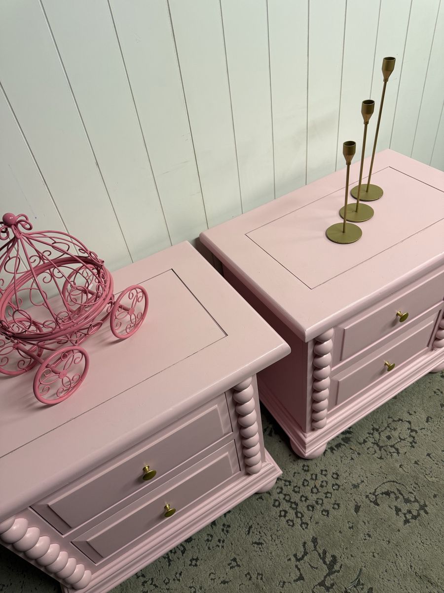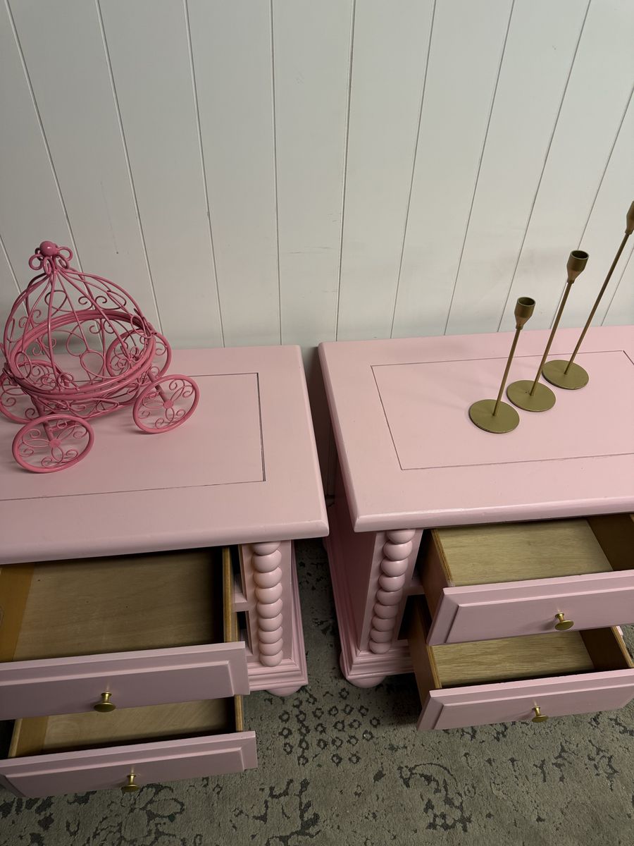 VenmoRefinished Broyhill nightstand in a custom soft pink. Gold knobs on drawer fronts. Solid wood with two spacious drawers that glide smoothly on original tracks. A simple, elegant piece that adds charm to any room.