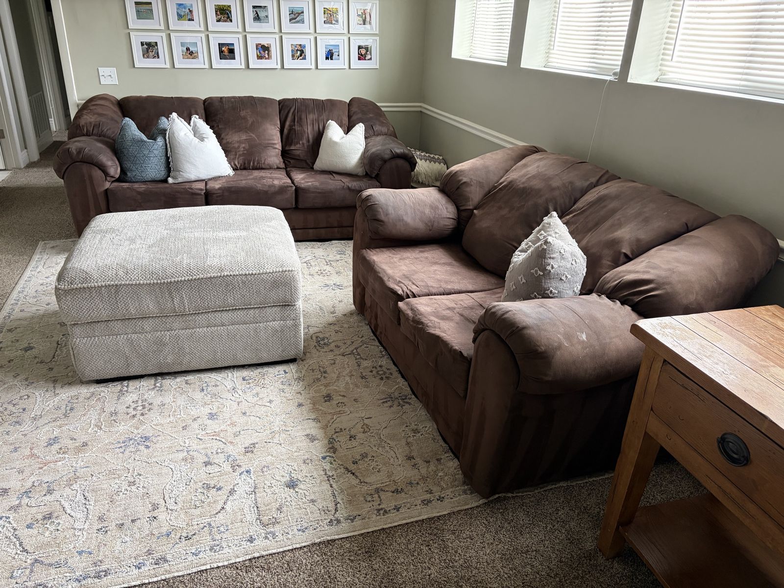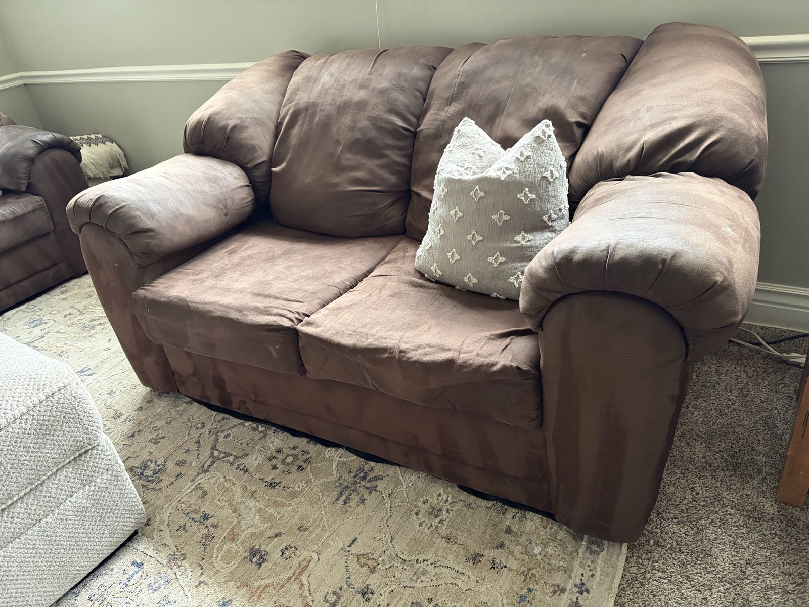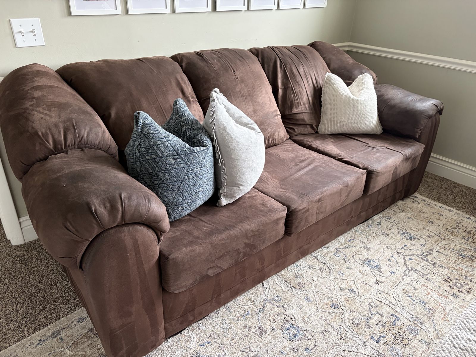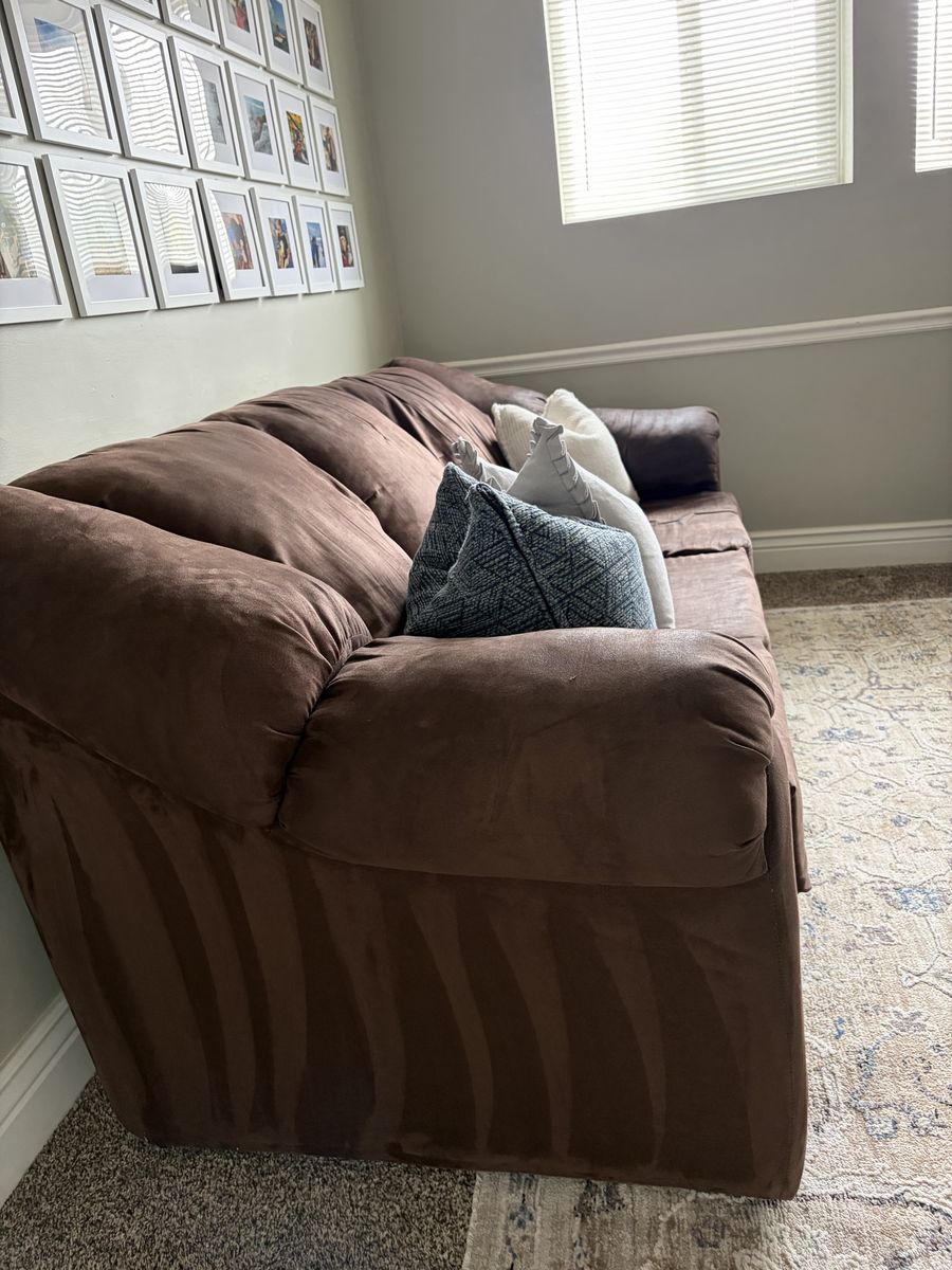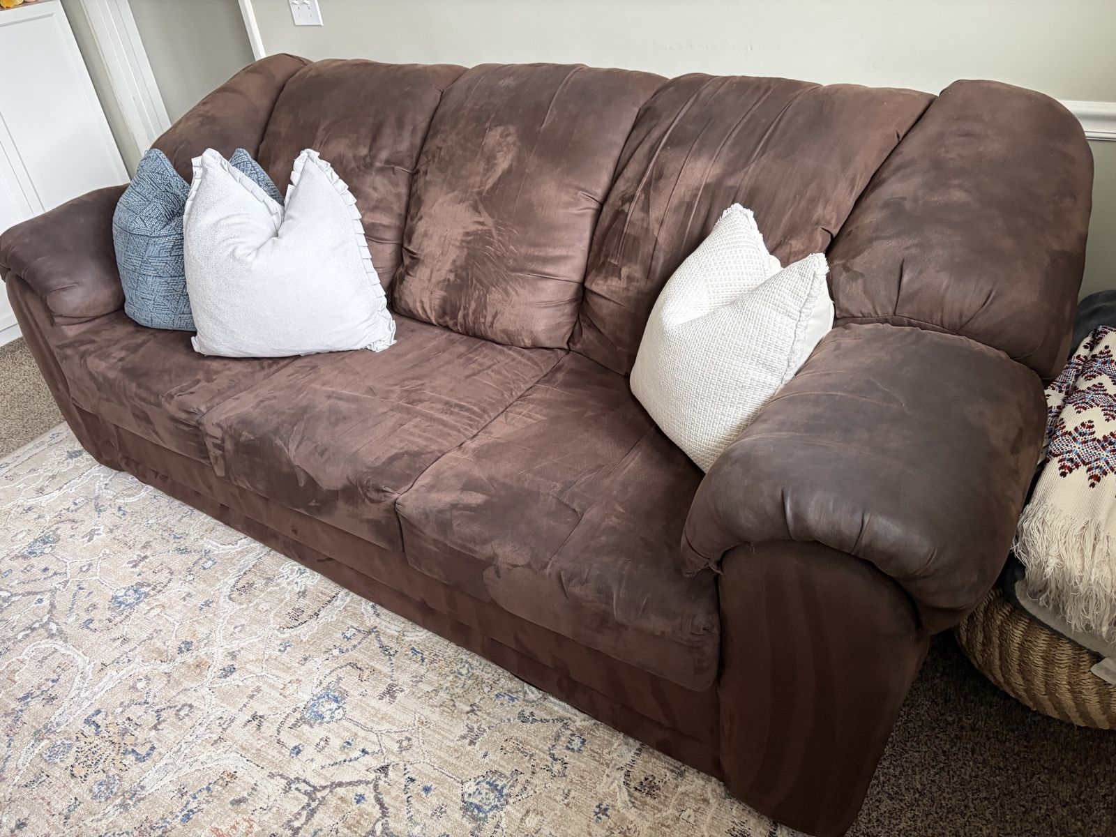 VenmoComes from a very clean home. Very comfortable. There is one small tear that has been repaired in the sofa.