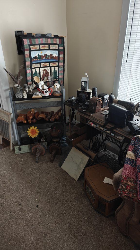 Senior safety/mobility Wheelchair, power chair Power-lift recliners X2 Antiques, antique furniture Trunk, cedar chest Dishes, kitchen items Baking, Cake decorating Canning, preserving CRAFTING, SEWING, QUILTING QUILTS, CROCHET (Mom was a seamstress) Antique and modern quilts ANTIQUE TATTING, KNOTTING, DOILIES, LACE Lots of fabric and sewing supplies, crafting material and scrapbook supplies. Commercial sewing machine. Antique sewing machines Christmas/holiday decoration Large (20 setting?) China set Beds, chests, side tables, lamps. Antique/vintage maps LDS fiction collection (lots) Office supplies, file cabinets Power/yard tools, hand tools, tool boxes, woodworking, antique tools, shop, yard and garden. TOOLS TOOLS TOOLS Electrical, plumbing, mechanics Tool boxes, power tools Fishing, camping, cooking Barbeque grills SEE PHOTOS!