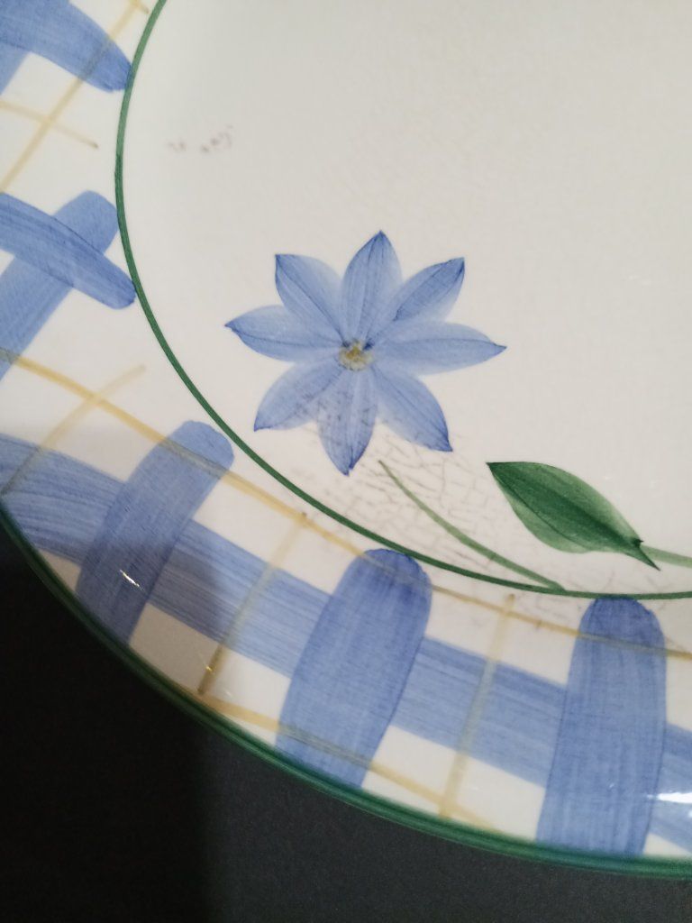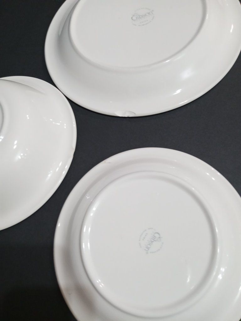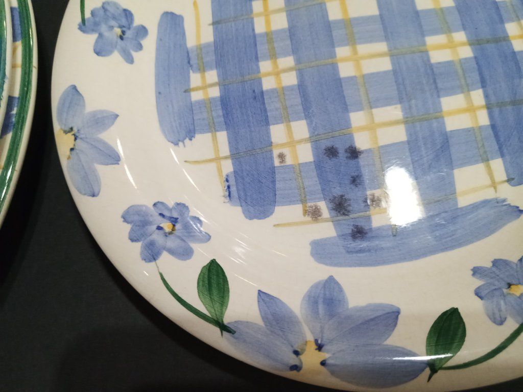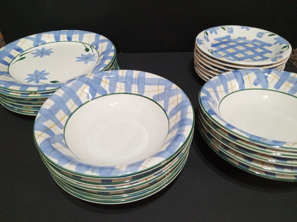 6 dinner plates (10.5") (one has a chip) 8 smaller dessert plates (7.75") (one has a chip) 11 large bowls (8.5") (one has a chip)