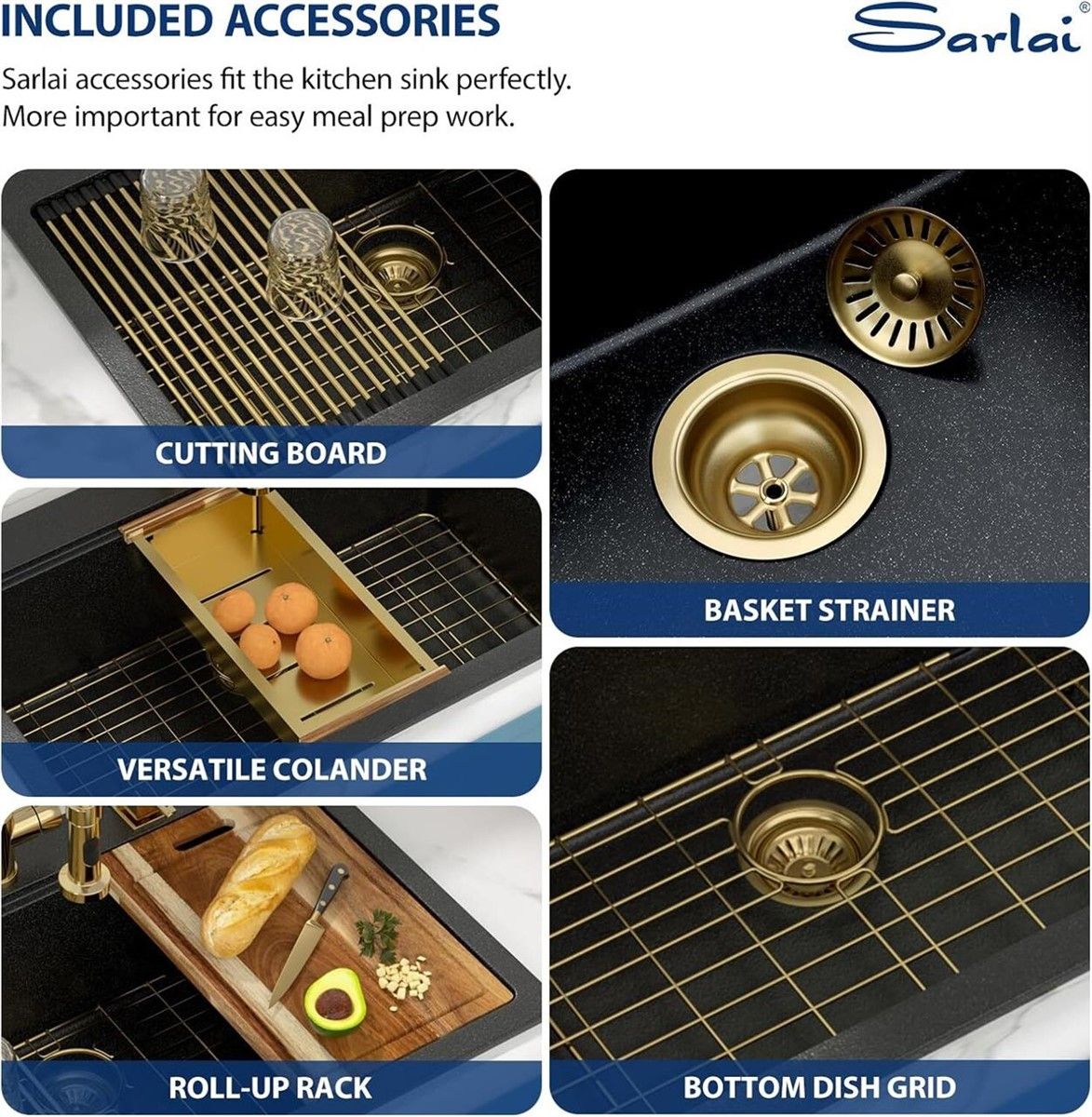 ACCESSORIES FOR 33 x 22 SINK Cutting Board, Colander, Grid, Basket Strainer, Roll up Rack.