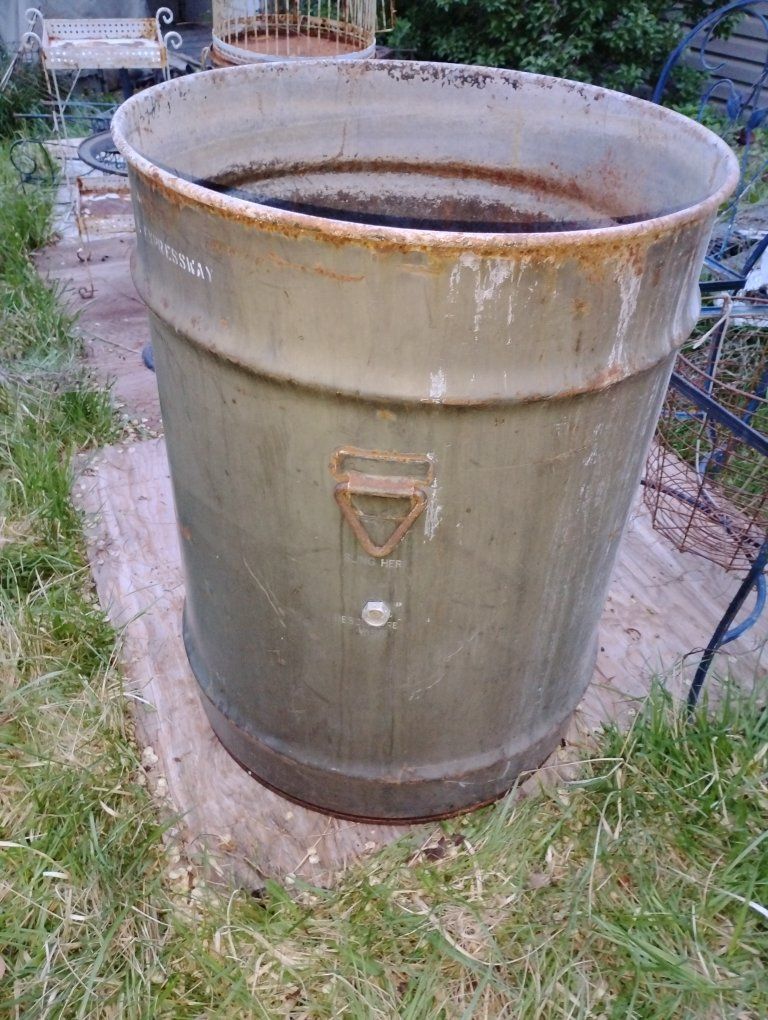 Likely used for transporting sensitive military electronics or hardware. Classic military-style olive drab finish. Solid steel construction, much thicker and more durable than modern barrels. In as found condition, no major rust thru, lots of water deposits.