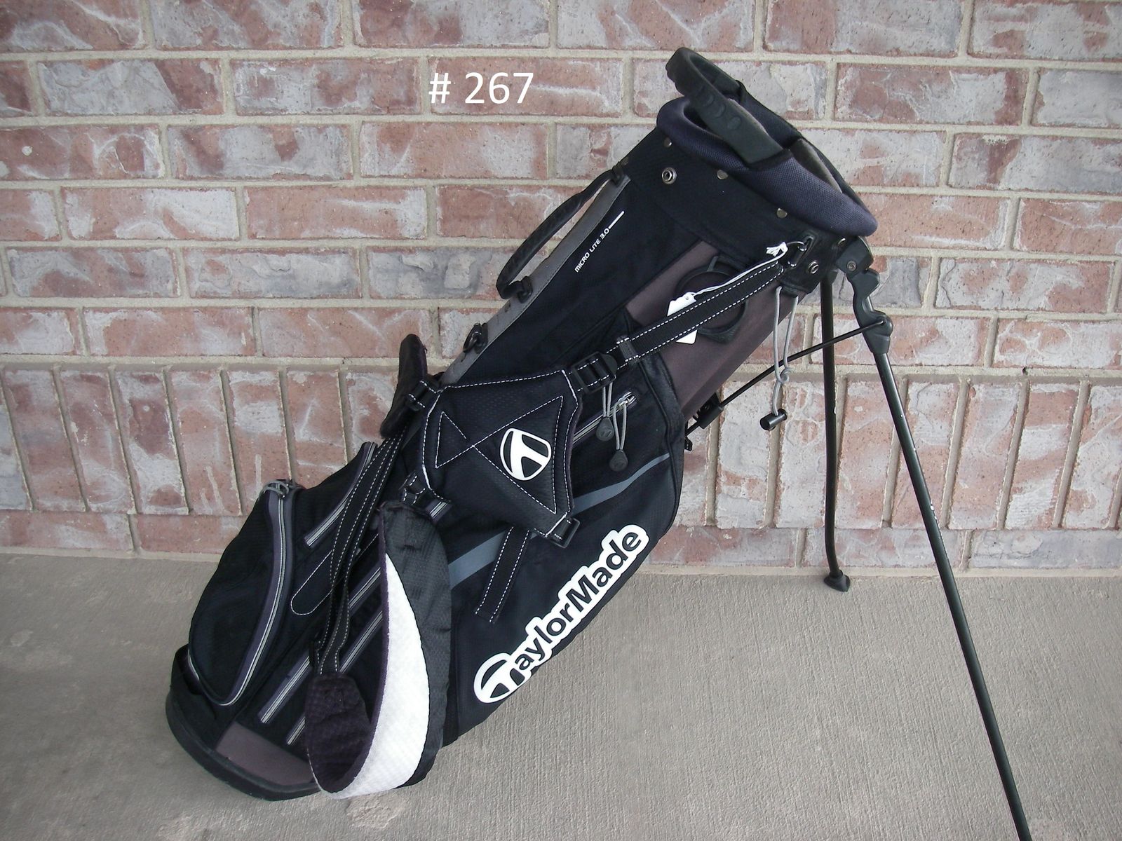#267, TAYLORMADE, MICRO-LITE 3.0, Stand Bag, Black, Handle & Dual Shoulder Straps, 3 Dividers, 6 Pockets, Very Good Condition, but with some top entry wear, $49
