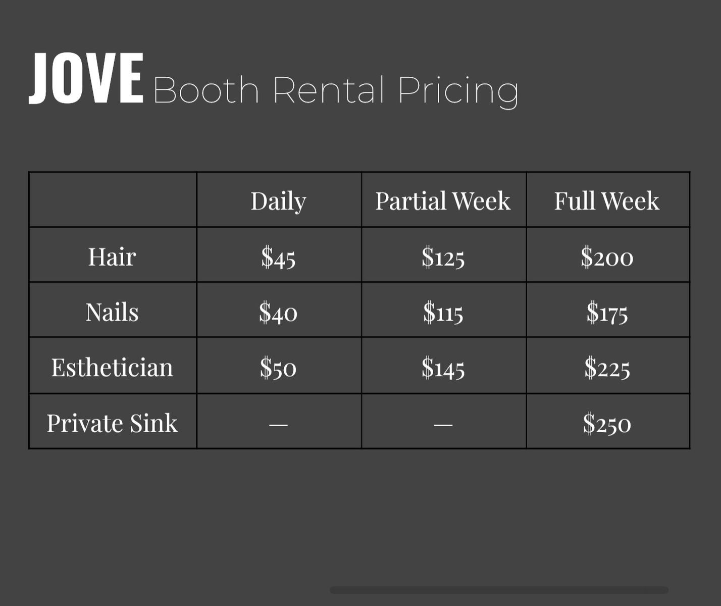 Booth rental includes: Booth with storage Shampoo back bar Break room Laundry Storage Lockers