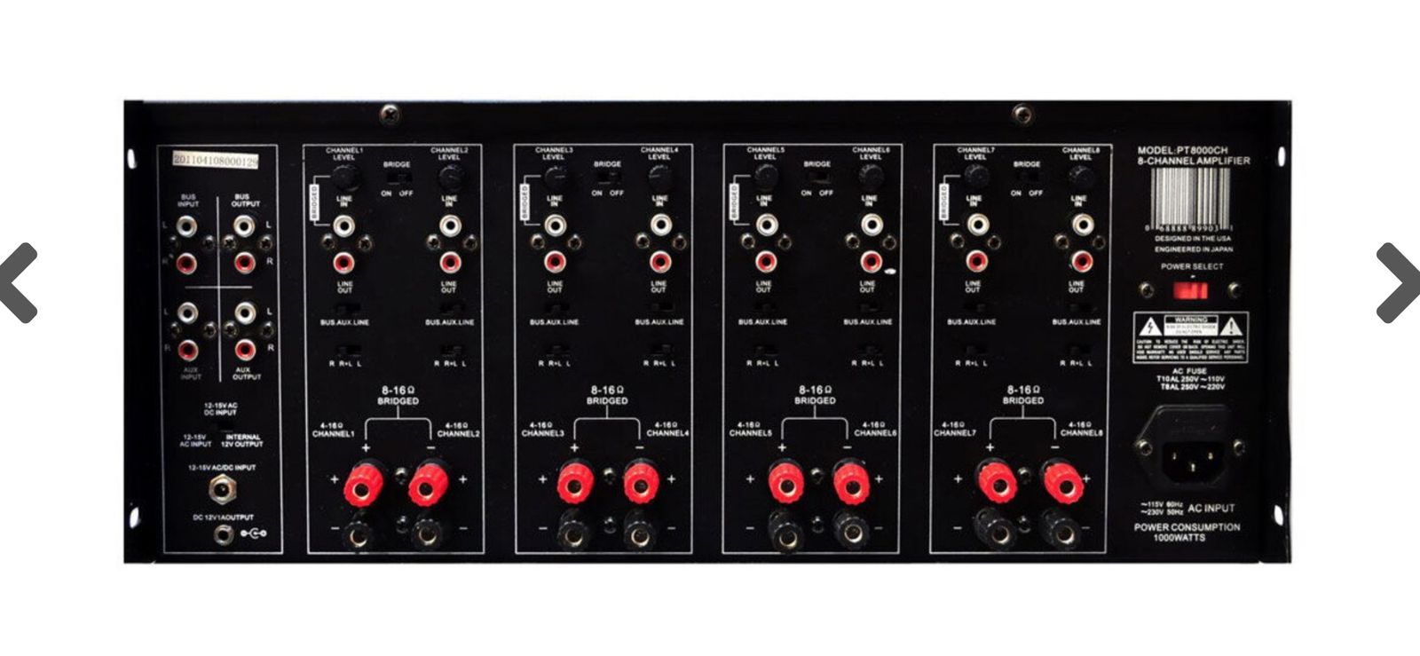 VenmoPyle PT-8000CH 8-Channel amplifier 8000watts peak power. Can use 8-channels independently or Bridge to 4 channels. Can have 8 different inputs, or bus 1 input to all 8 channels. Brand new in box.