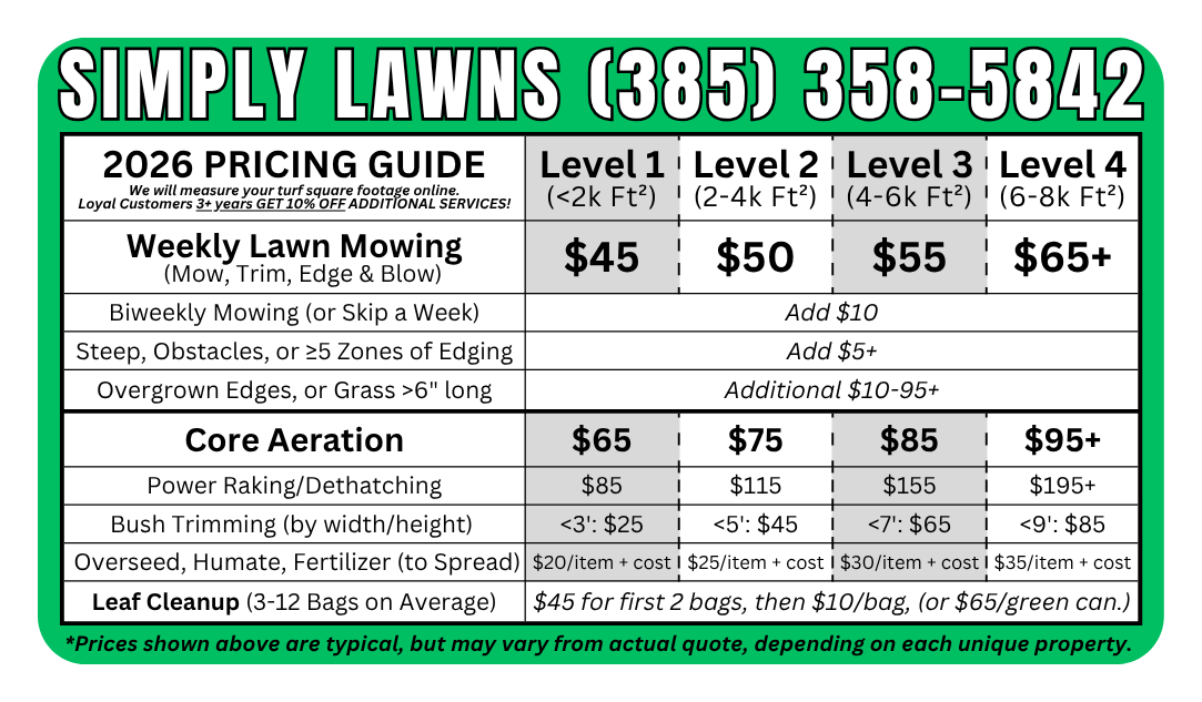 VenmoSimply Lawns has proudly served amazing customers for over 7 years—and we’re just getting started. Our pricing approach is simple and transparent, so you can feel confident you’re getting the right price every time. We offer weekly mowing services for Provo and Orem city, and one-time additional services between American-Spanish Fork.