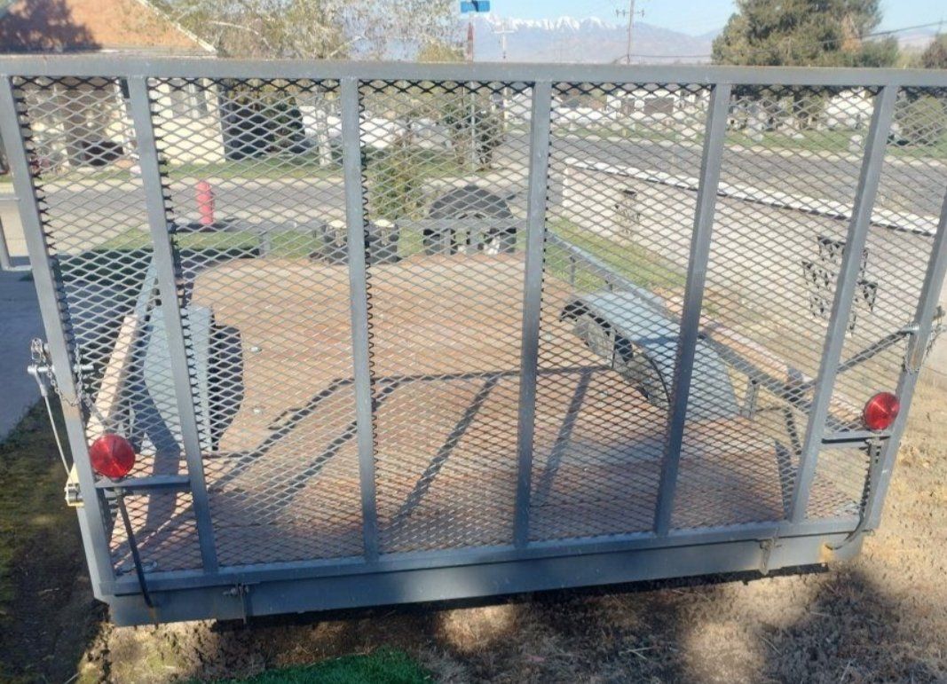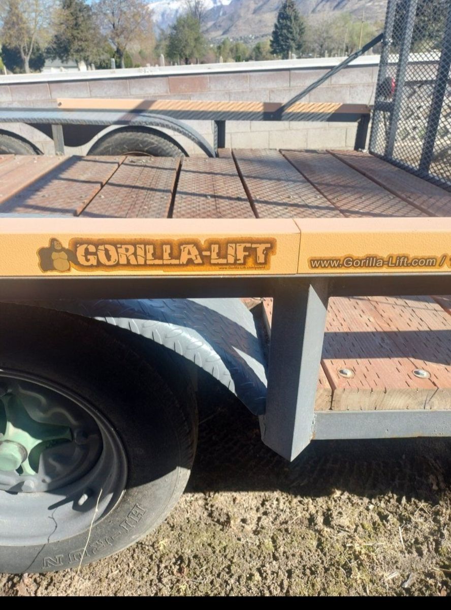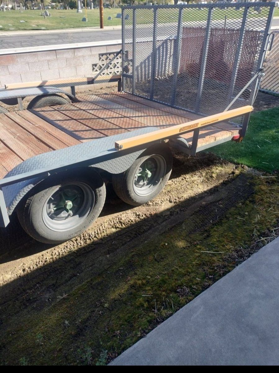 14 ft x 7 ft 8 in flatbed trailer with tandem axle (3500lbs each) loading ramp, front mounted winch, and gorilla gate lift. New treated 2x12 decking, 2-in ball. Call or text for more information