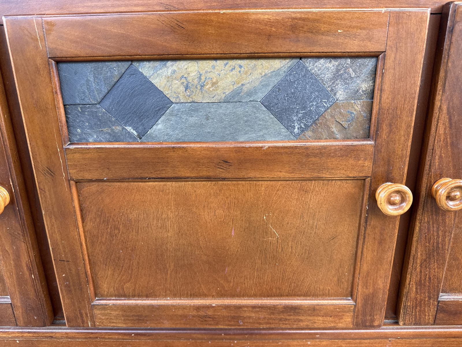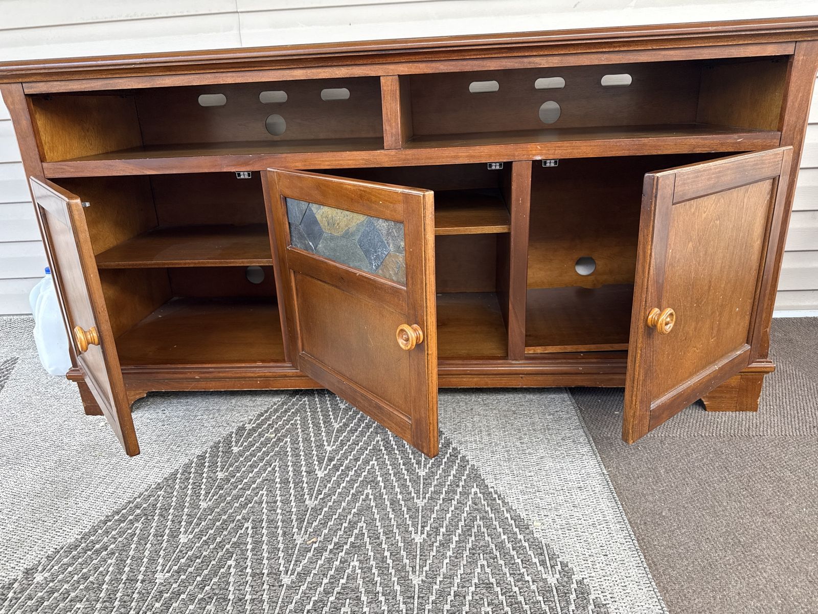 Venmo60”long x 30” high x 20”deep. Has 3 storage areas with shelves. Great condition.
