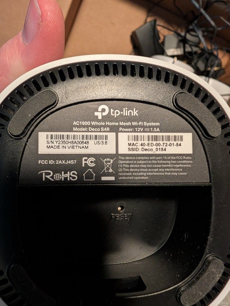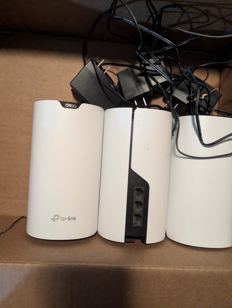 Set of three Deco S4 mesh Wi-Fi units for whole-home coverage (up to 5500 sq ft). Keep your whole house connected to the wifi with AC1900 speeds. Easy setup using the Deco app. Includes all 3 units. Factory reset and working properly.