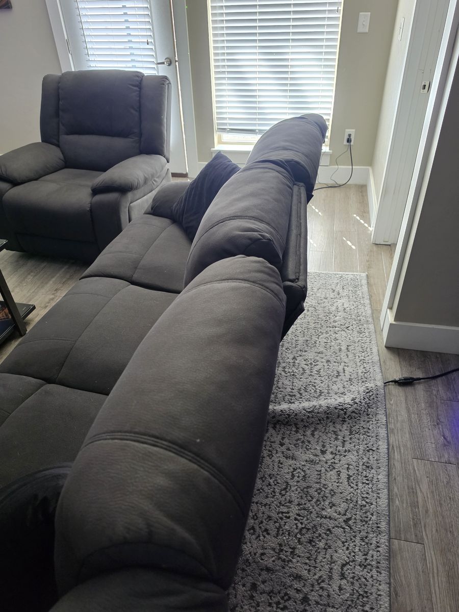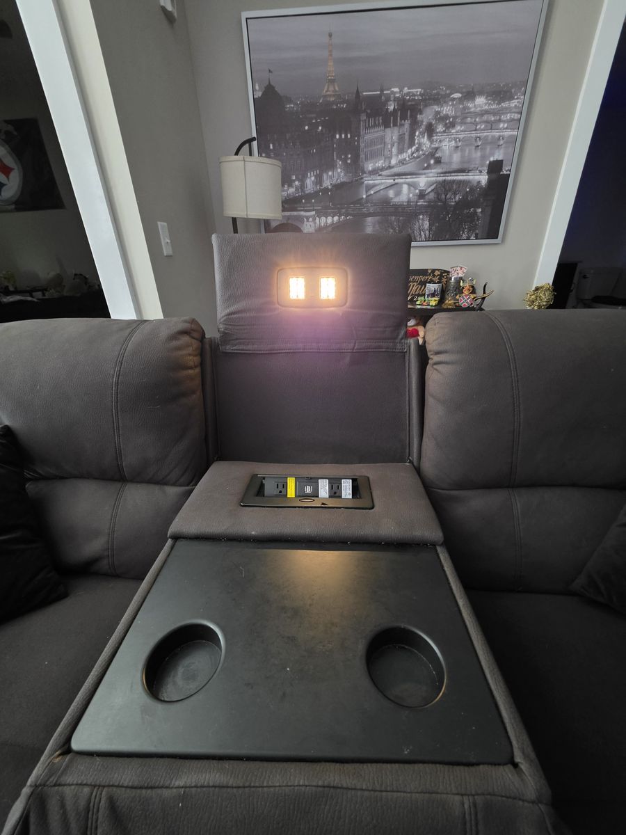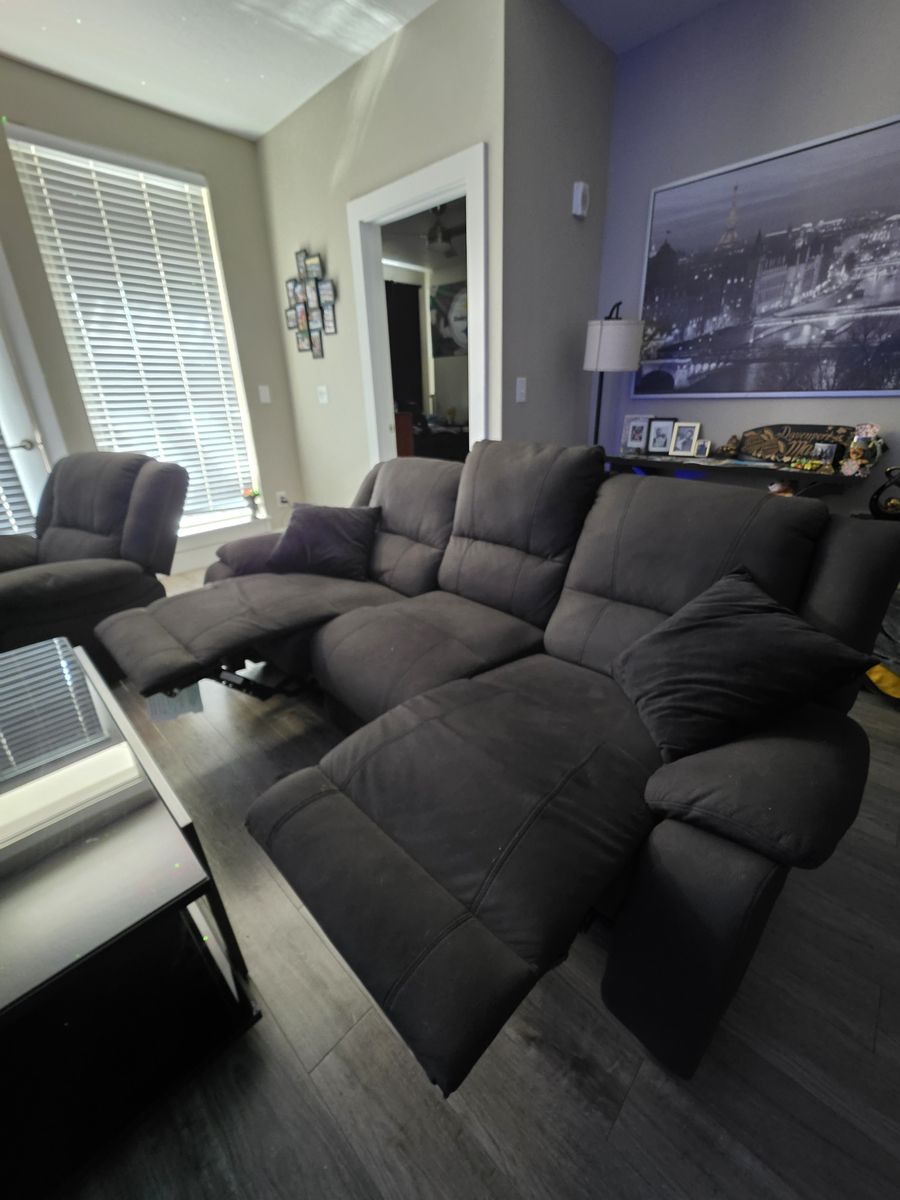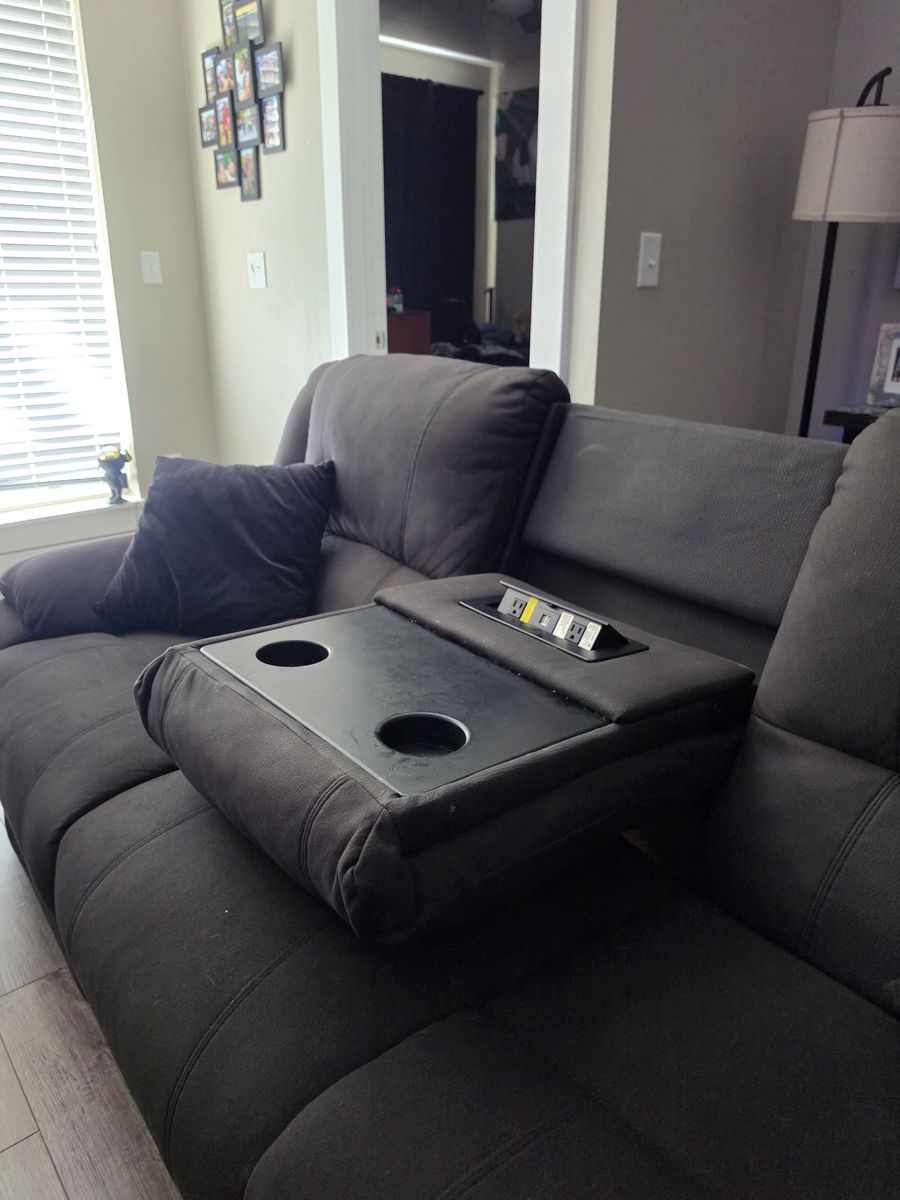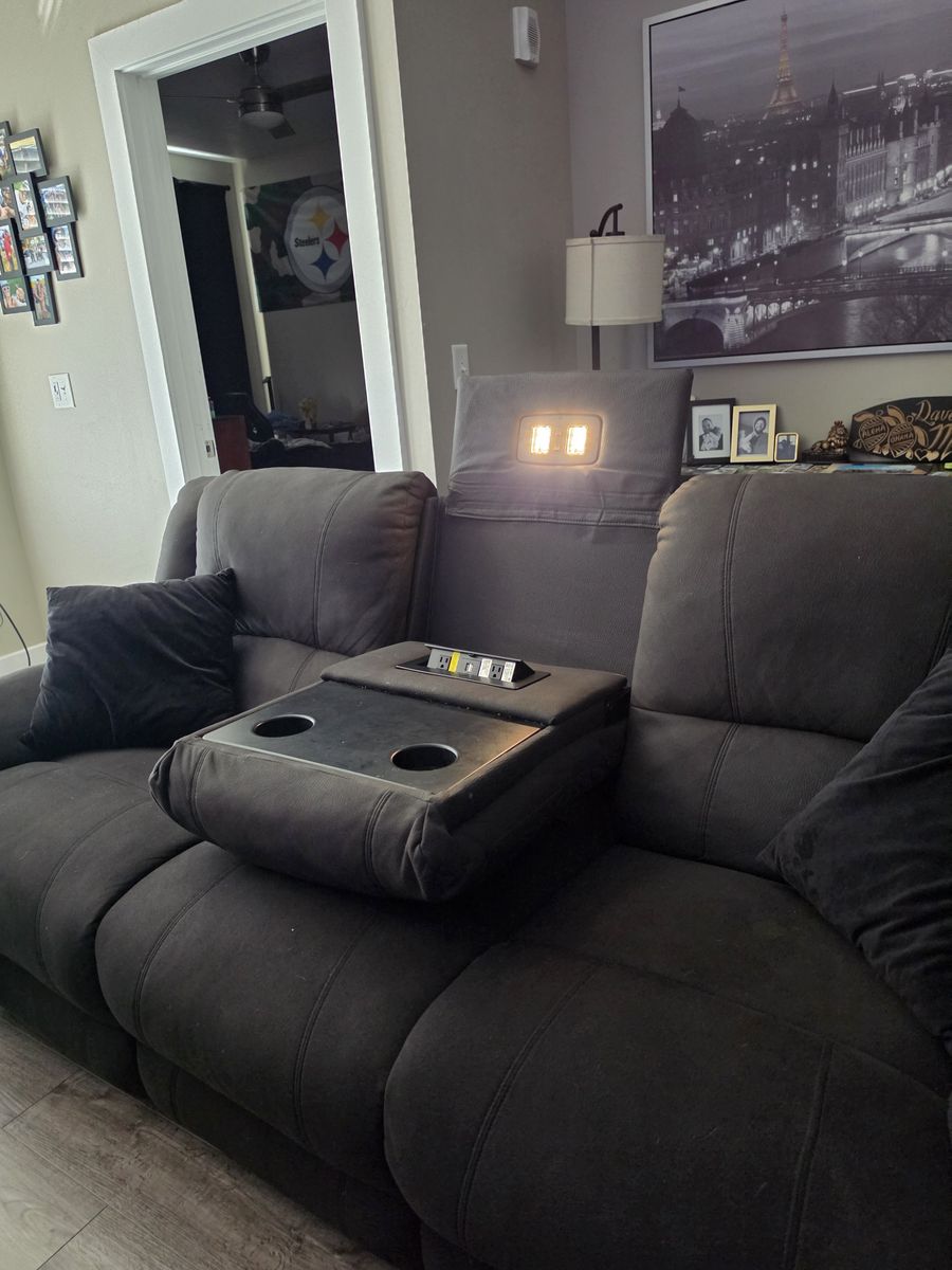 Full living room set, electric powered sofa & powered recliner chair with glass black coffee table. The sofa has power outlets with USB power ports. Built in reading lights, fold down center seat back tray with cup holders, recliner is like new, slight damage to sofa on the back. All the fabric is like new. All electronics are fully functioning.