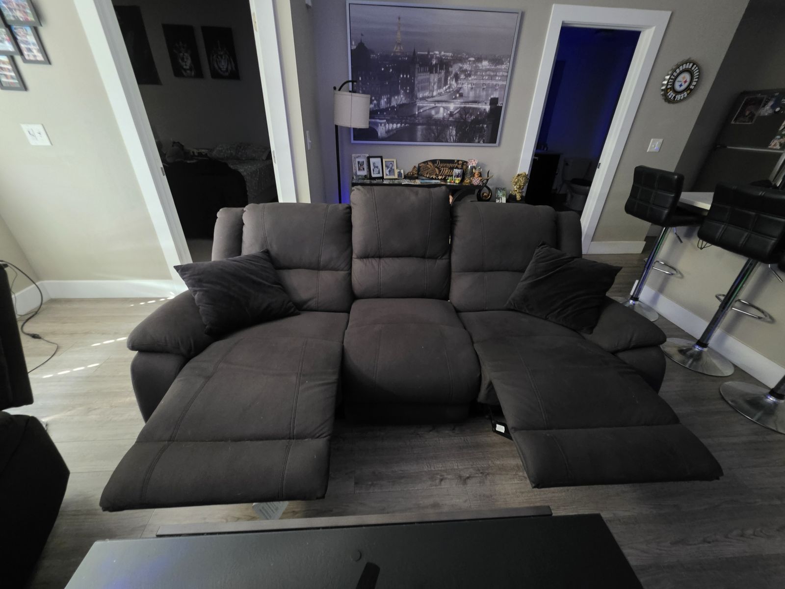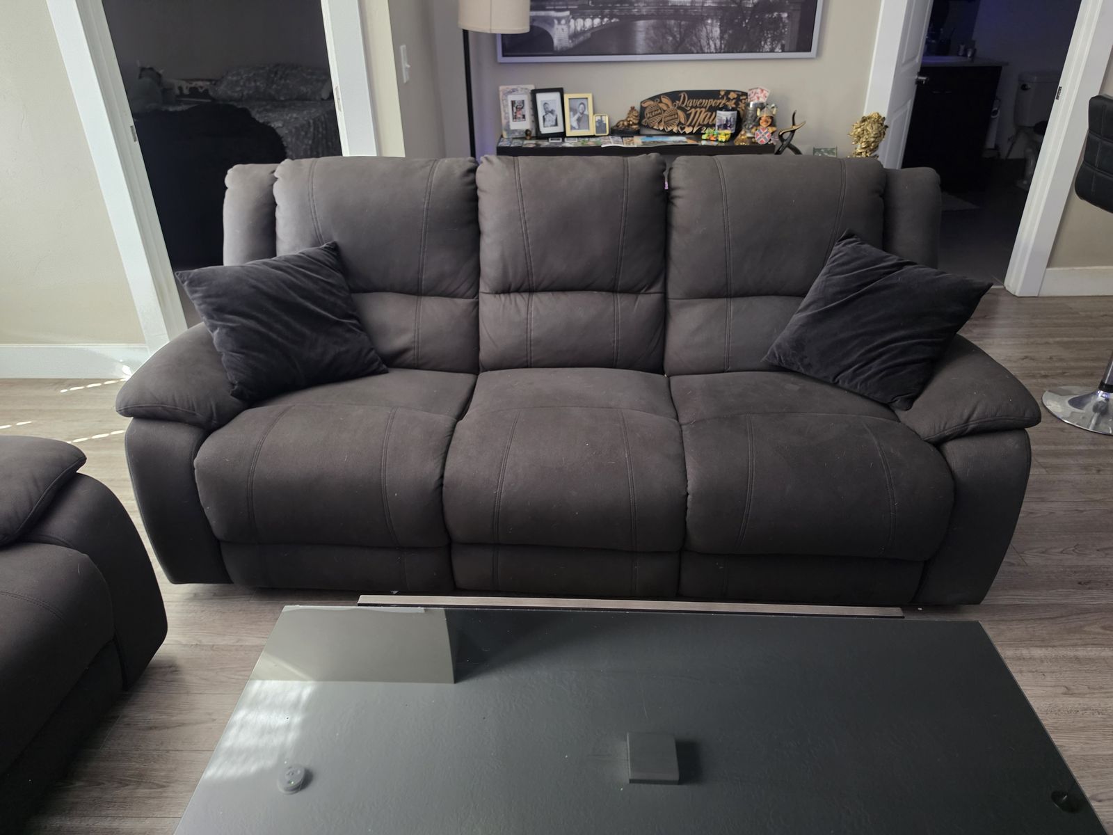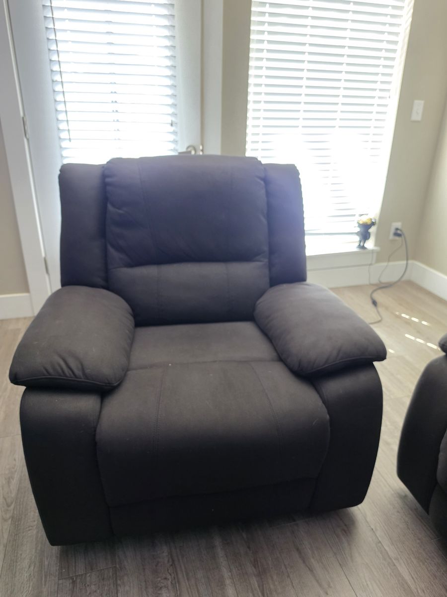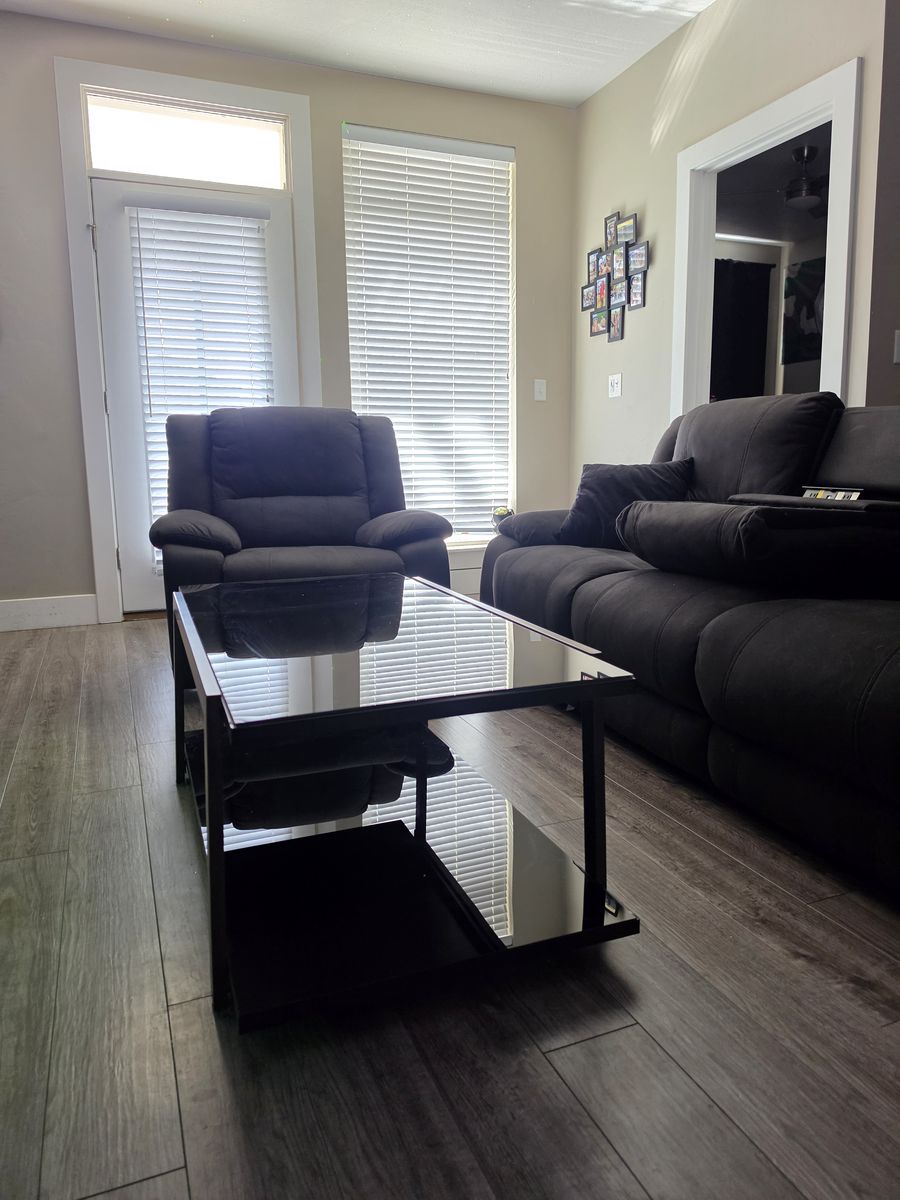 Full living room set, electric powered sofa & powered recliner chair with glass black coffee table. The sofa has power outlets with USB power ports. Built in reading lights, fold down center seat back tray with cup holders, recliner is like new, slight damage to sofa on the back. All the fabric is like new. All electronics are fully functioning.
