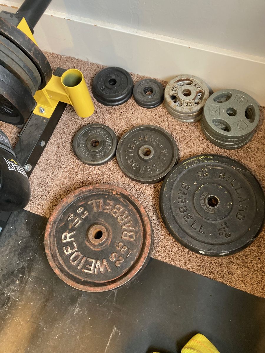 2- 100# dumbbells and misc plates
