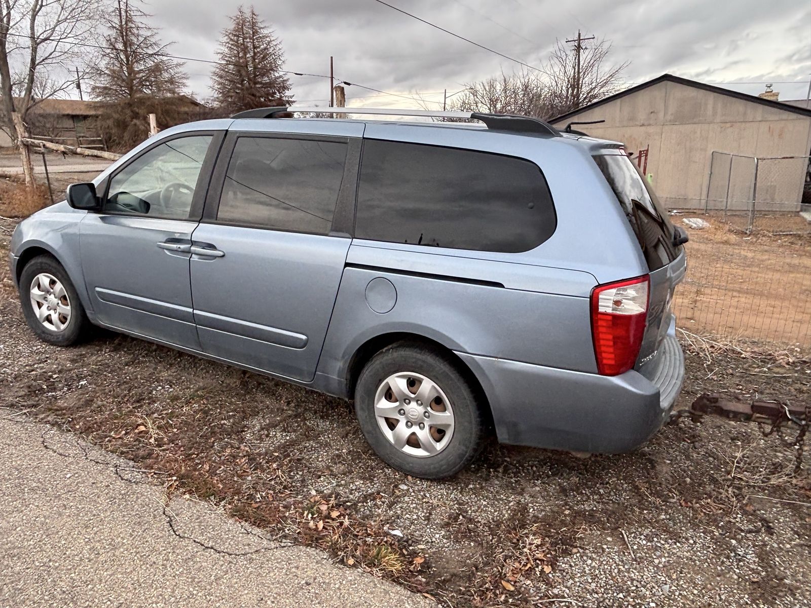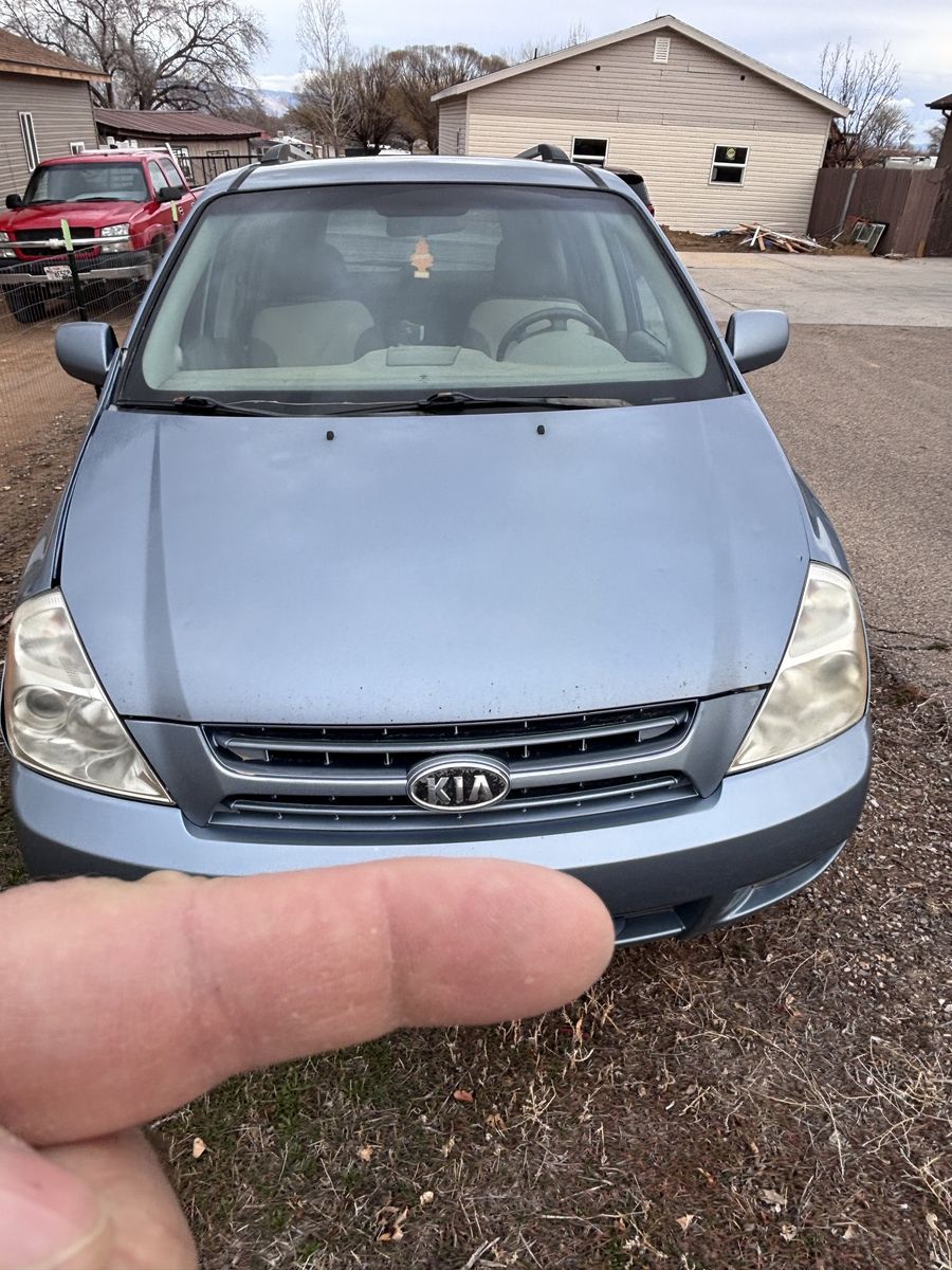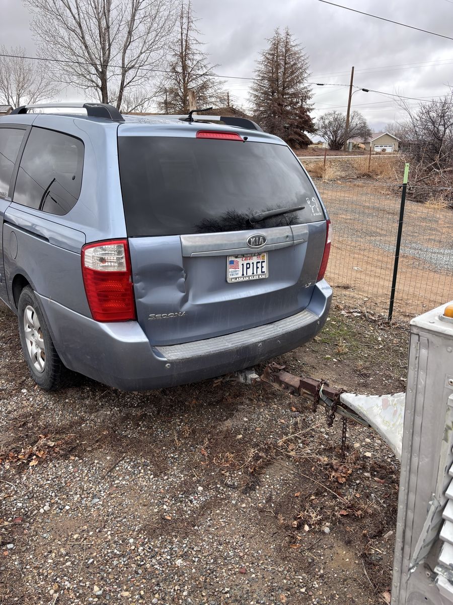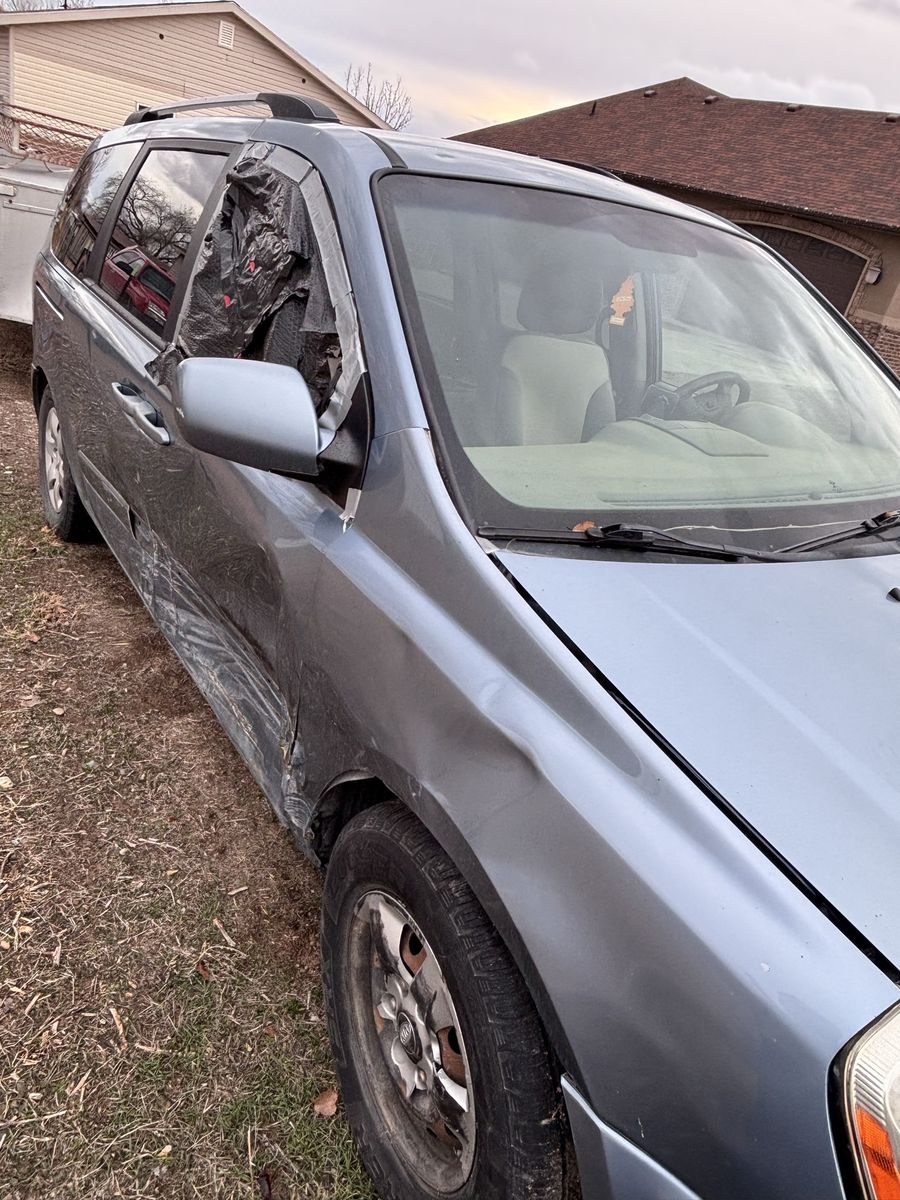 Zelle2009 Kia Sedona LX. 7 seat passenger. 6 cylinder It has been hit on the passenger side door. It will need a new door. It is undrivable because the alignment is way off and tie rod is broken. It runs just fine. It has 288,000 miles. Tires are in good shape.