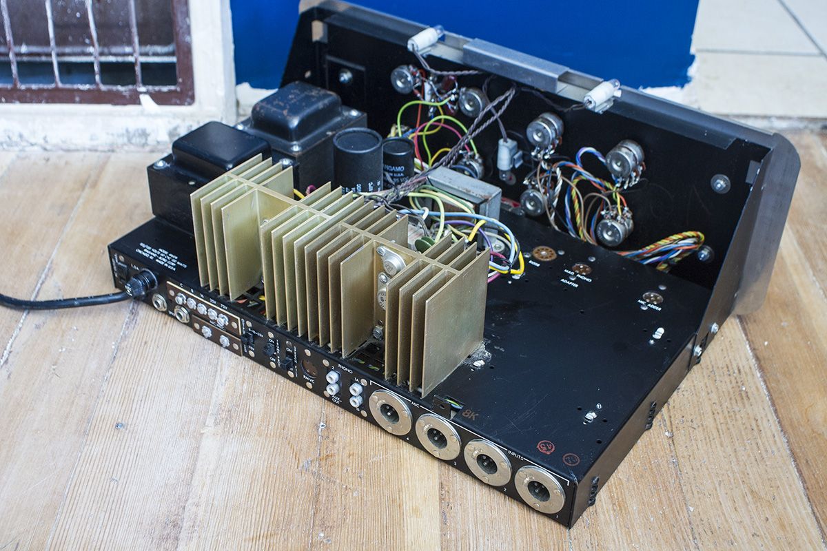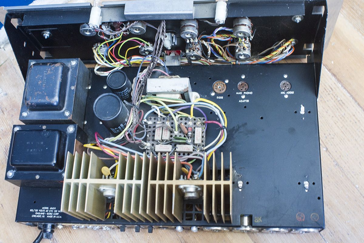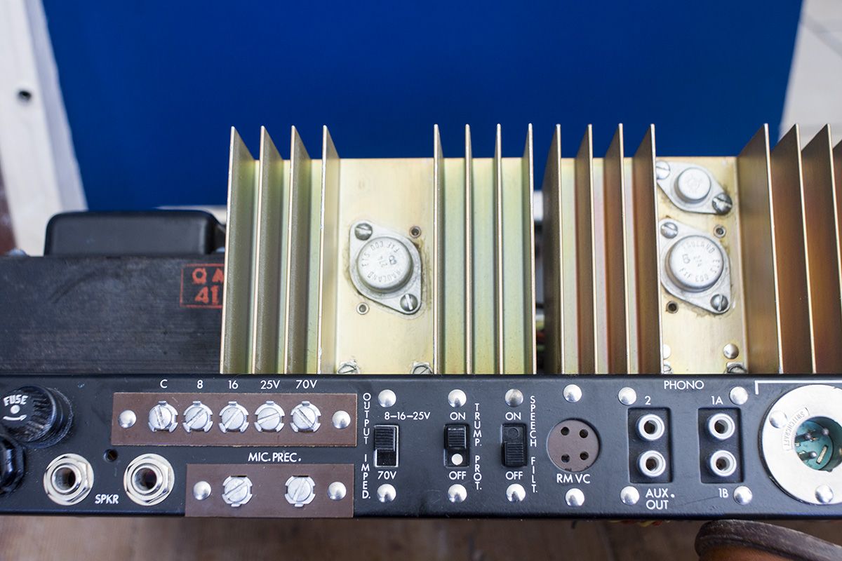 Late 50s / early 60s Rauland-Borg 4160B amp. Has four microphone inputs and two sets of RCA inputs. Taps for 8V, 16V, 25V, and 70V output as well as standard 1/4" speaker connections. Seems to be fully functional. I was able to test the RCA and microphone inputs, playing through some PA speakers and it works really well. I did remove the chassis from the case and spray each of the pots from the back with electrical contact cleaner before putting it all back together. This removed all noise when turning the knobs. One small lightbulb is burned out, but the other two are still good. The amp chassis has a slot for one (likely optional) vacuum tube, but I'm not sure what the purpose of it would have been (pre-amp of some sort?). The company Rauland-Borg is still in business. They began making audio products and eventually branched out into school and hospital communications which seems to be their main focus today. Underneath the rear lip of the chassis cover is an inscription which reads "Joseph Ward" so I assume that this was once used in chapel in the tiny town of Joseph, Utah. I also do have a pack of XLR gender reversal adapters for the microphone inputs.