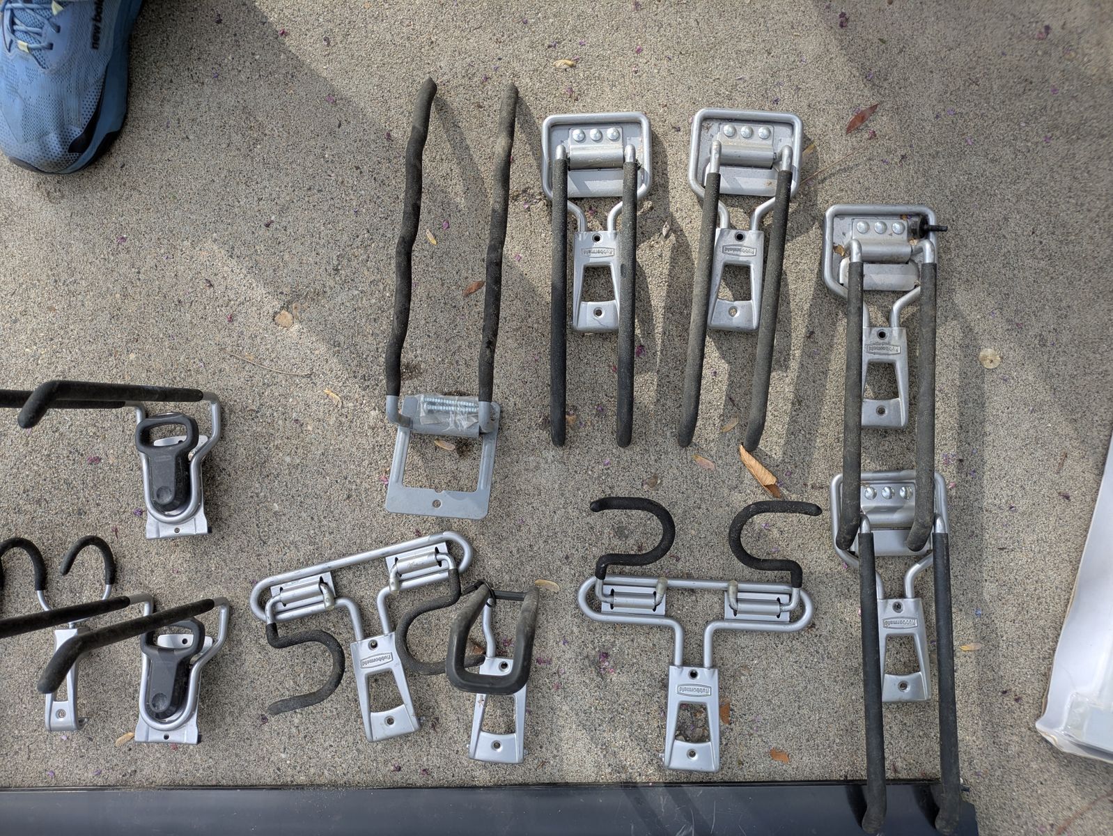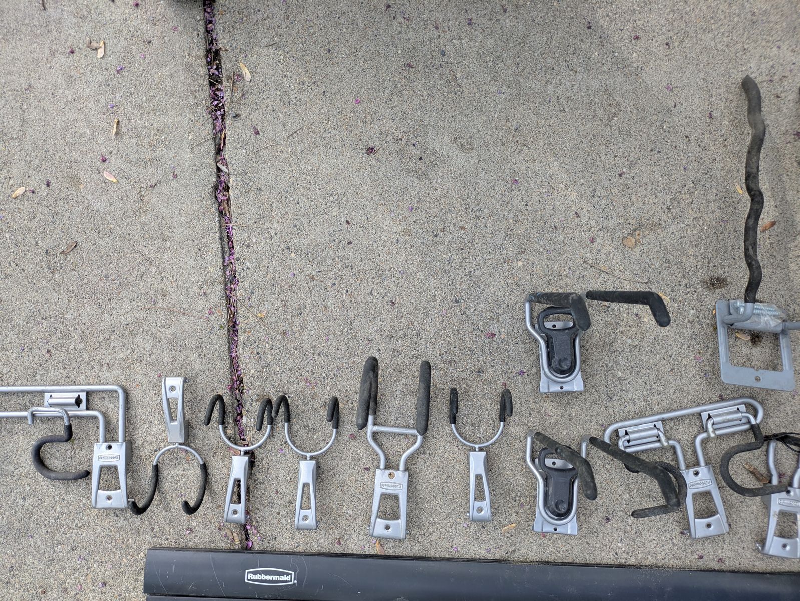 GooglePayRubbermaid three track and multiple hook garage storage system. Two tracks were unused as were many hooks. Only one track and cover were mounted in a shed (see photos.) All in good, working condition. Retails for around $200 given all the specialty rubbermaid ladder and bike hooks included. Yours for a fraction of that price. Enjoy.