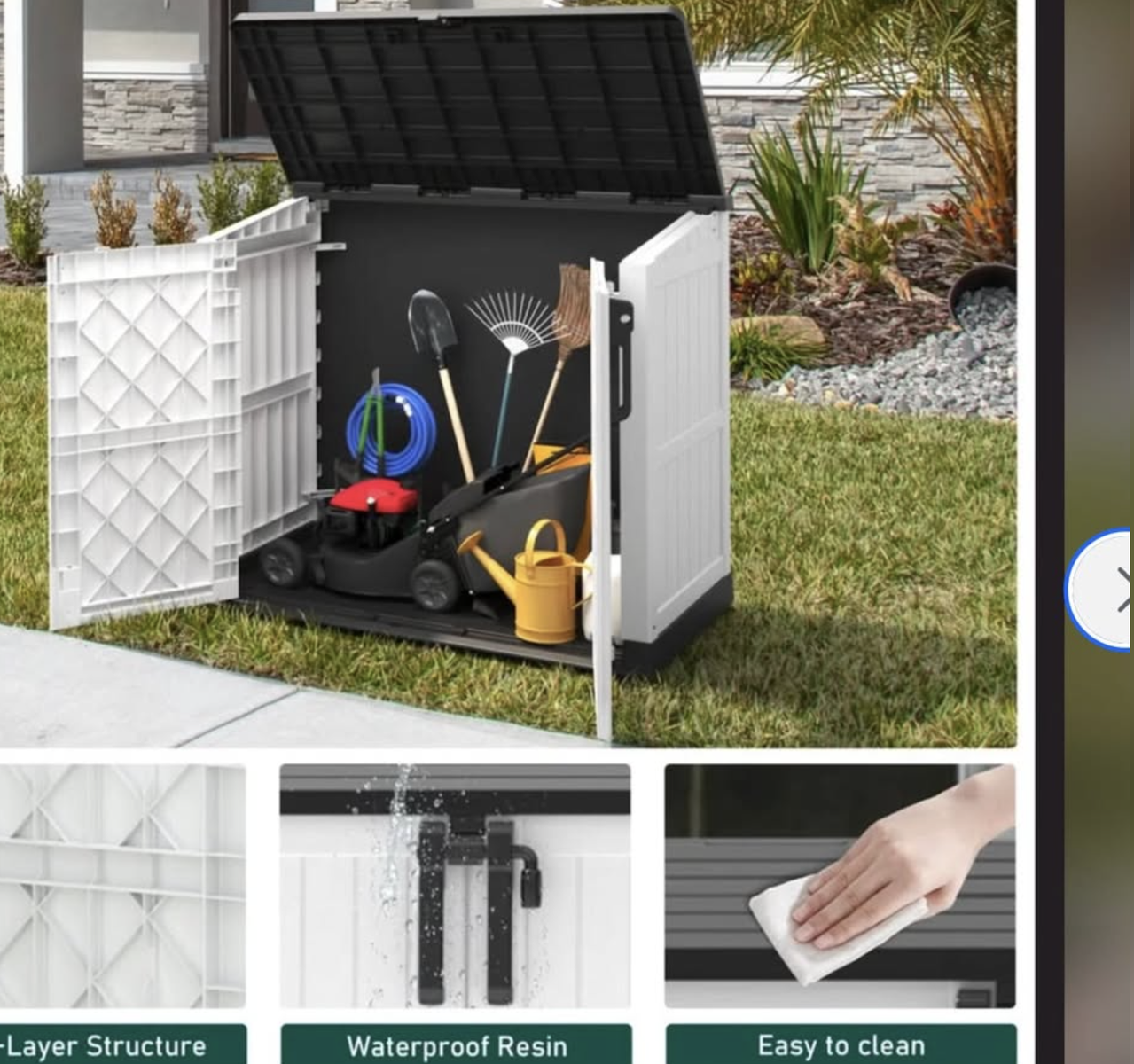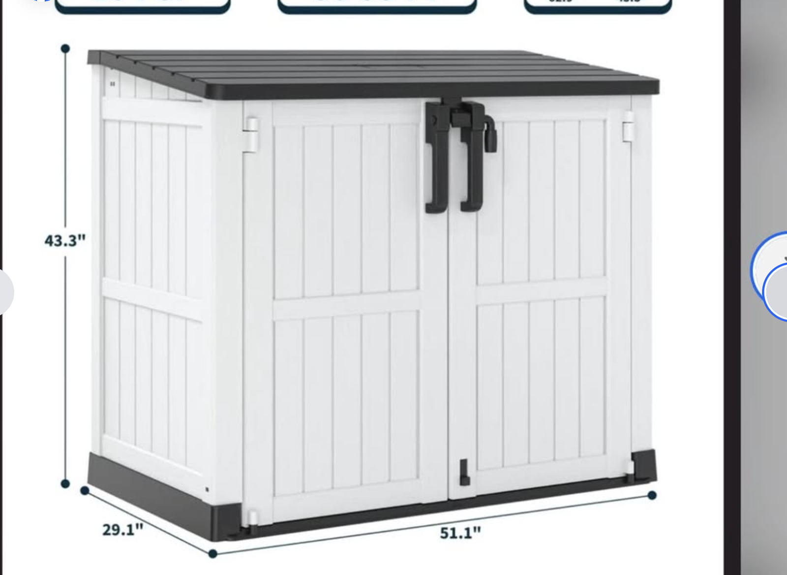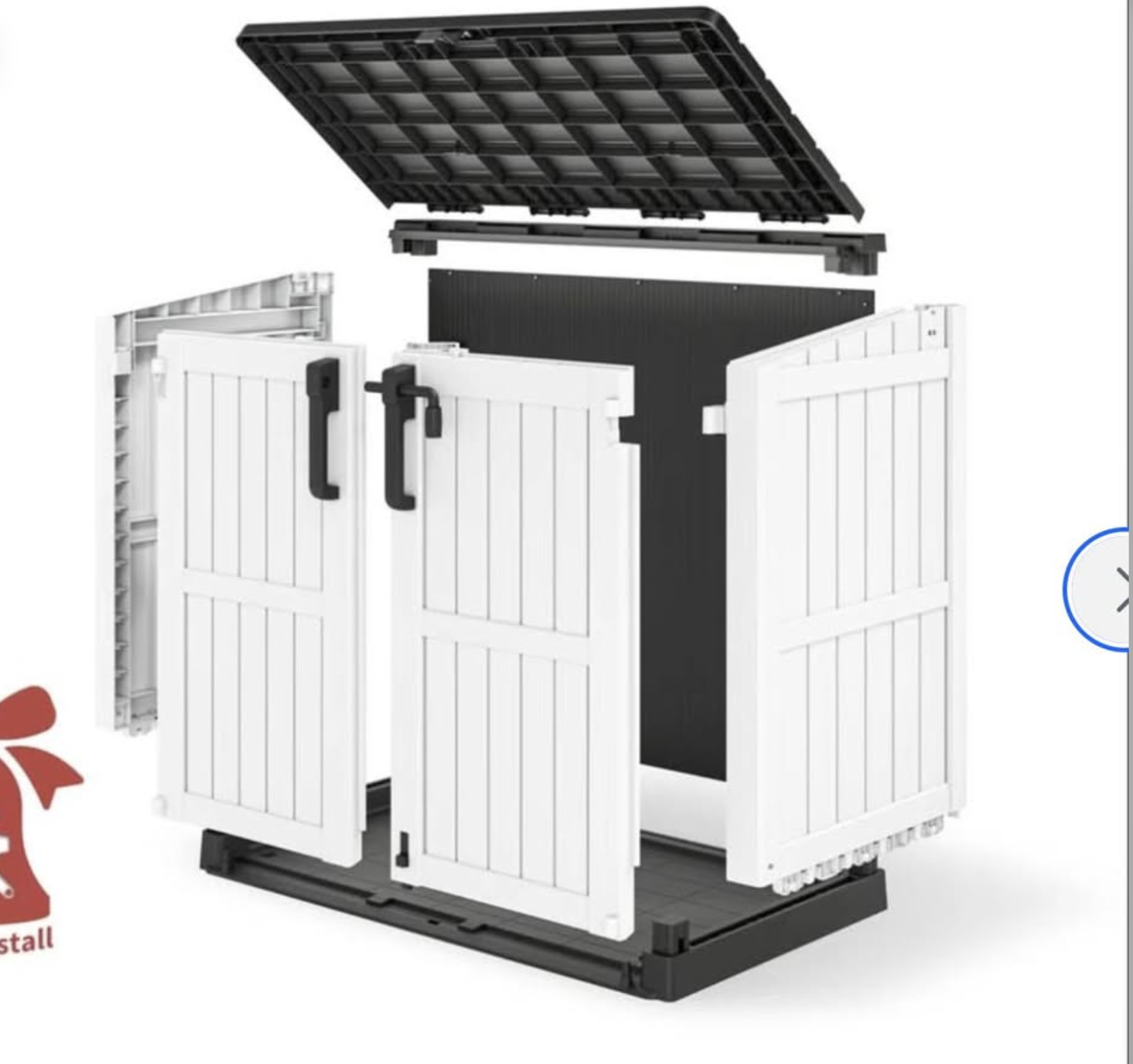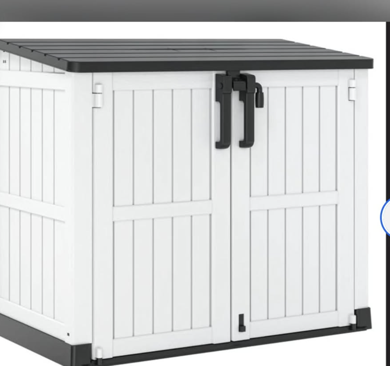 Brand new in box, unassembled, 51.1''W Outdoor Resin Horizontal Storage Shed-280 Gallon..ashten gray/black Made from weatherproof, UV-resistant materials, it’s built to handle all seasons and protect your essentials. With quick and easy assembly, you'll have a spacious solution for storing tools, garden equipment, and more in no time. The double-lock design keeps everything secure, and its sleek design adds style to any yard or patio. Maximize your storage and minimize clutter—this shed is a must-have for any outdoor area! EXTRA LARGE STORAGE CAPACITY - Externally, this storage shed measures 51.1'' W * 29.1 '' D * 43.3'' H, with a capacity of 280 gallons; perfect for storing gardening tools, small lawn mowers, bicycles, garden furniture and 2 small bins. You can add another laminate shelf (48x13 inches, sold separately), if you want to reduce clutter and save space, placing a storage shed in your yard, garden, backyard, living room or pool is a good choice. DOUBLE LOCKING DESIGN - The top of the cabinet is pre-drilled with locking holes, and the bottom latch can be used for foot switches without the need to crouch down. Two locks ensure your items are safe and intact outdoors. Lever-supported flap facilitates quick and easy storage of your items. ALL-WEATHER RESISTANT - This storage shed is made of UV-resistant resin for all-weather use, easy to clean and maintain; the complete box top and slot splicing makes the storage box excellent waterproof ability. DUAL PANELS - The outdoor storage shed is made of double-layer resin panels, which are treated with advanced technology to provide stronger wind and impact resistance; not easy to bend or puncture; can safely store valuable tools and equipment. EASY TO INSTALL AND DISASSEMBLY - Comes with detailed instructions, the name, number and size are marked on the bag, quick installation can be done within 20 minutes,