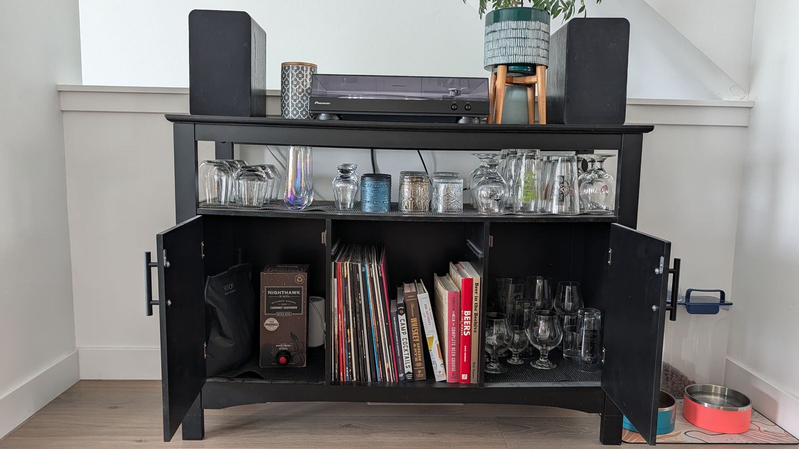 VenmoThis sleek, matte black buffet is a versatile storage solution perfect for any dining room or home bar. It features two closed cabinets for hidden storage, a dedicated glassware gallery for displaying your favorite glasses, and a center cubby space.
