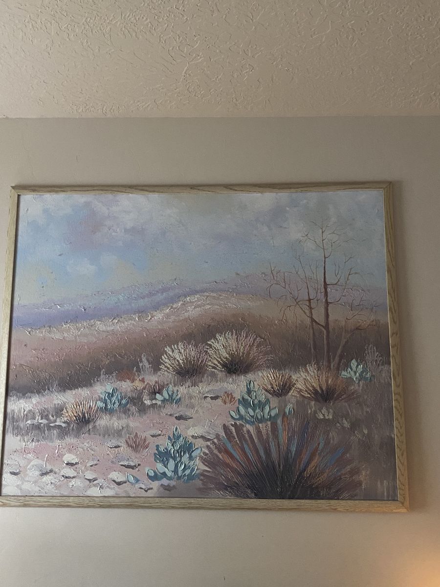 Large 4ft x 3ft (48in x 36in) vintage 1970's, original oil on canvas. Painting is in good condition and features a Southwest desert theme in soft muted tones.
