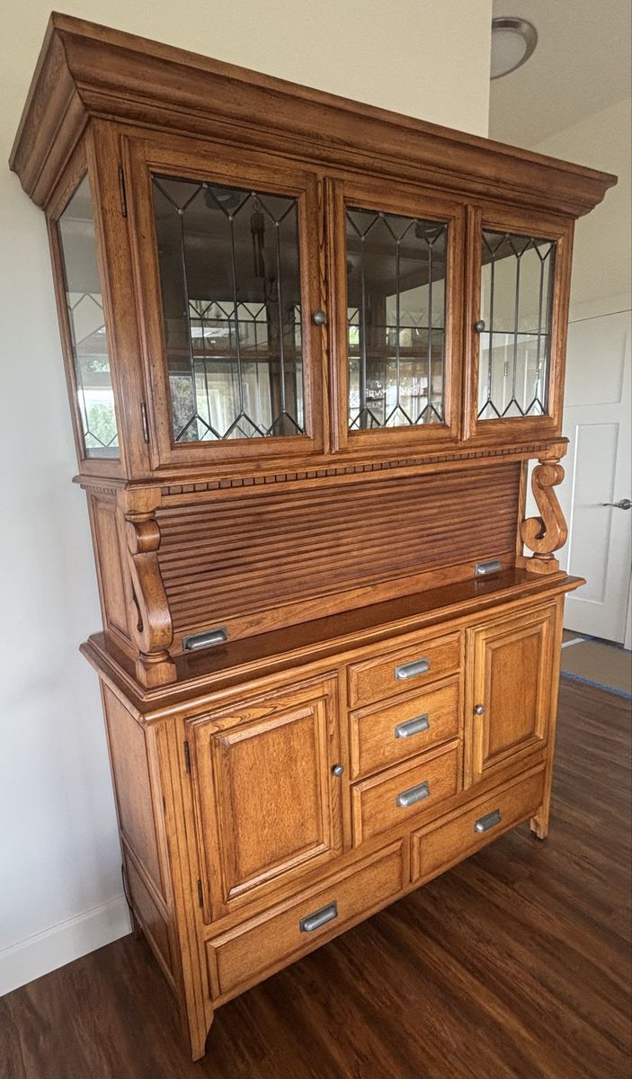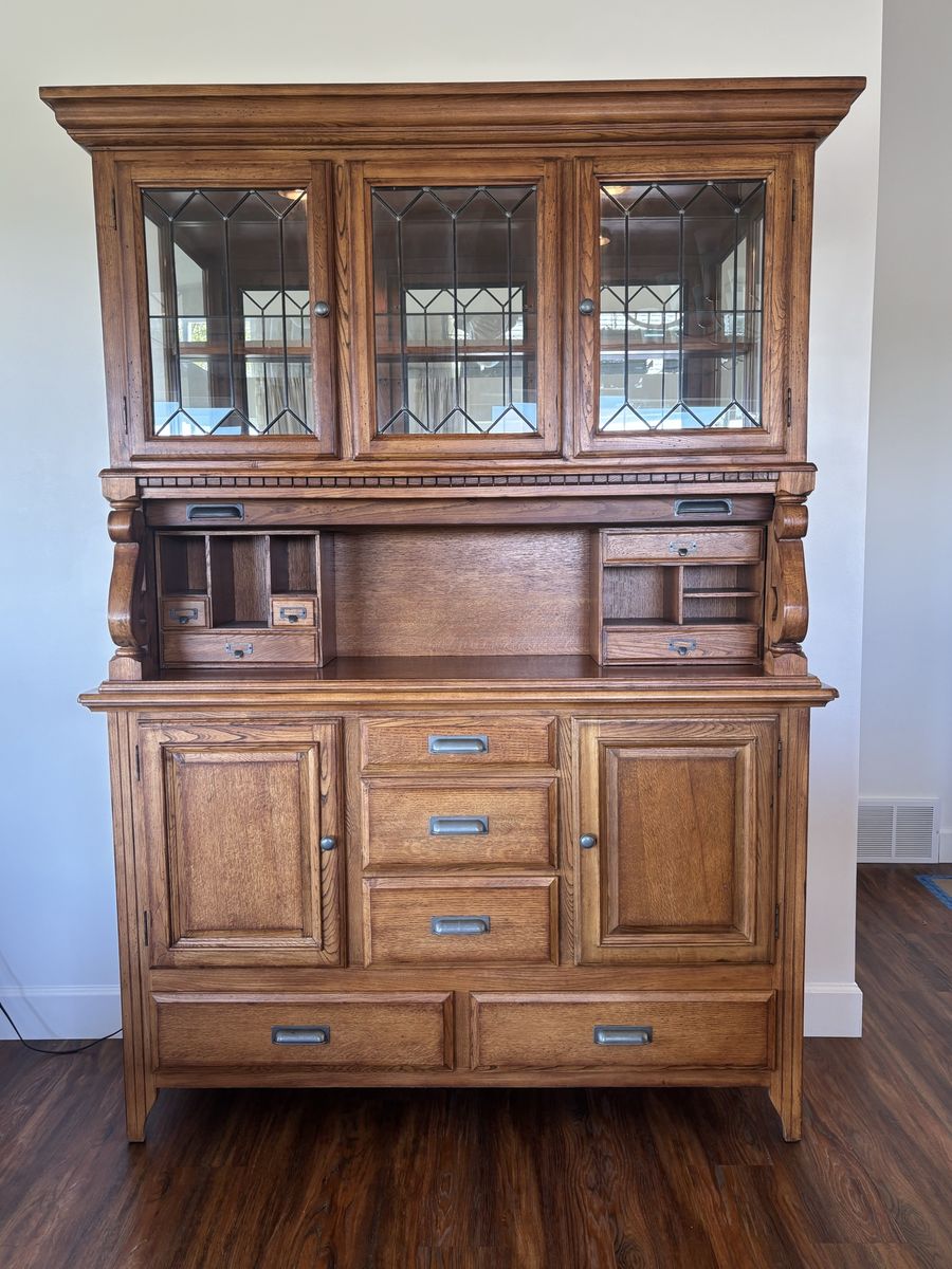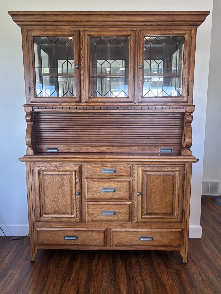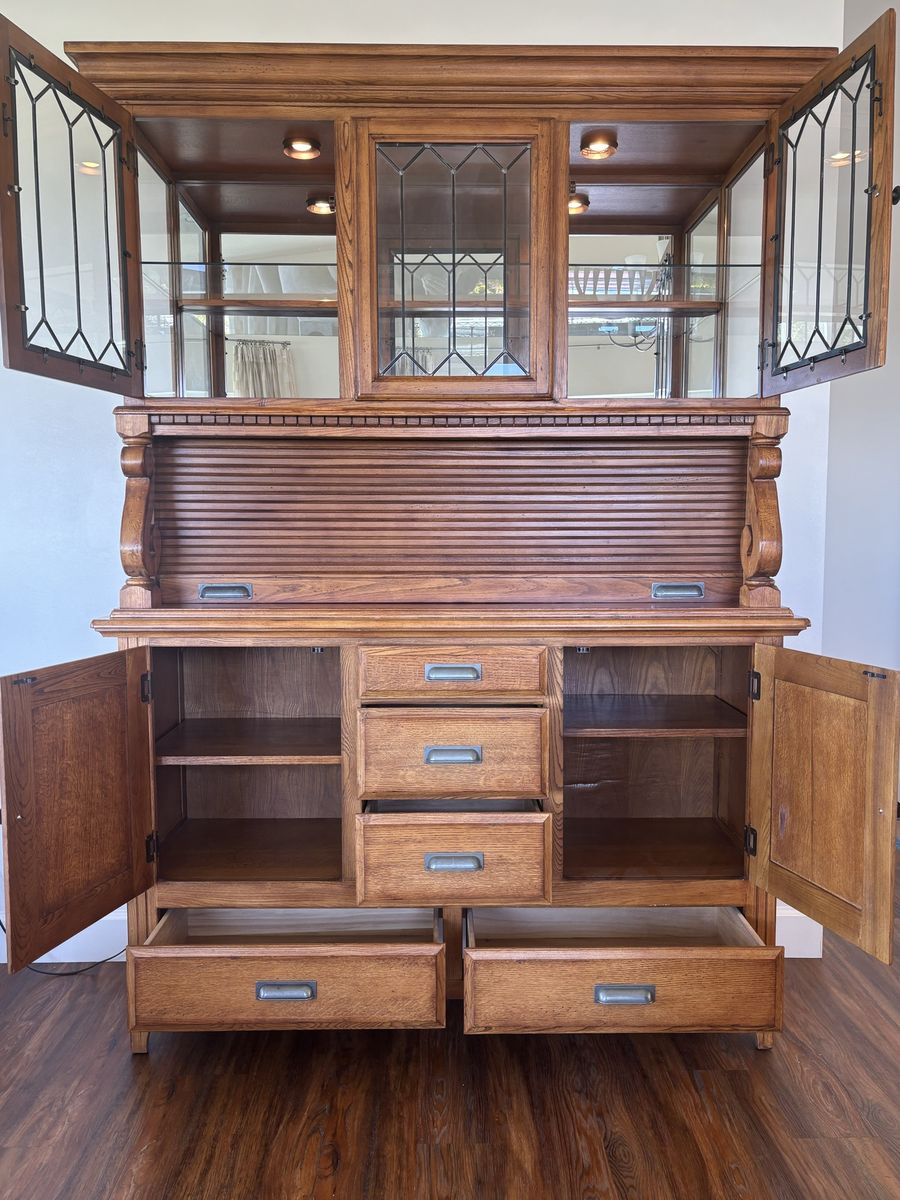 Warm oak in like-new condition. 60”wide x 83.5”high x 19.5”deep Top lighted cabinet with switch on the cord. 53”w x 15”d upper shelves - one glass, one wood - both with plate groves. Roll top front. Two removable organizers. Two cupboards with shelves. One small, two medium, and two large drawers. $100 cash Located above Weber State in Ogden. Must have loading help.