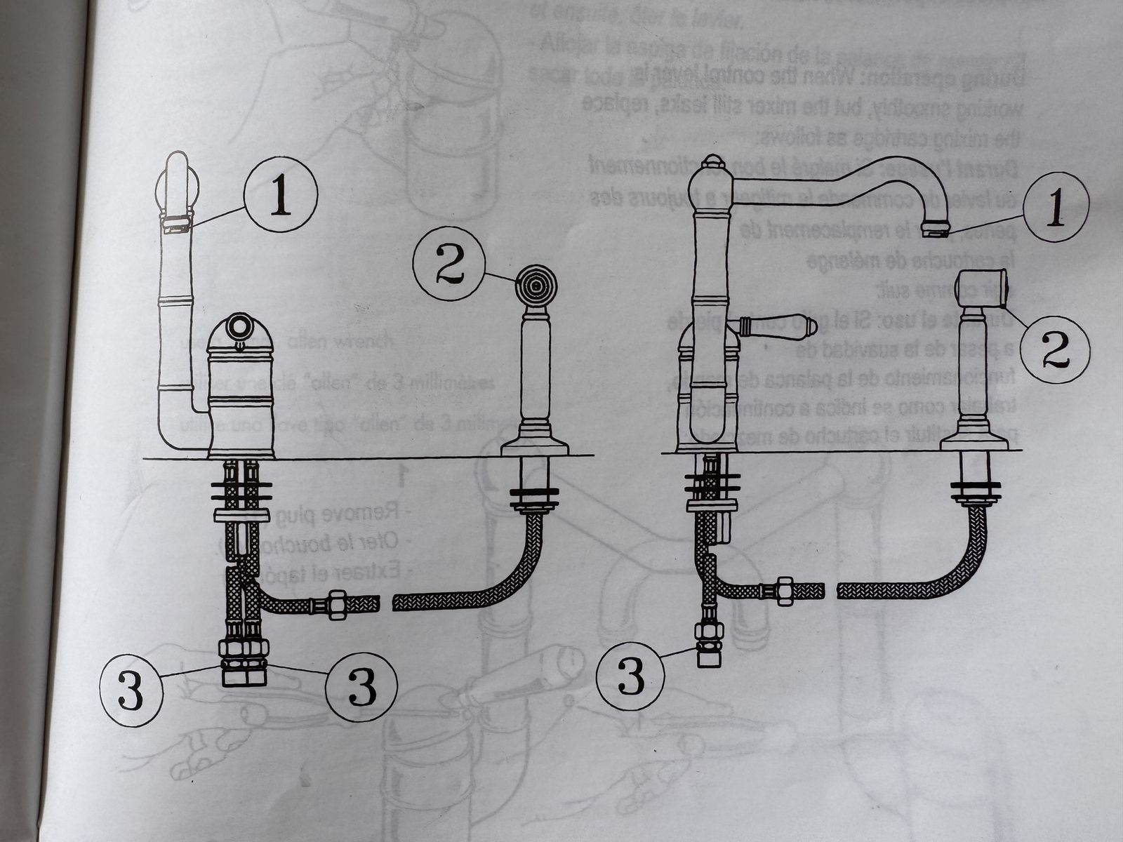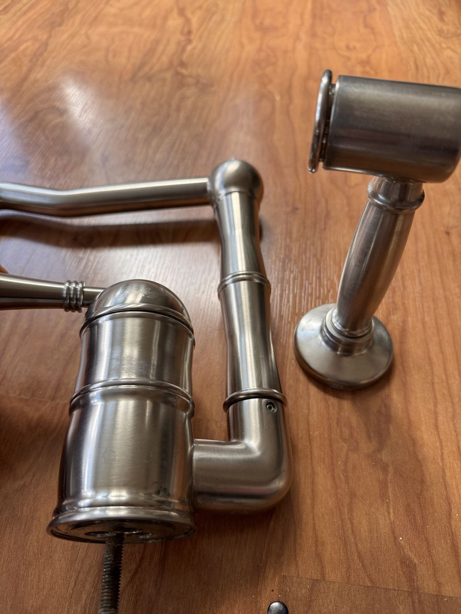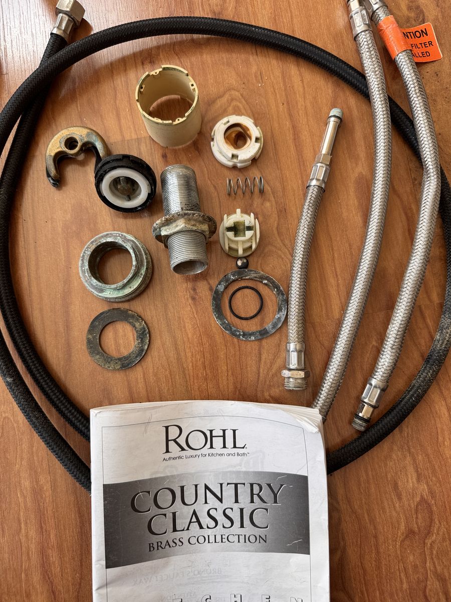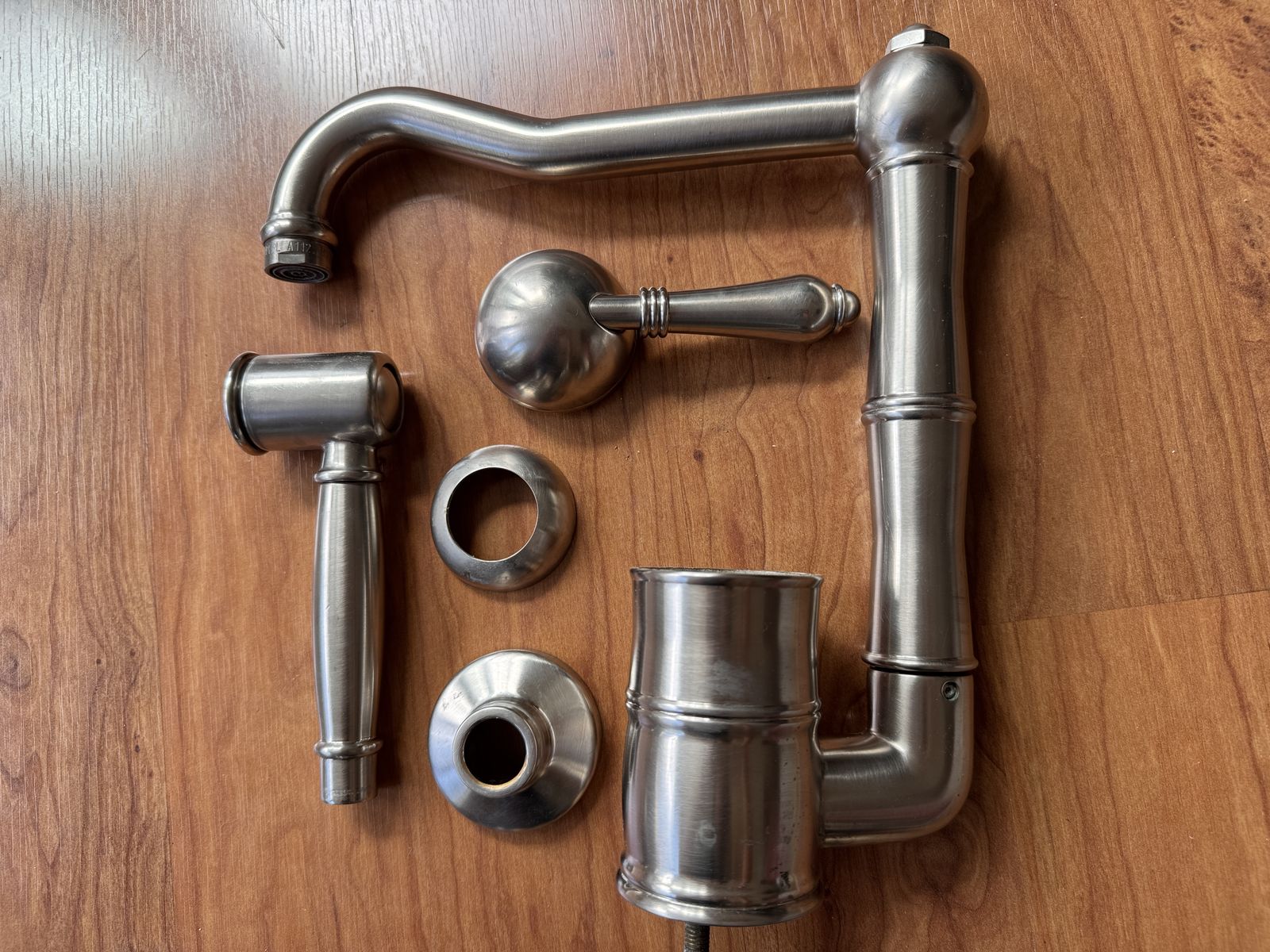 Authentic Rohl kitchen faucet in used clean polished condition. Worked great when it was in use. Might need some replacement washers and appropriate hoses. Comes with some of the parts in the one photo, some of them are for the other Rohl faucet we have for sale.