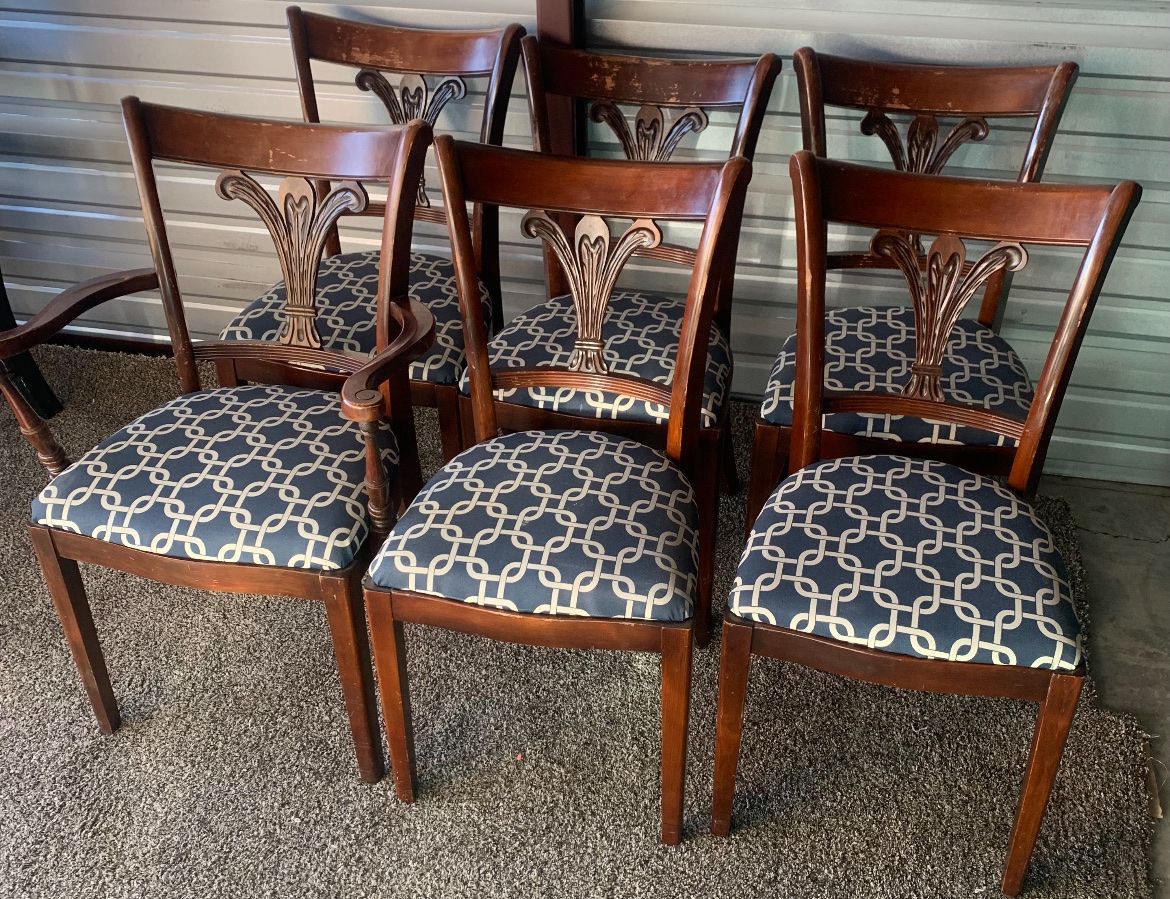 6 Tell City Mahogany Dining Chairs. These are in the very rare FLUER DE LUER BACK Style Chairs. They have the Tell City Label Showing #4620 and Finished in the Mahogany 27. These chairs are in very good condition with normal wear from age and use. Finish still looks great but you will see a blemish here and there. Very minor scratches here or there, all normal for age and use. The seats are all clean and no stains. 100.00 per chair Beautiful set, these are the chairs for you