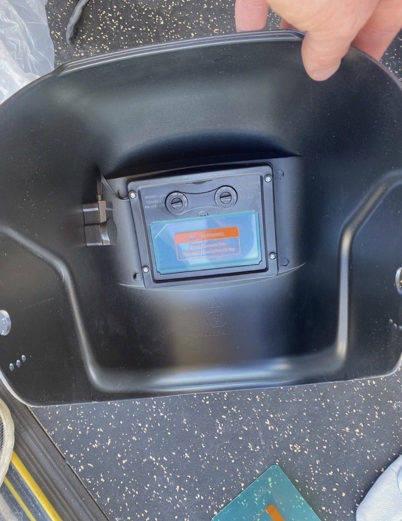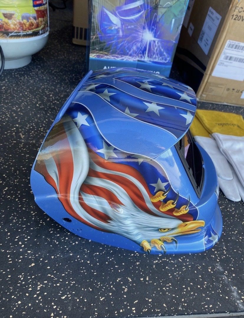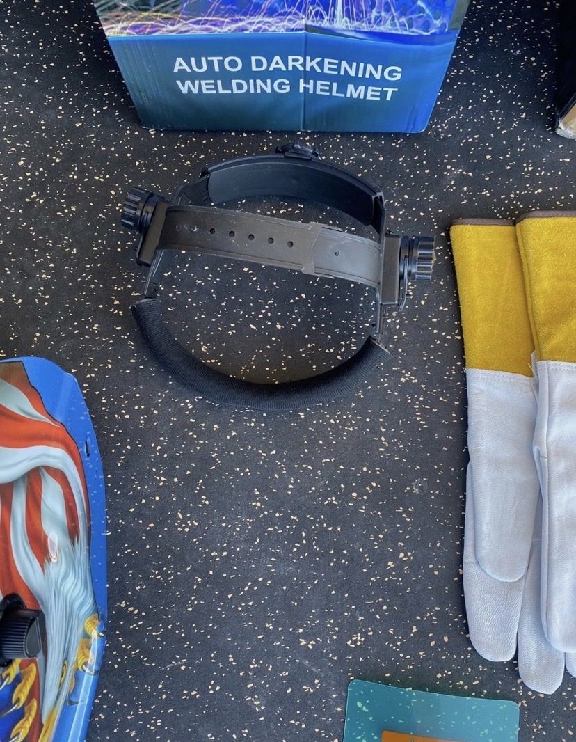 ApplePaywelding helmet is auto-darkening, and have adjustable head gear. Shade can be adjusted from 9-13 with knob on left side of helmet. Battery allows auto-darkening to work even if it hasn't been in the sun long enough.