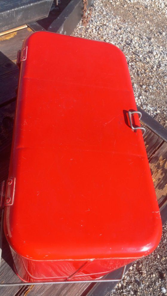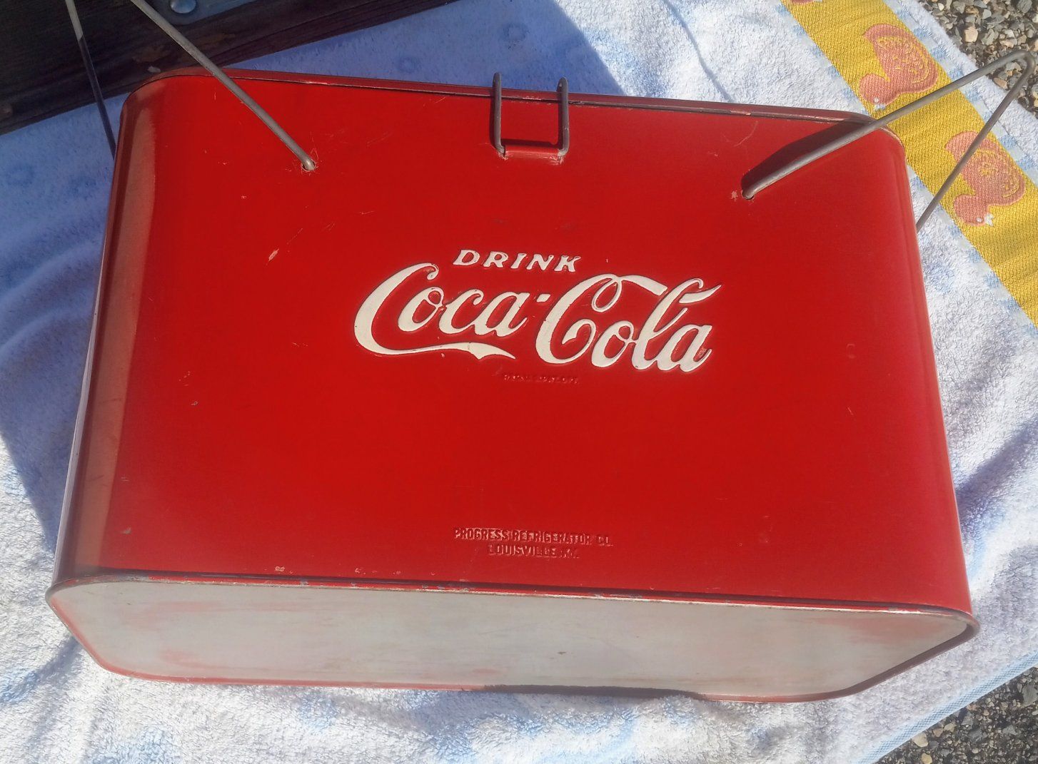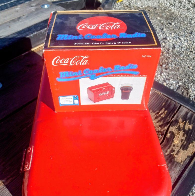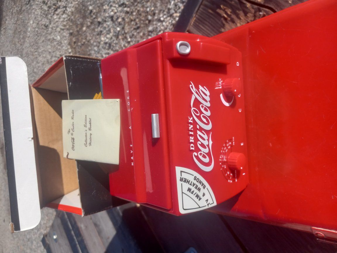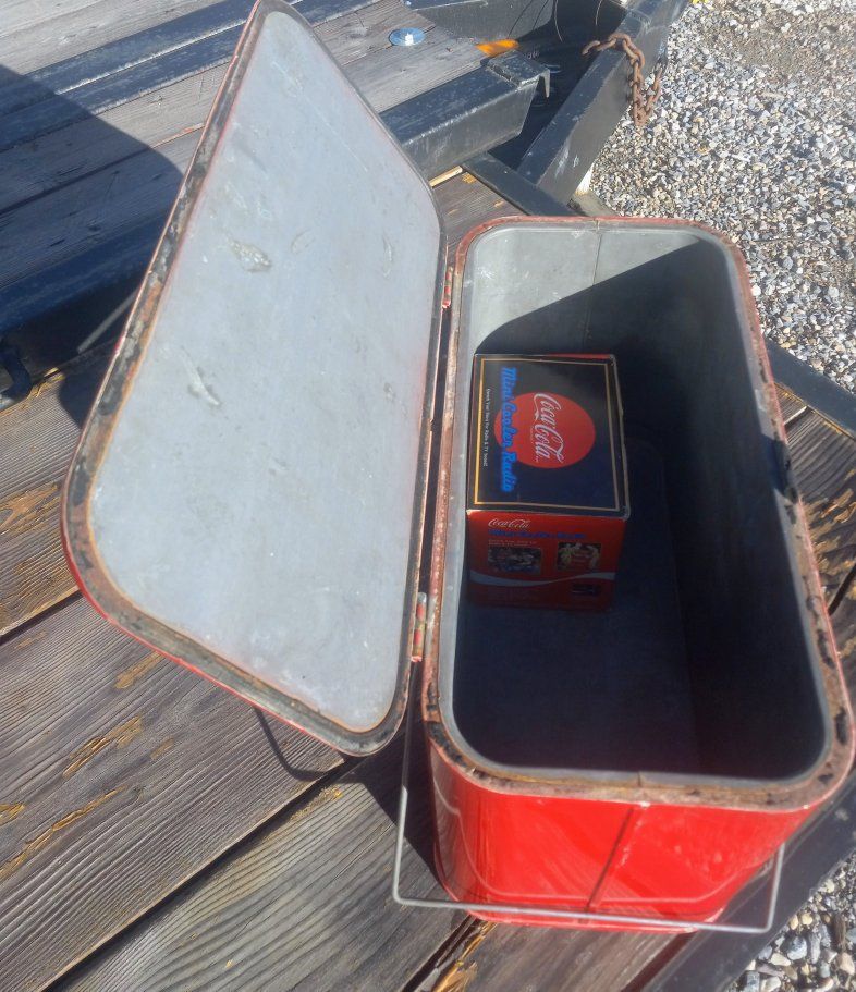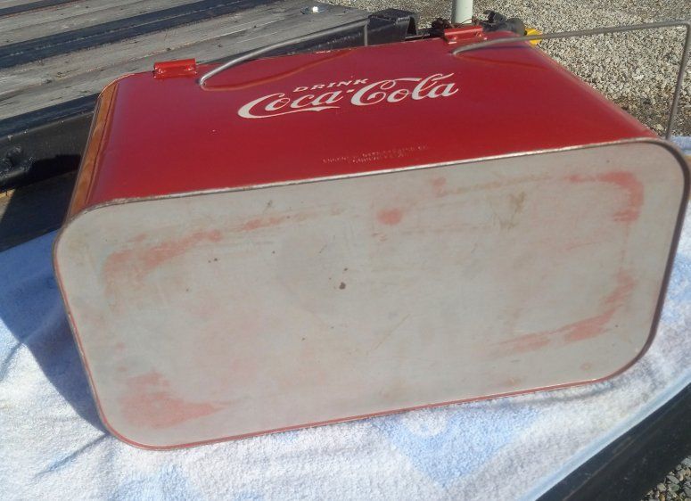 this is the harder to find Coca-Cola picnic cooler. it is an excellent shape with a couple of small dents in the top where the handles hit it. no rush at all. it comes with a AM/FM collectible Coca-Cola radio that is still in the box. 12 in high 18 in wide and about 10 inches deep. the rubber gasket seal needs to be replaced. going to be hard to find a nicer original one. $225.00