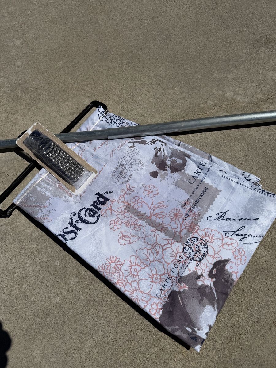 Brand new travel themed shower curtain. Gray white and coral. Includes rings and rod
