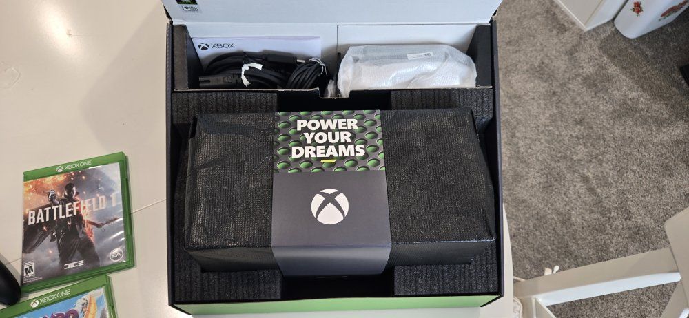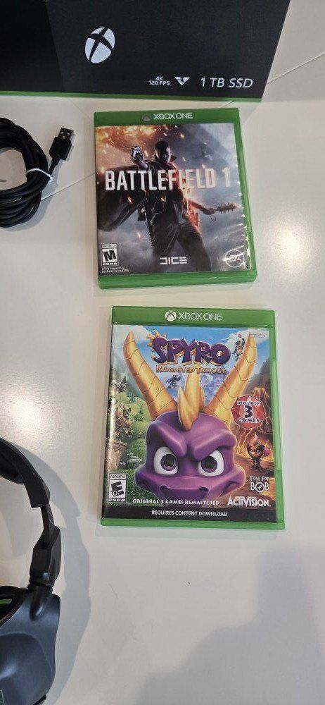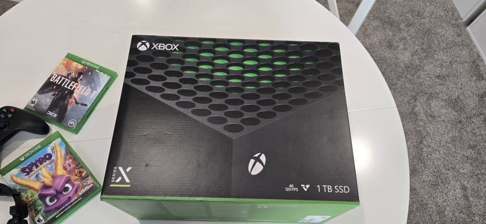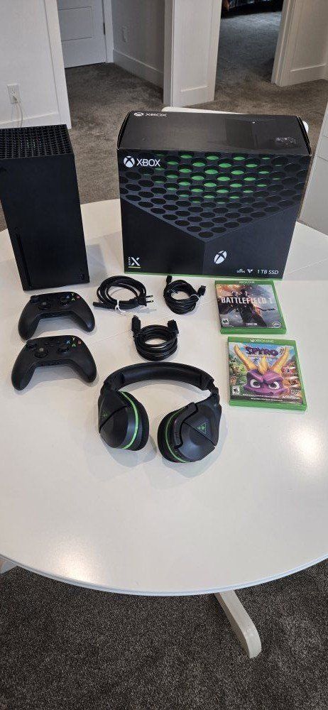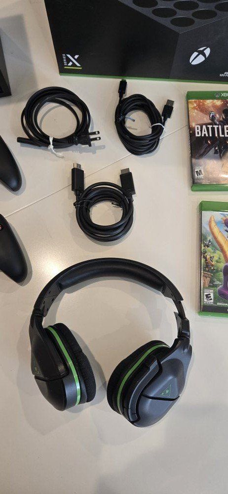 VenmoXbox series X in great condition! I haven't had any issues with it. Here is what is included: -Xbox Series X (Original packaging) -2 controllers (one has stick drift) rechargeble battery (already installed in good controller) -Turtle Beach Headset (Recon 200 I think) Which is wireless and noise cancelling. -Battlefield I game. -Spyro Trilogy game. -All necessary cables.