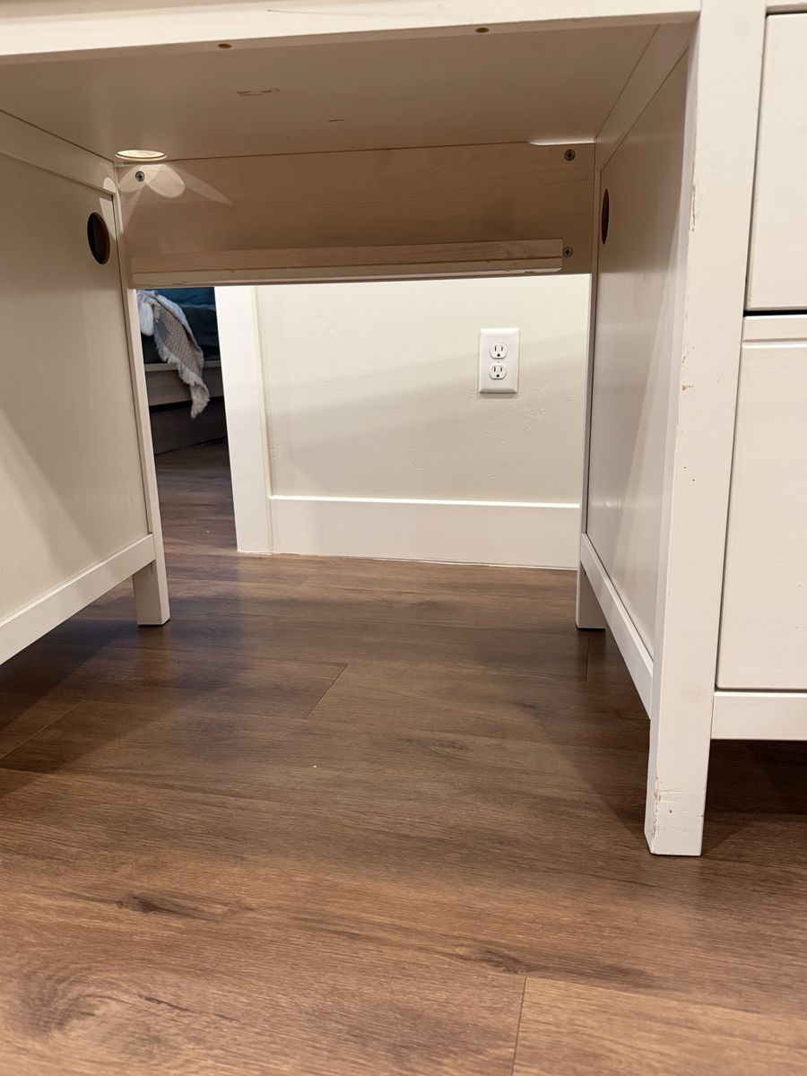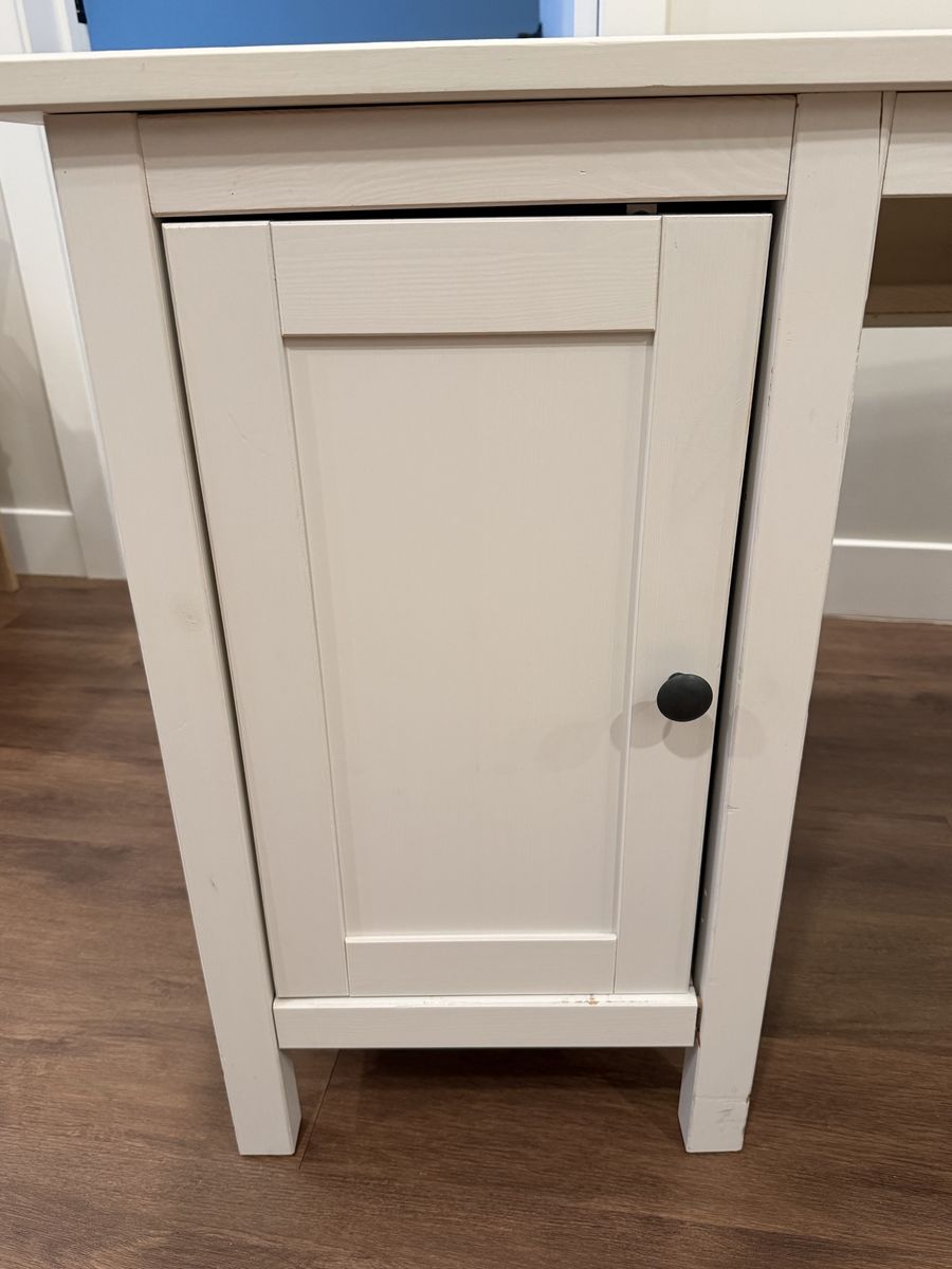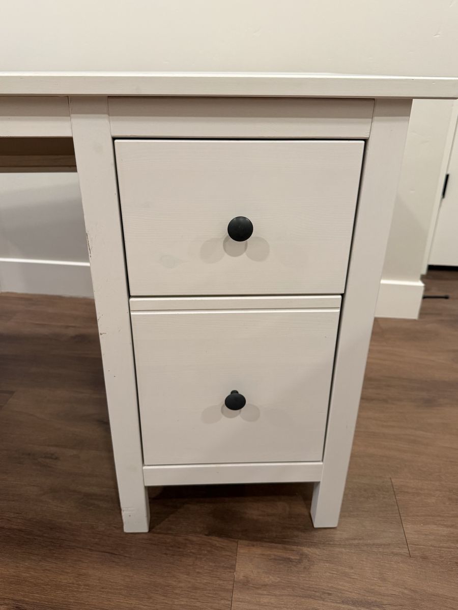 This is a solid wood and paintable offering from IKEA, the HEMNES desk. Ive had it for about 7 years, it came with me from Texas. It needs some TLC (a loose joint, minor crack and scuffs), but nothing some wood glue and a new coat of paint wouldn’t fix.