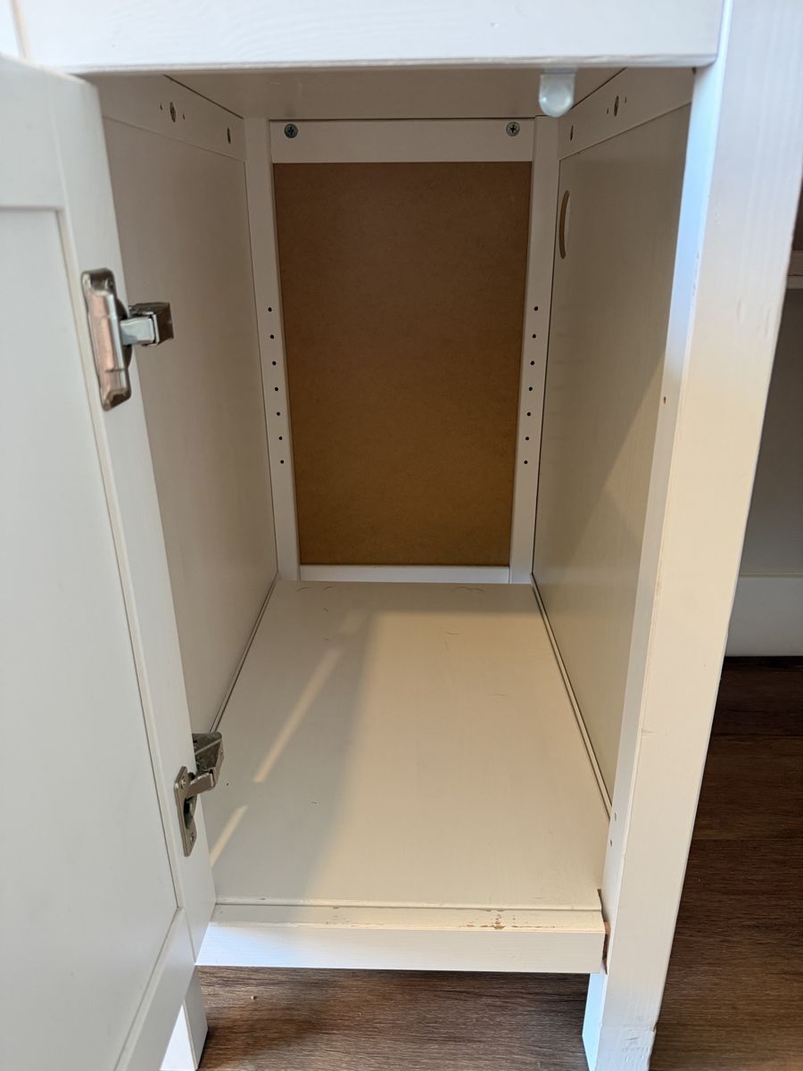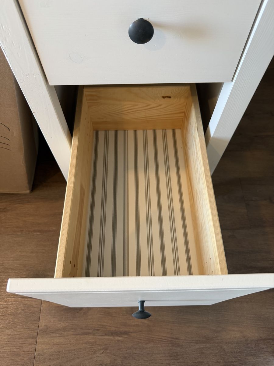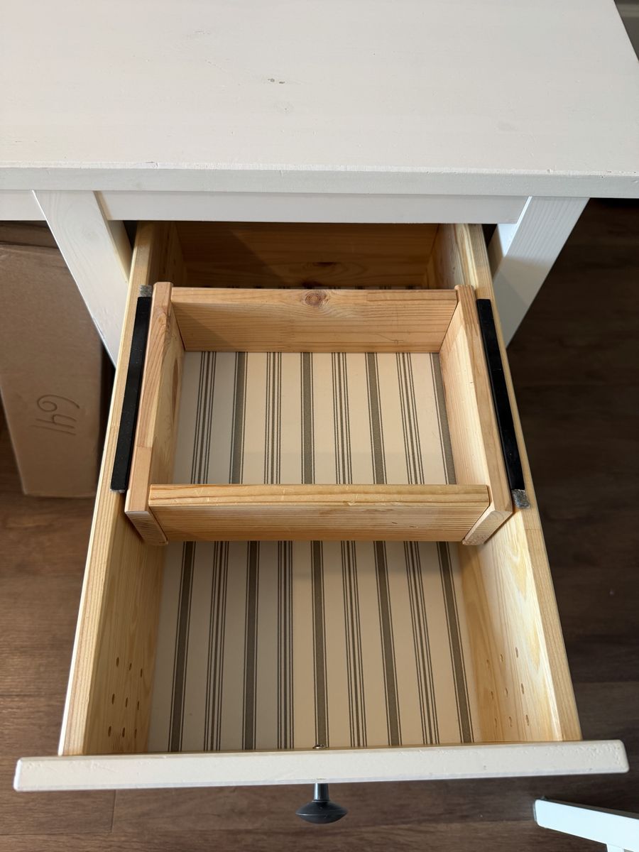 This is a solid wood and paintable offering from IKEA, the HEMNES desk. Ive had it for about 7 years, it came with me from Texas. It needs some TLC (a loose joint, minor crack and scuffs), but nothing some wood glue and a new coat of paint wouldn’t fix.