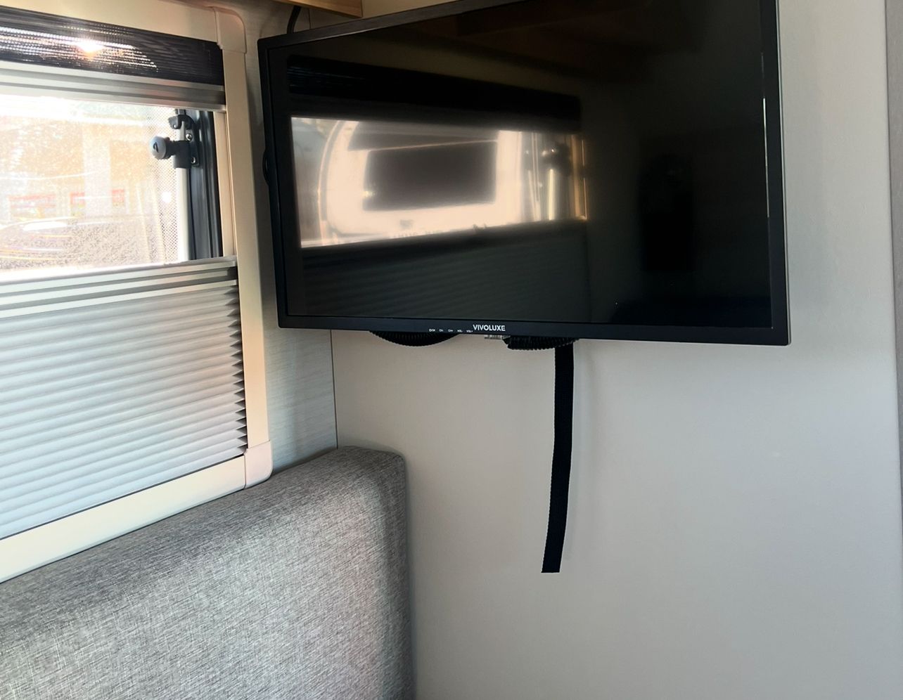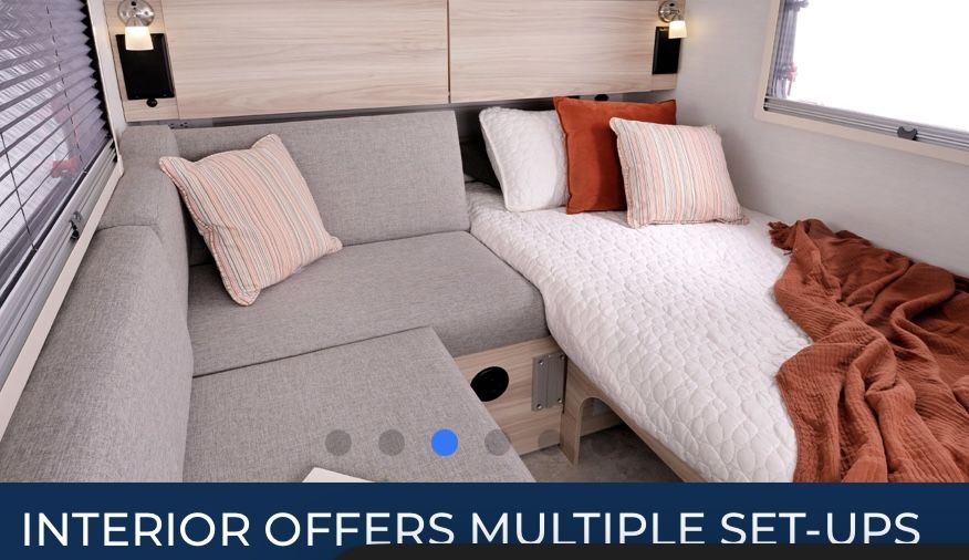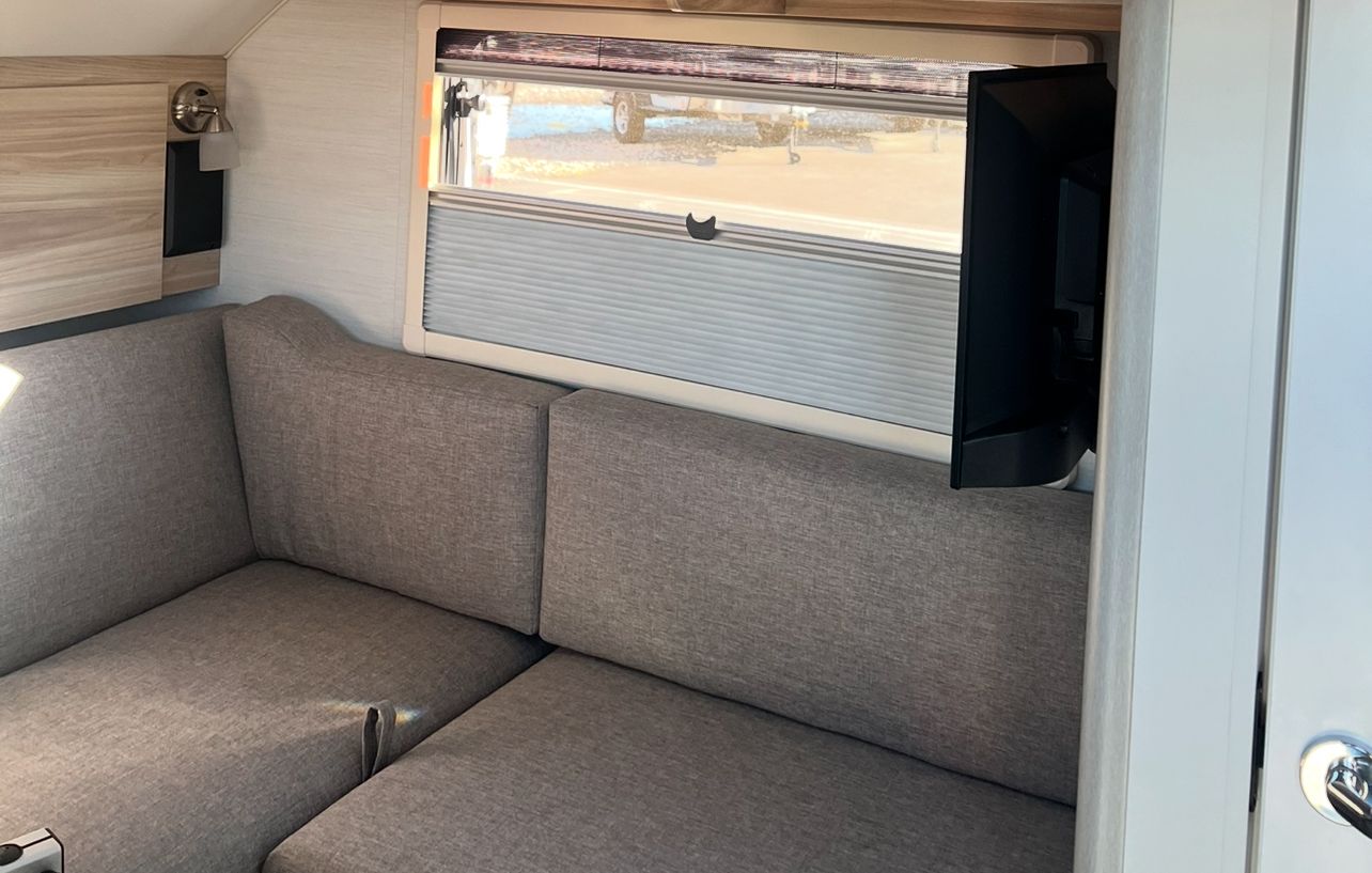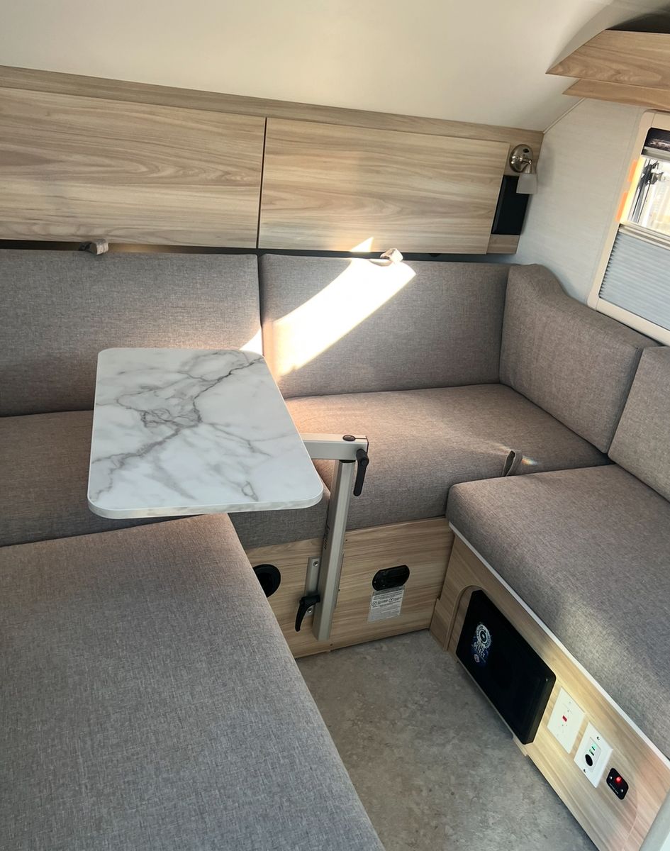 Interior ComfortsPremium soft-close Amish-crafted cabinetry Alde heating and hot water system for year-round comfort Central A/C and power roof fan for climate control U-shaped dinette converts into a roomy sleeping area Bluetooth media center with 19” TV Side porthole windows and panoramic front window for bright, open views
