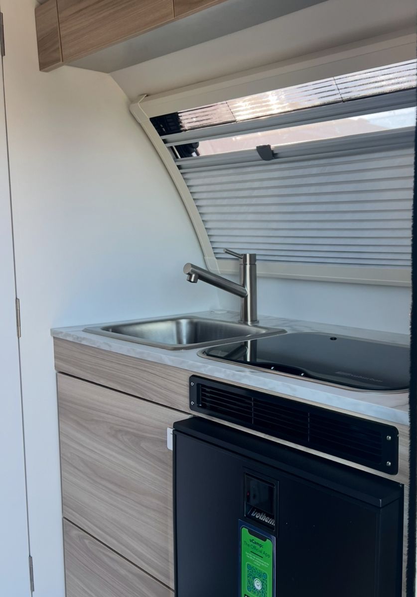 Fully Equipped Kitchen & Bath2-burner glass-top stove, stainless steel sink, and 12V compressor refrigerator